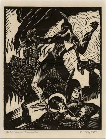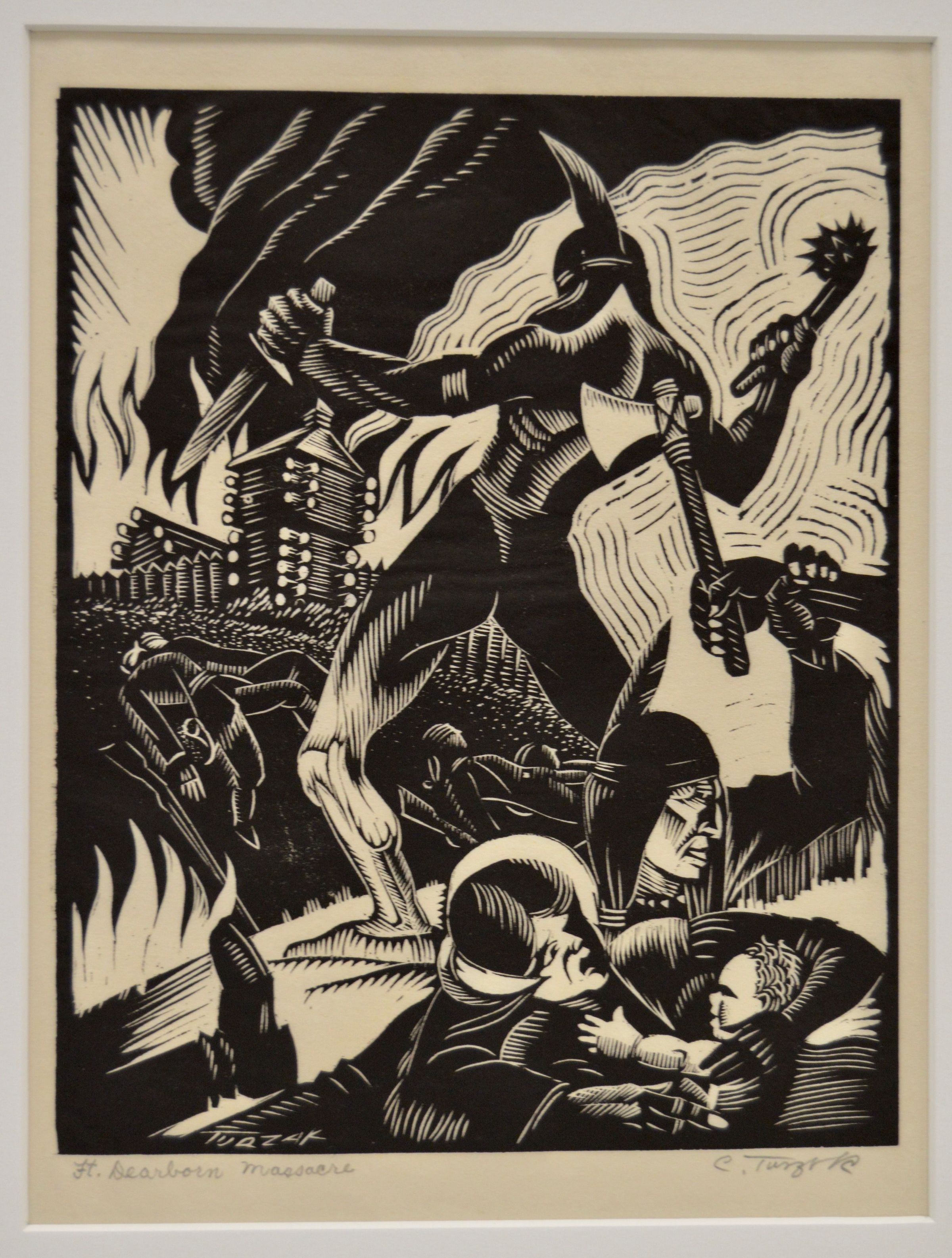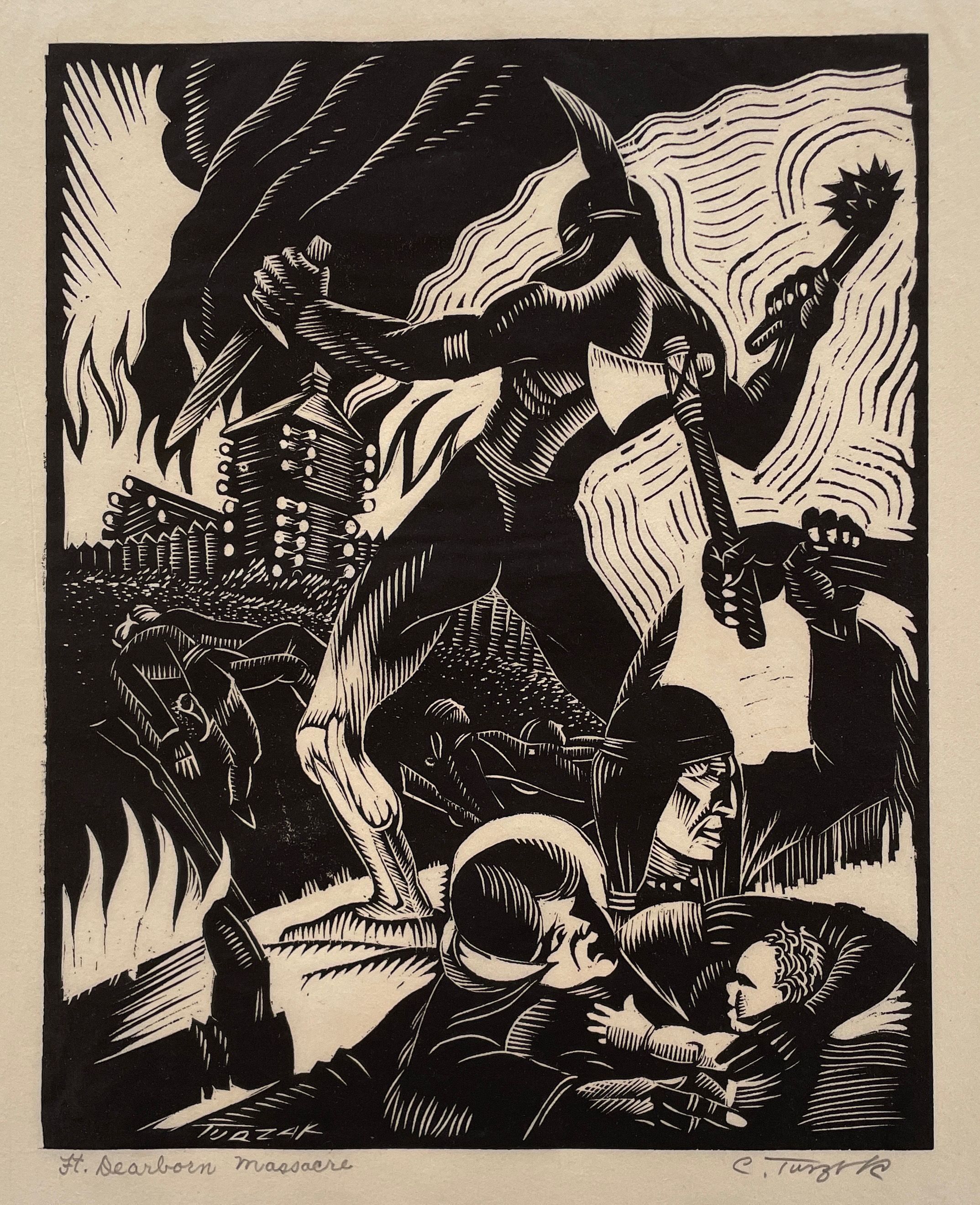 A Native American warrior holding a mace in one hand and a knife in the other stands over two dead men as the fort burns in the background a column of smoke rising from the structure. Another Native American Warrior has taken hold of a mother and child with one arm and is blocking a blow from an axe with the other. Stylized representation; printed with black ink. signed C. Turzak in lower right no edition #Collection