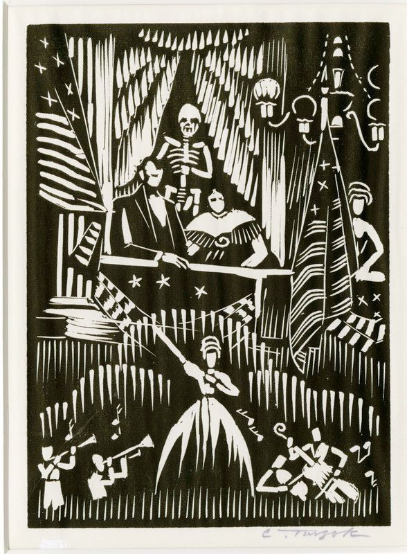 Lincoln sits with wife in balcony watching a performance a skeleton stands behind the couple below them a woman sings while several other musicians play their instrumentsprinted in black ink1933 by Charles Turzak" Printed in the United States at Chicago 1933 during 'A Century of Progress Exposition'"Collection