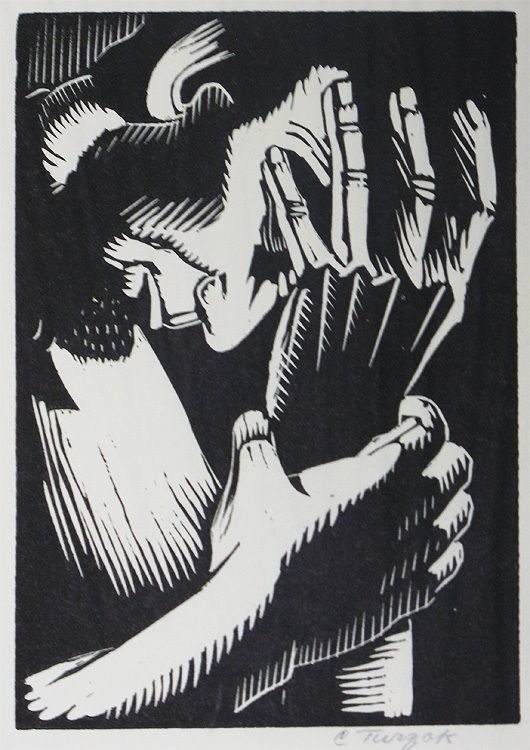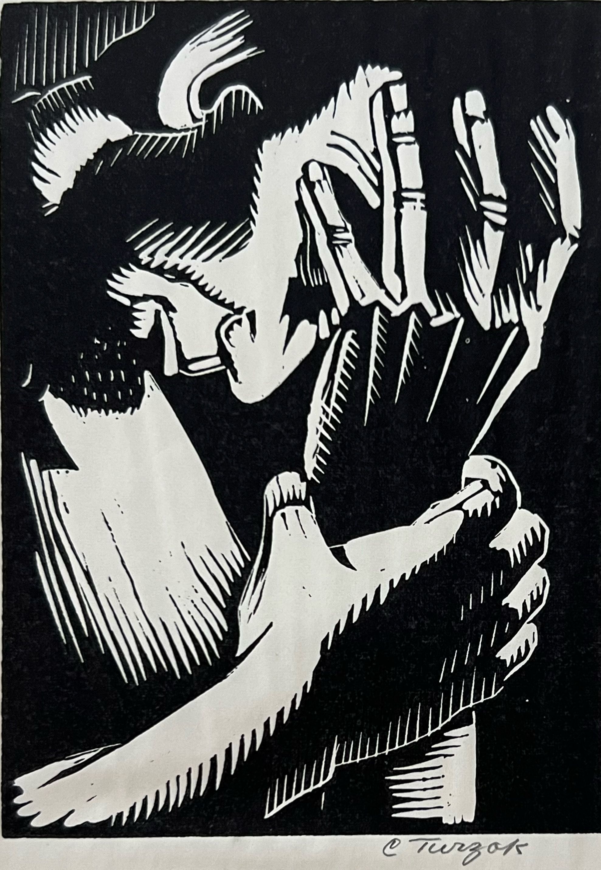 We see a side view of Lincoln bent over his left hand on his forehead his right hand grasping his left wristprinted in black ink initialed CT in loewr left corner1933 by Charles Turzak" Printed in the United States at Chicago 1933 during 'A Century of Progress Exposition'"Collection