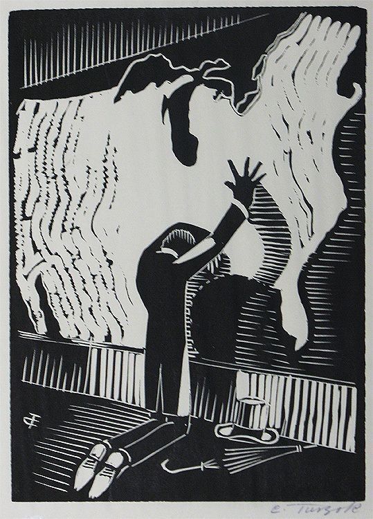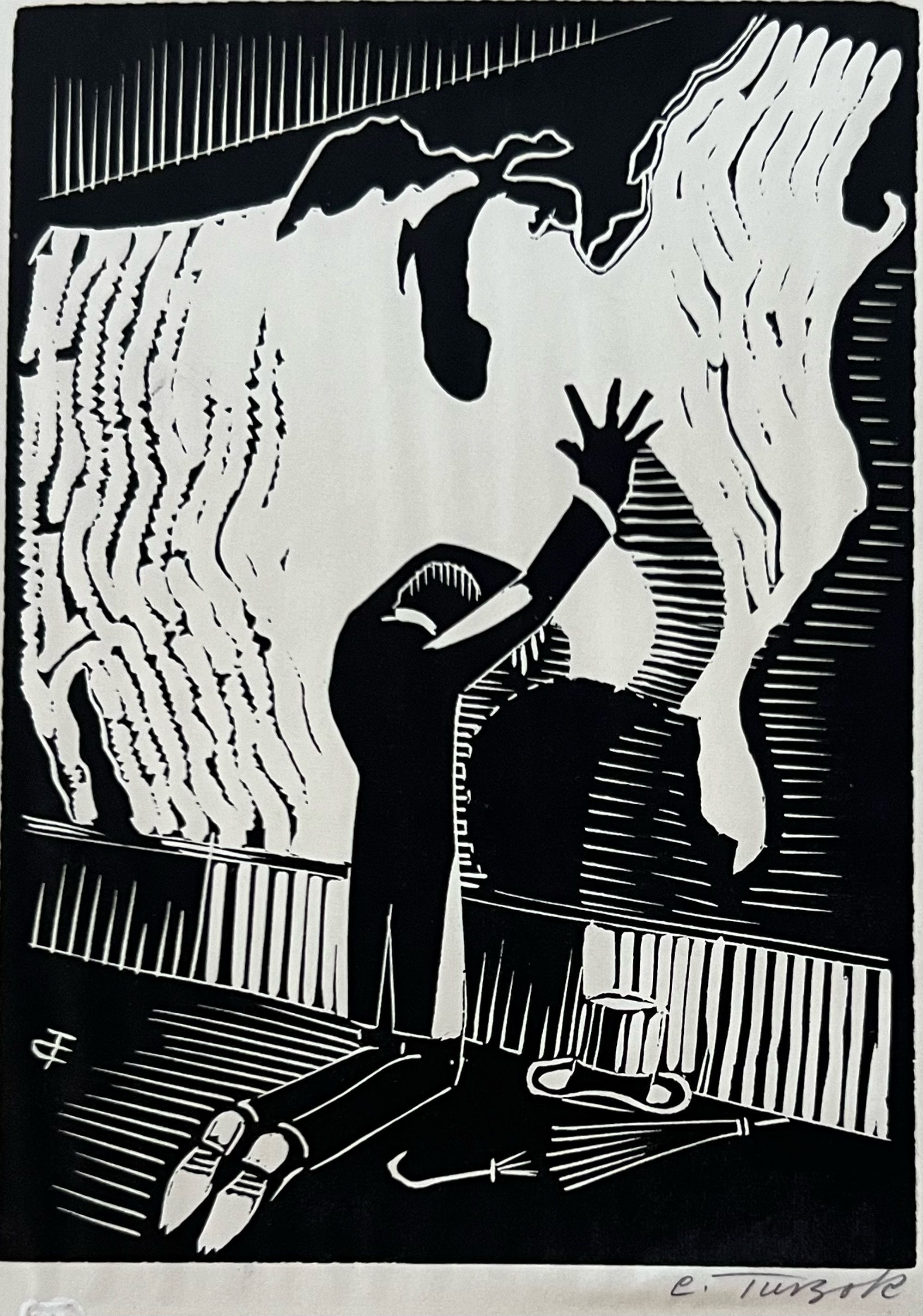 Lincoln kneels in front of a map of the United states his head in his left arm his right arm on the map. His hat and umbrella are on the floor beside him to his rightprinted in black ink initialed CT in left corner1933 by Charles Turzak" Printed in the United States at Chicago 1933 during 'A Century of Progress Exposition'"Collection