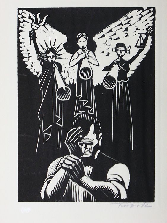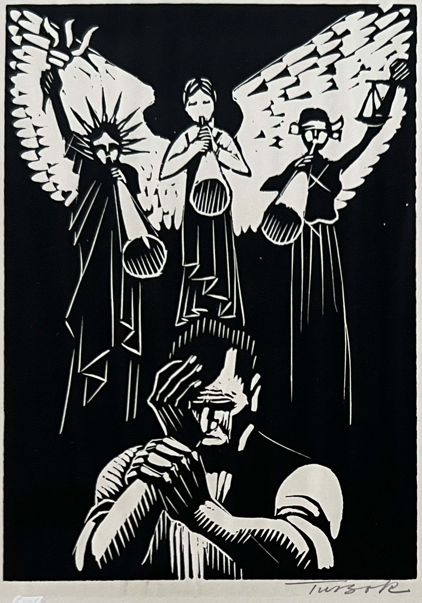 Lincoln faces viewer his head in his palm while representations of Justice liberty and faith trumpet in the background printed in black ink no signature1933 by Charles Turzak" Printed in the United States at Chicago 1933 during 'A Century of Progress Exposition'"Collection