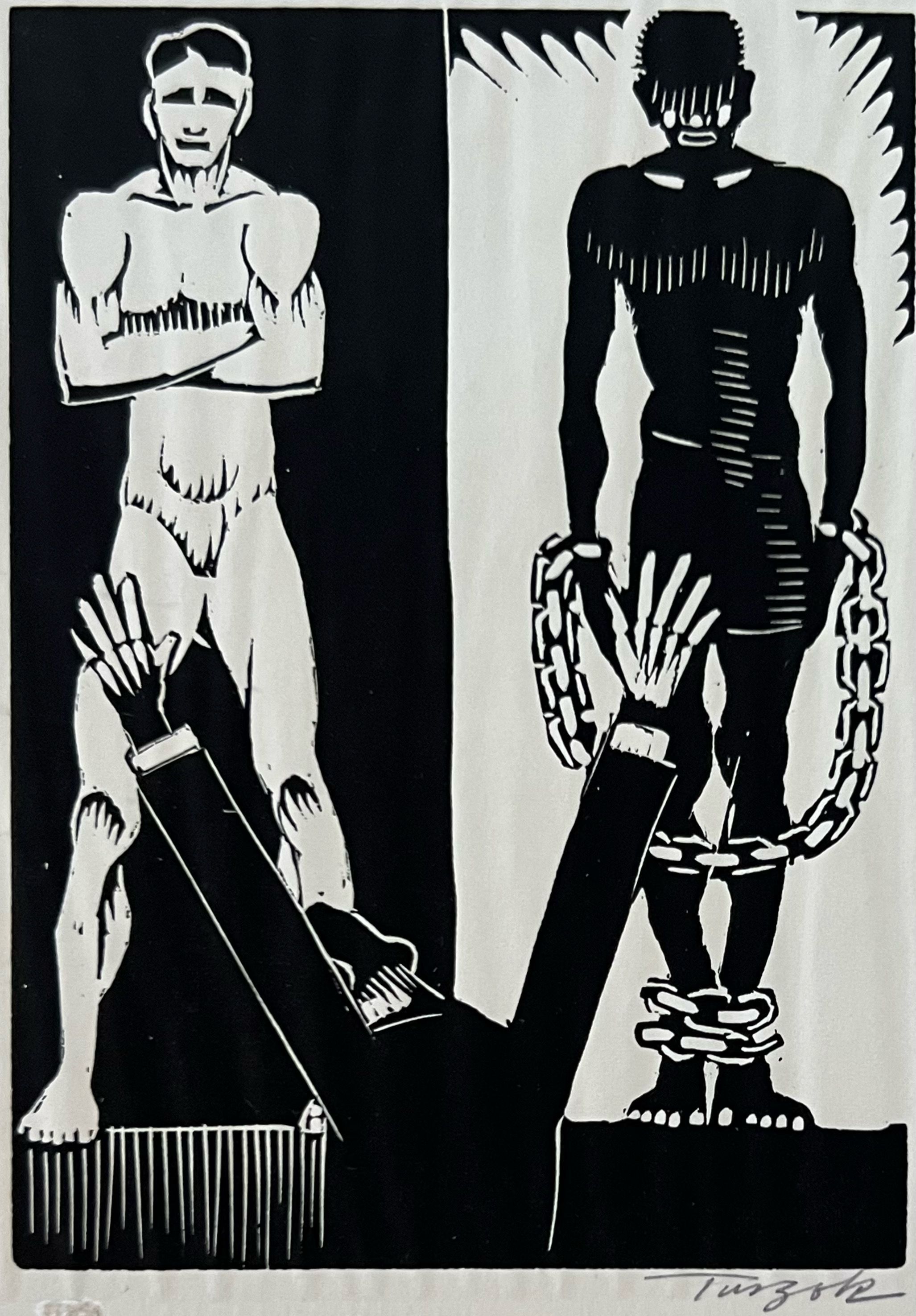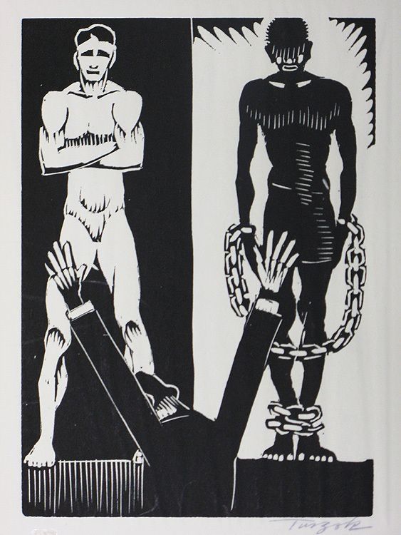 Man stands with back to viewer in front of two men one white standing with arms crossed the other black with hands and feet in shacklesprinted in black ink no signature1933 by Charles Turzak" Printed in the United States at Chicago 1933 during 'A Century of Progress Exposition'"Collection