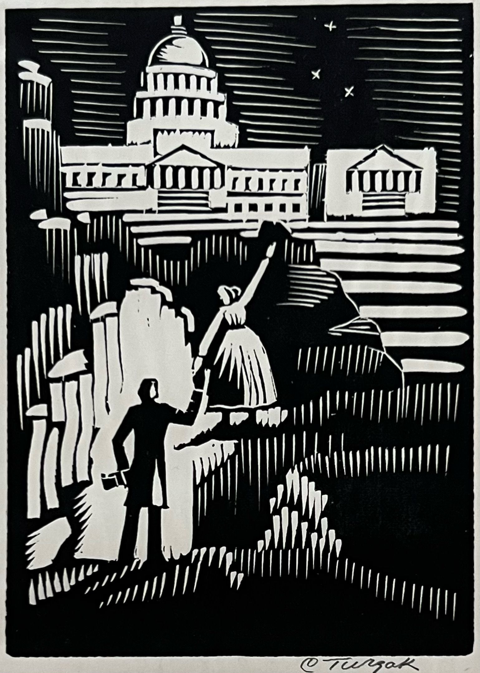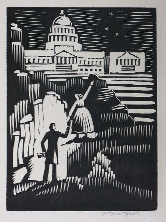 Image of man and woman climbing up mountain in the background there is the capitol buildingprinted in black ink no signature1933 by Charles Turzak" Printed in the United States at Chicago 1933 during 'A Century of Progress Exposition'"Collection