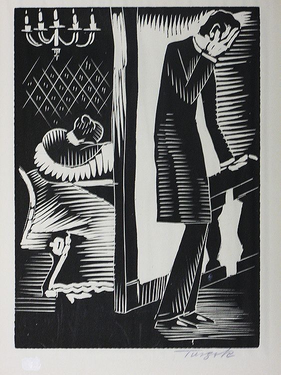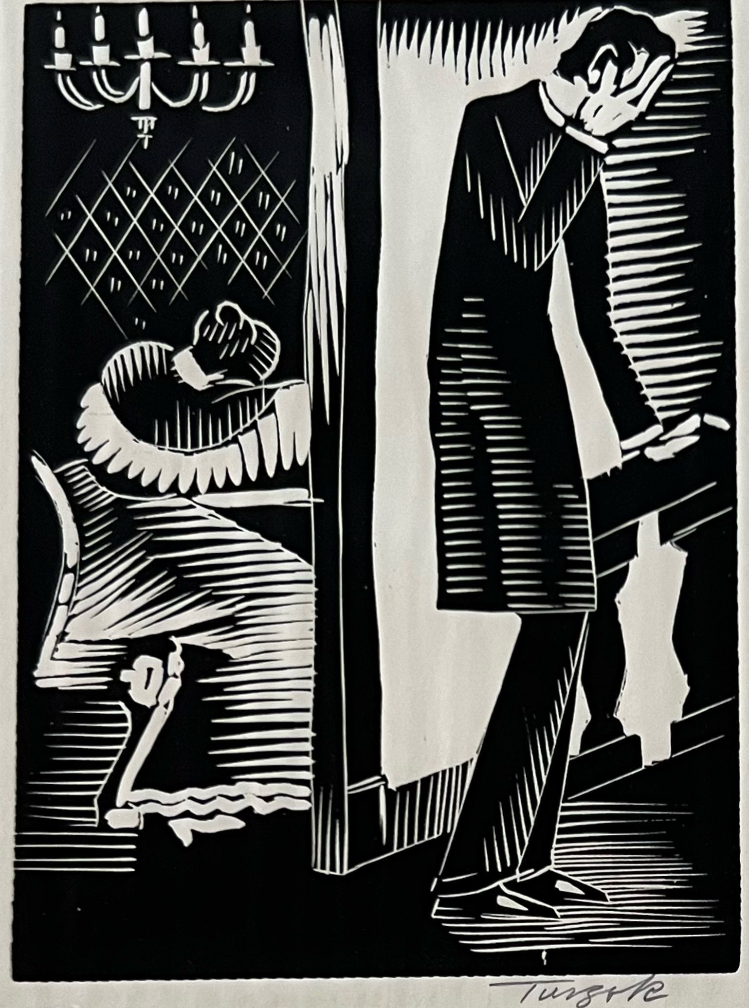 Woman in interior room head on her arm sitting at table Lincoln stands ouside door of room face in hands back bentprinted in black ink no signature1933 by Charles Turzak" Printed in the United States at Chicago 1933 during 'A Century of Progress Exposition'"Collection