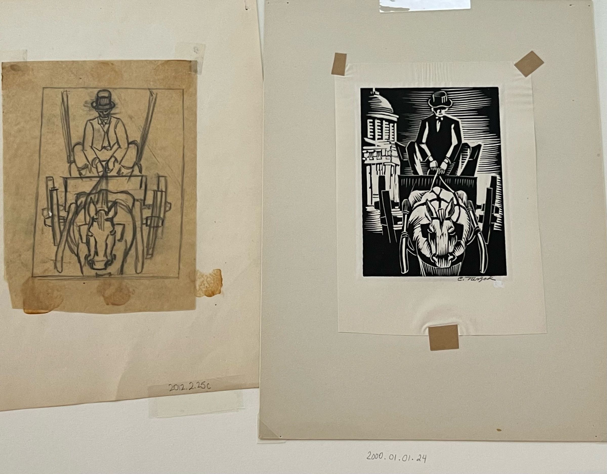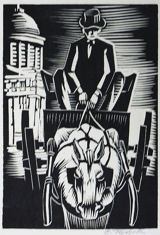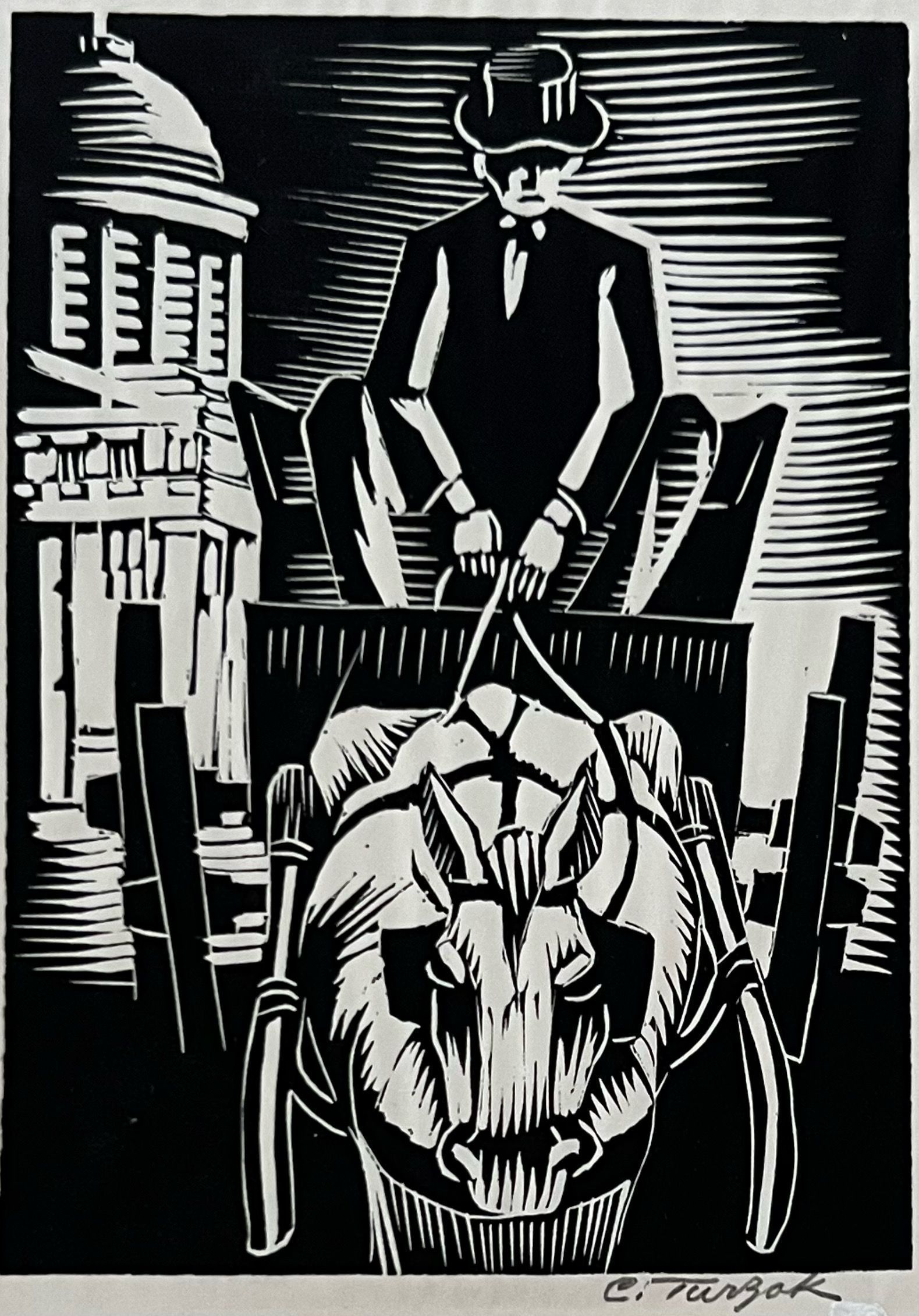 A man in a top hat riding a carriage pulled by a horse (fore-shortened view of horse) domed building in the backgroundprinted in black ink no signature1933 by Charles Turzak" Printed in the United States at Chicago 1933 during 'A Century of Progress Exposition'"Collection