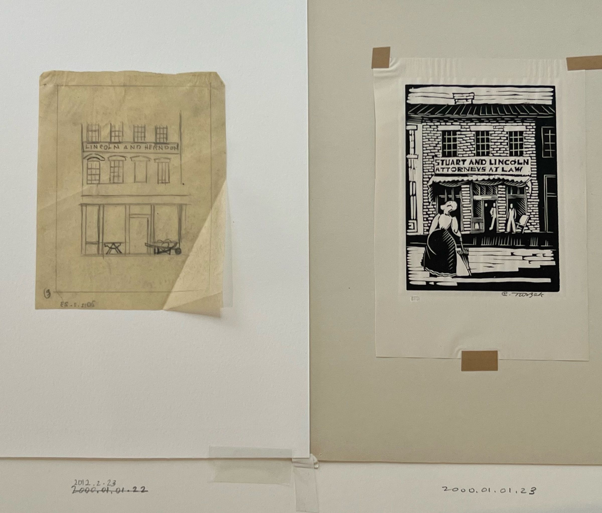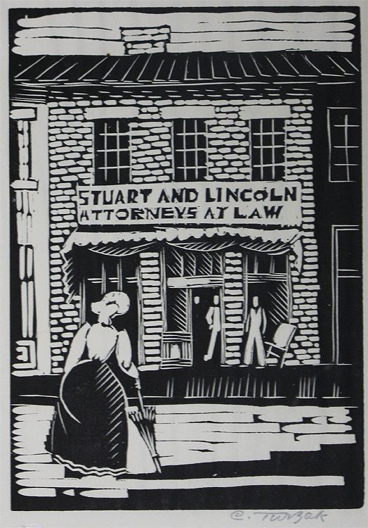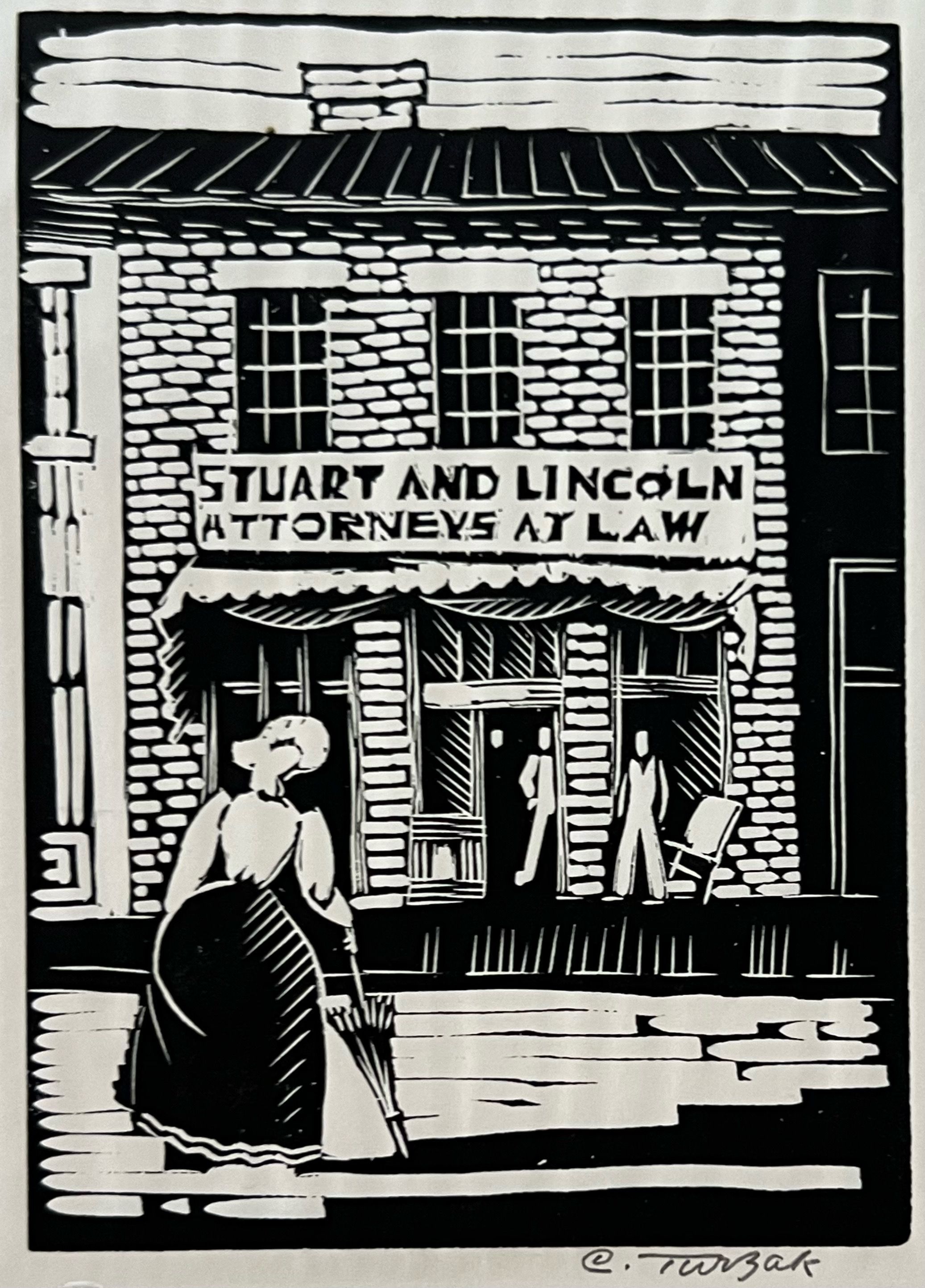 Woman with umbrella in the foreground building with a sign reading "Stuart and Lincoln Attorneys at Law" in the backgroundprinted in black ink no signature1933 by Charles Turzak" Printed in the United States at Chicago 1933 during 'A Century of Progress Exposition'"Collection
