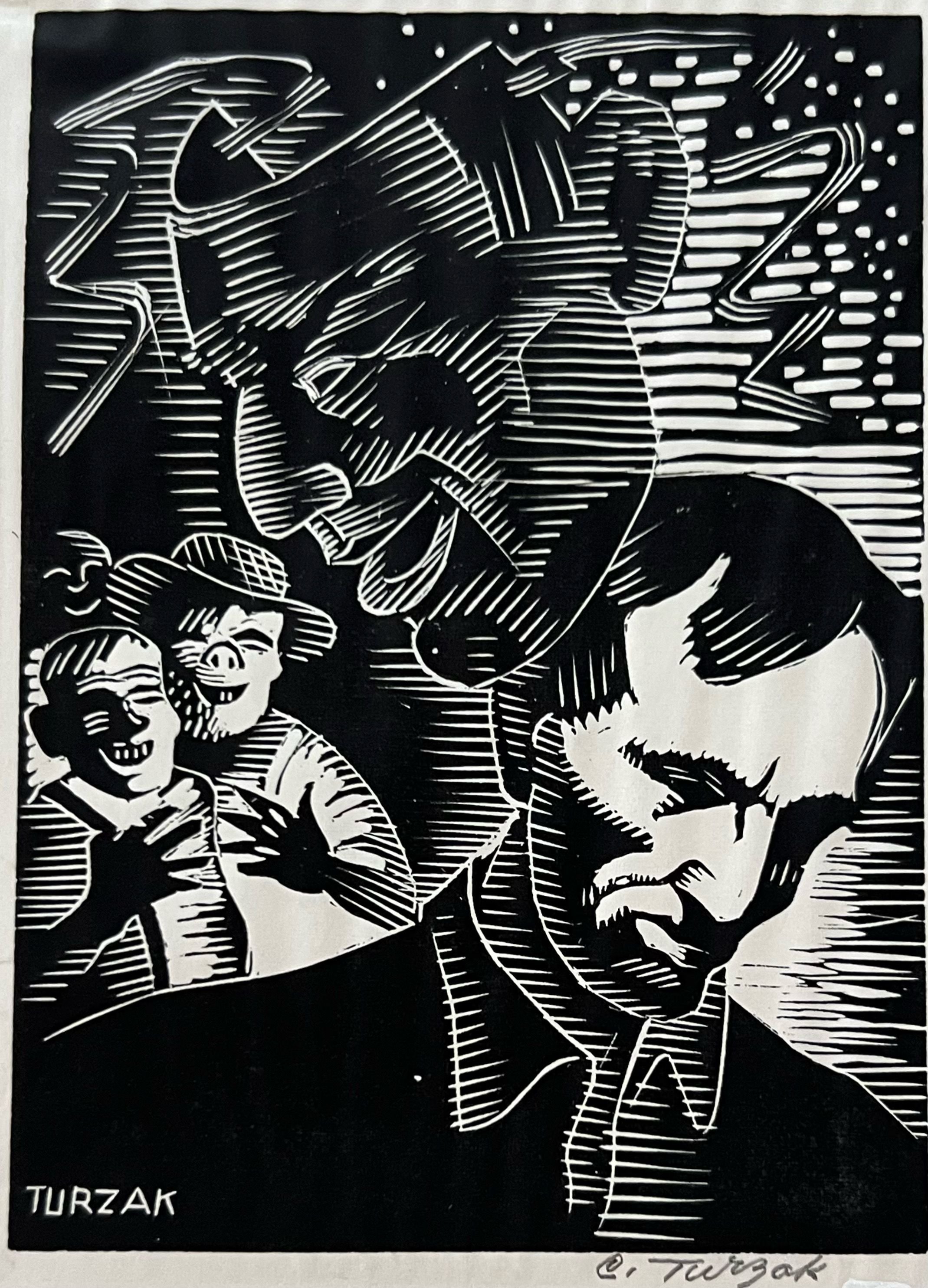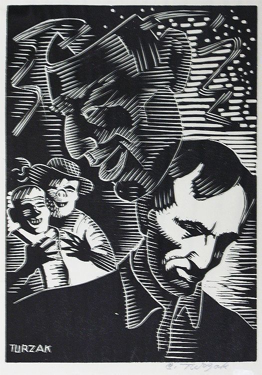 Abe looks down in the lower right corner image of mask superimposed above him in the background there are two men laughingprinted in black ink signed Turzak in lower left1933 by Charles Turzak" Printed in the United States at Chicago 1933 during 'A Century of Progress Exposition'"Collection