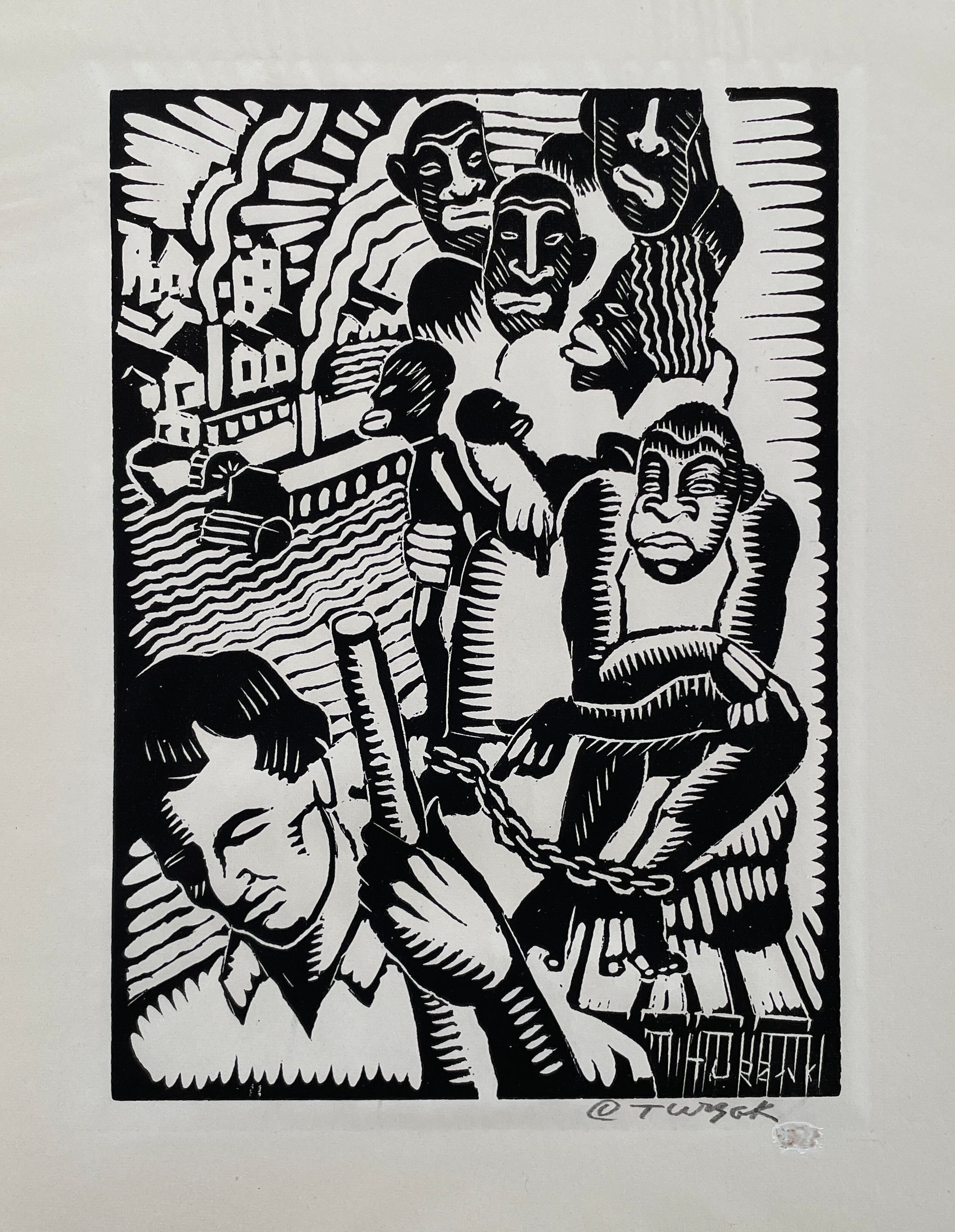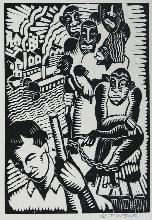 Viewer sees Abe in the lower left corner looking down behind him are several chattel slaves. All figures are on a barge in the background there is a cityscape and two paddle boats.printed in black ink signed Turzak in lower left corner1933 by Charles Turzak" Printed in the United States at Chicago 1933 during 'A Century of Progress Exposition'"Collection