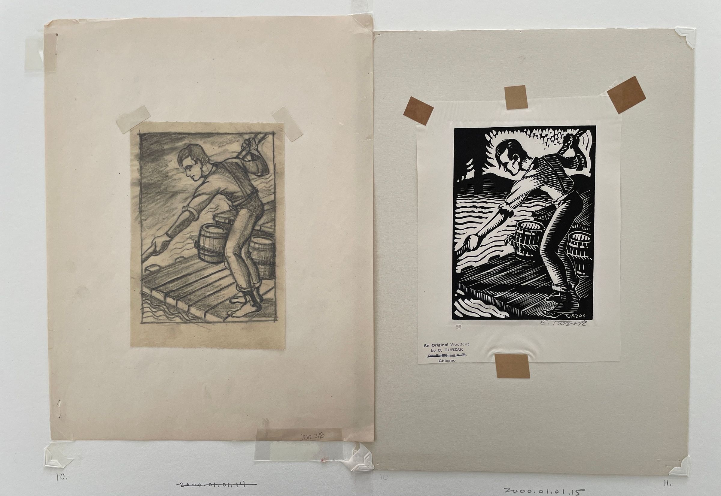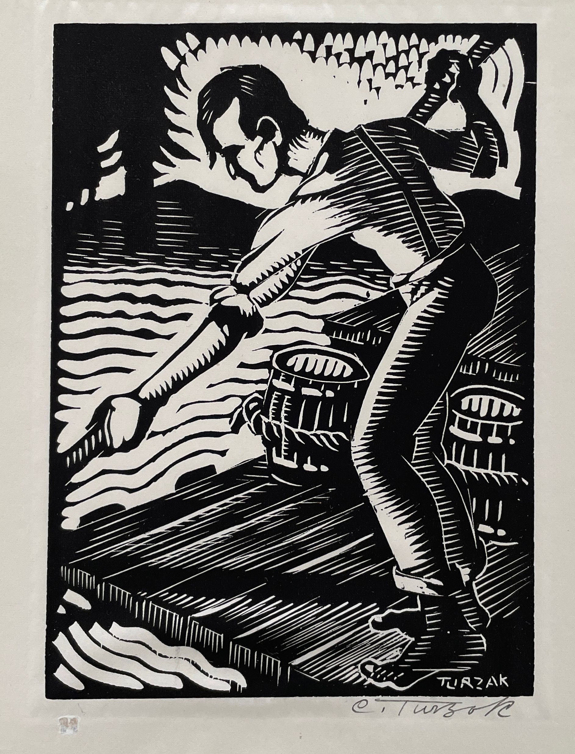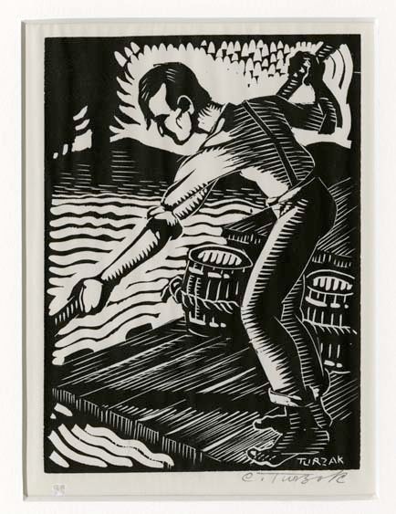 A figure stands on a barge bent over holding a pole that he's using to move himself along the river.printed in black ink signed Turzak lower right corner1933 by Charles Turzak" Printed in the United States at Chicago 1933 during 'A Century of Progress Exposition'"Collection