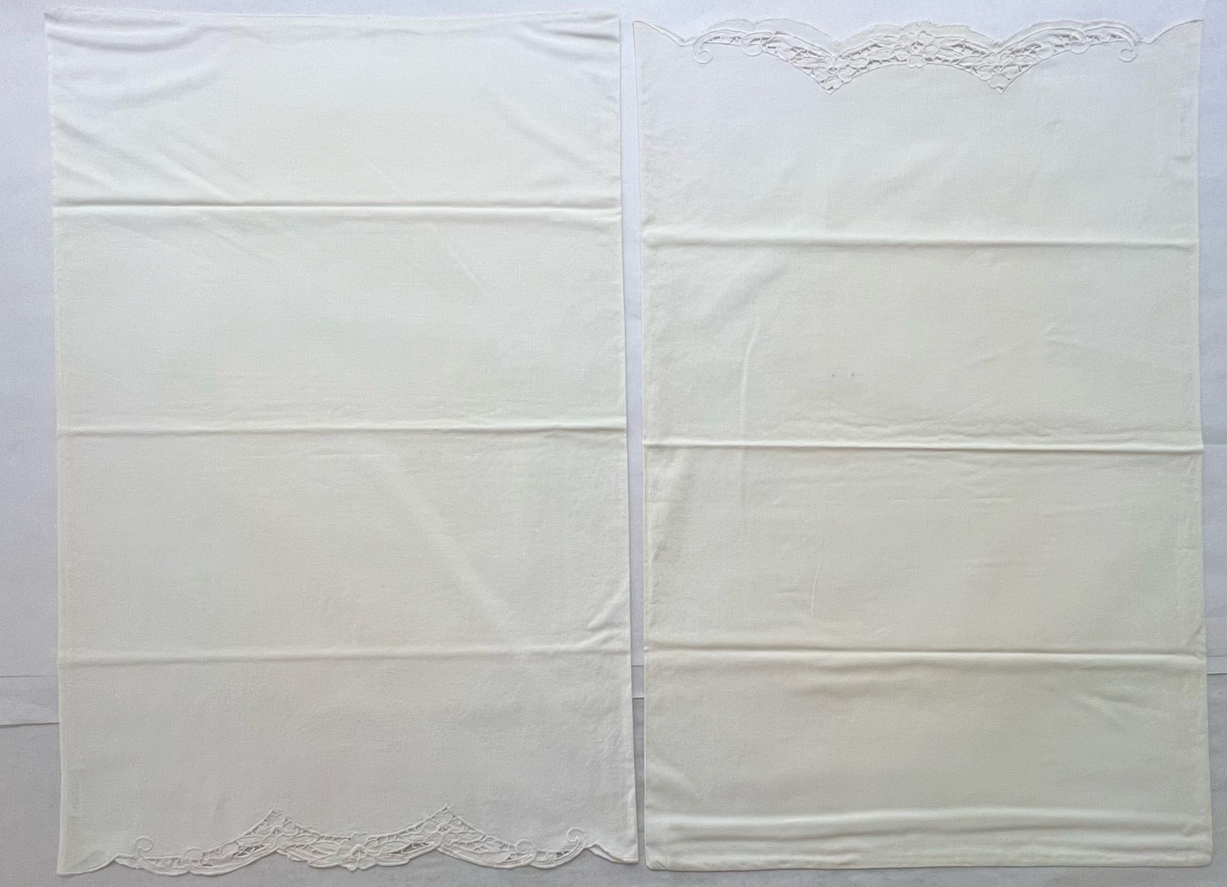 2 white pillowcases- top edge of open end embroidered flower design (stamped?) embroidered over stamp with interior section cut out. Back edge of open end tapered but no design.Collection