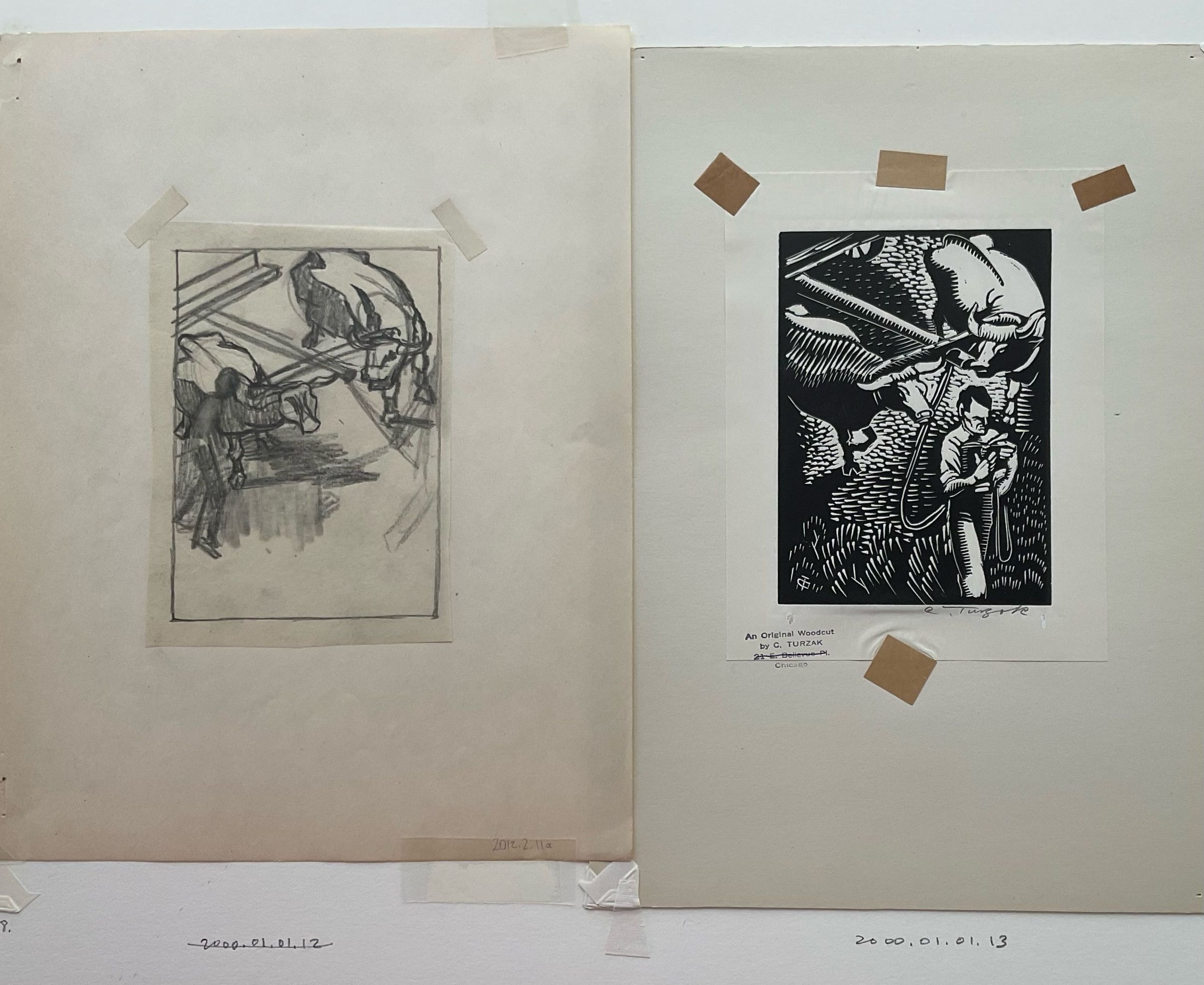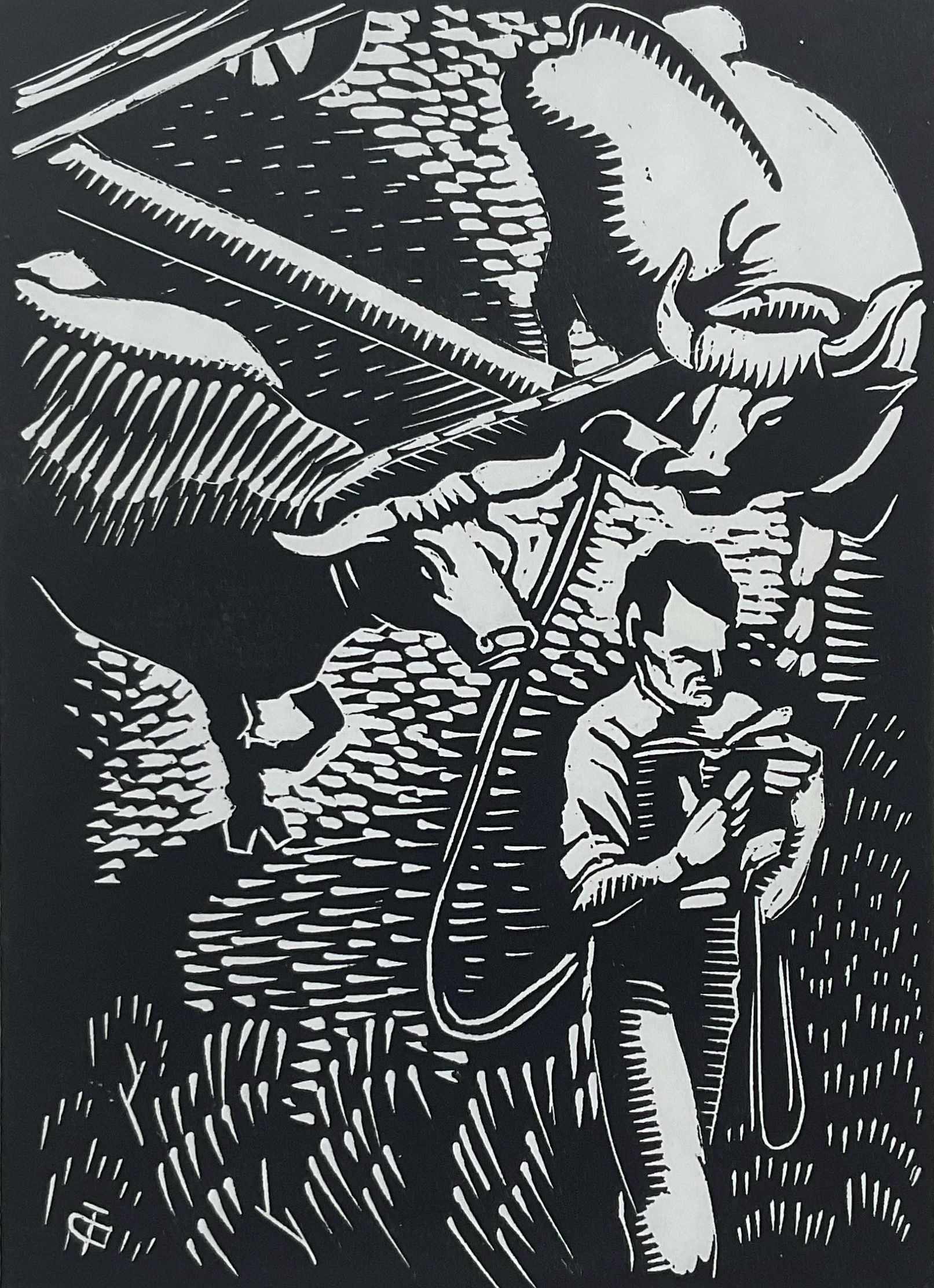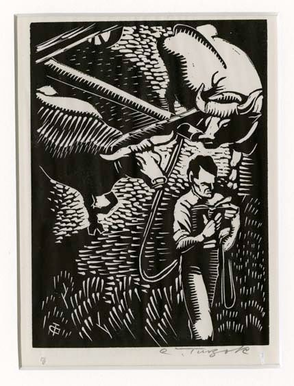 Abe A young man reads book while leading a pair of oxen pulling a cart.printed in black ink initialed CT in lower left corner1933 by Charles Turzak" Printed in the United States at Chicago 1933 during 'A Century of Progress Exposition'"Collection