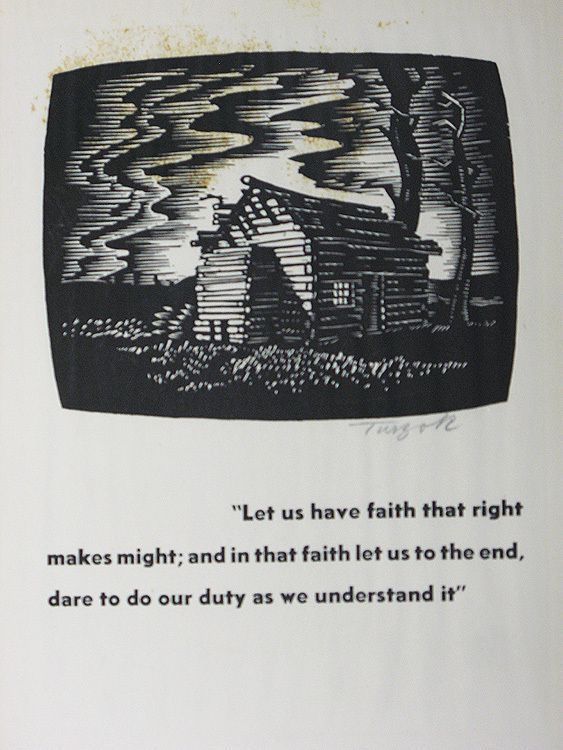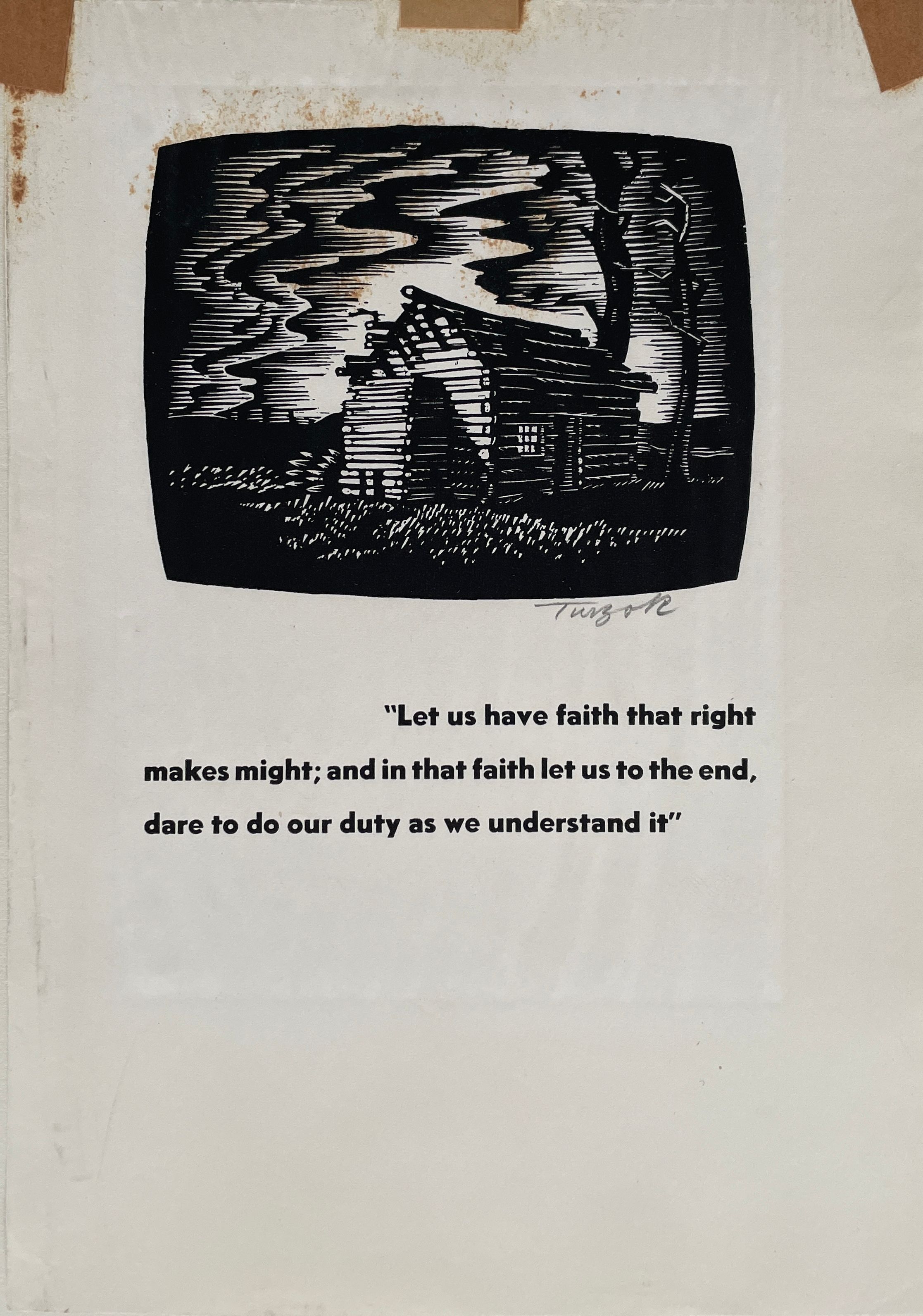 Image of Log cabin with impressionistic background. Text below reads "Let us have faith that right makes might and in that faith let us to the end dare to do our duty as we understand it."1933 by Charles Turzak" Printed in the United States at Chicago 1933 during 'A Century of Progress Exposition'"Collection