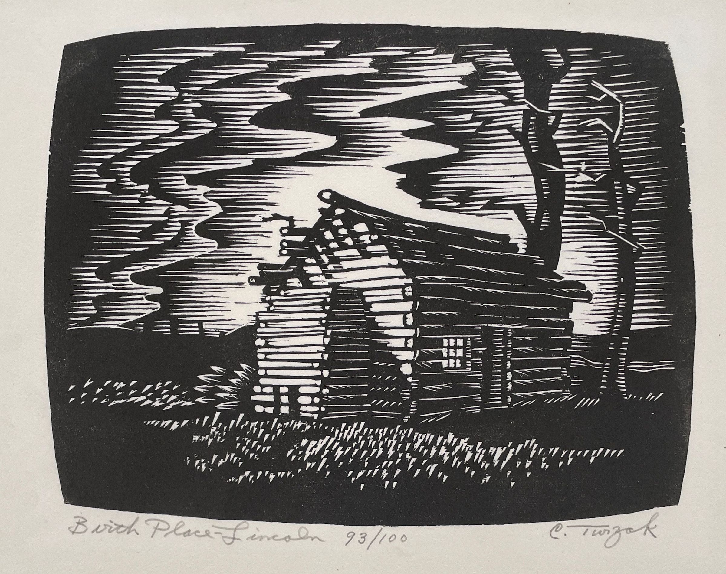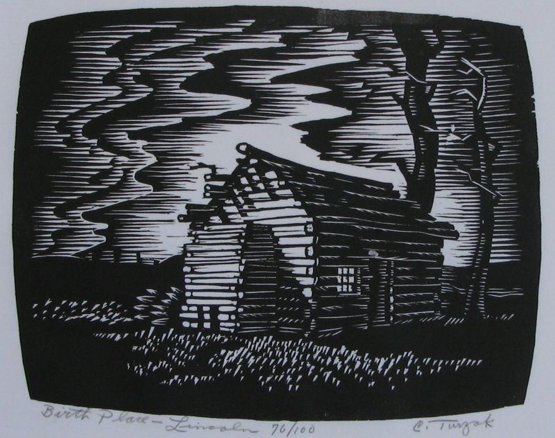 one room log cabin black on white all edges of image are curved (like a television screen)numbered 76/100 signed lower right- C. TurzakCollection