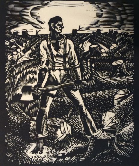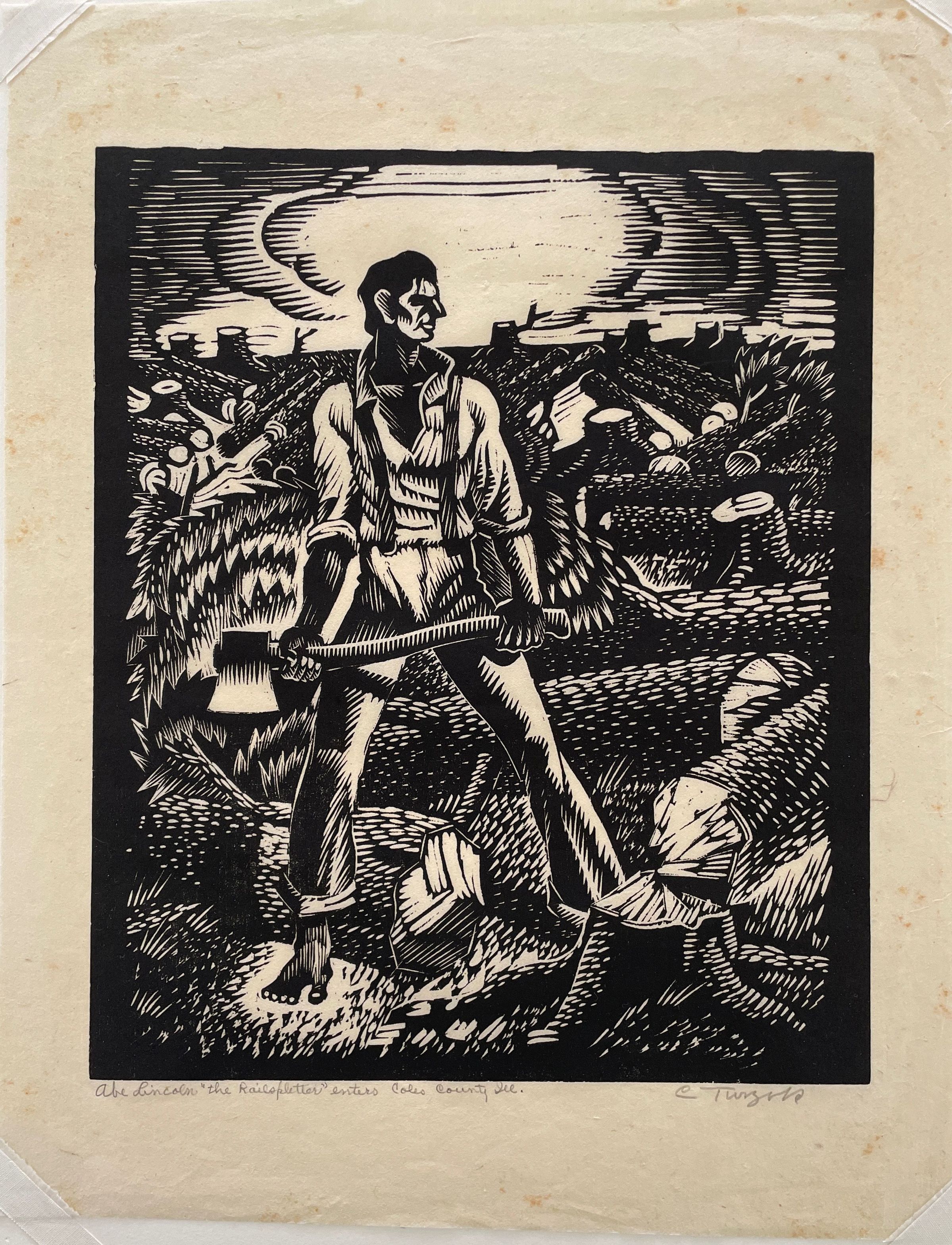 Young Lincoln (no beard) holding ax looking off in the distance;