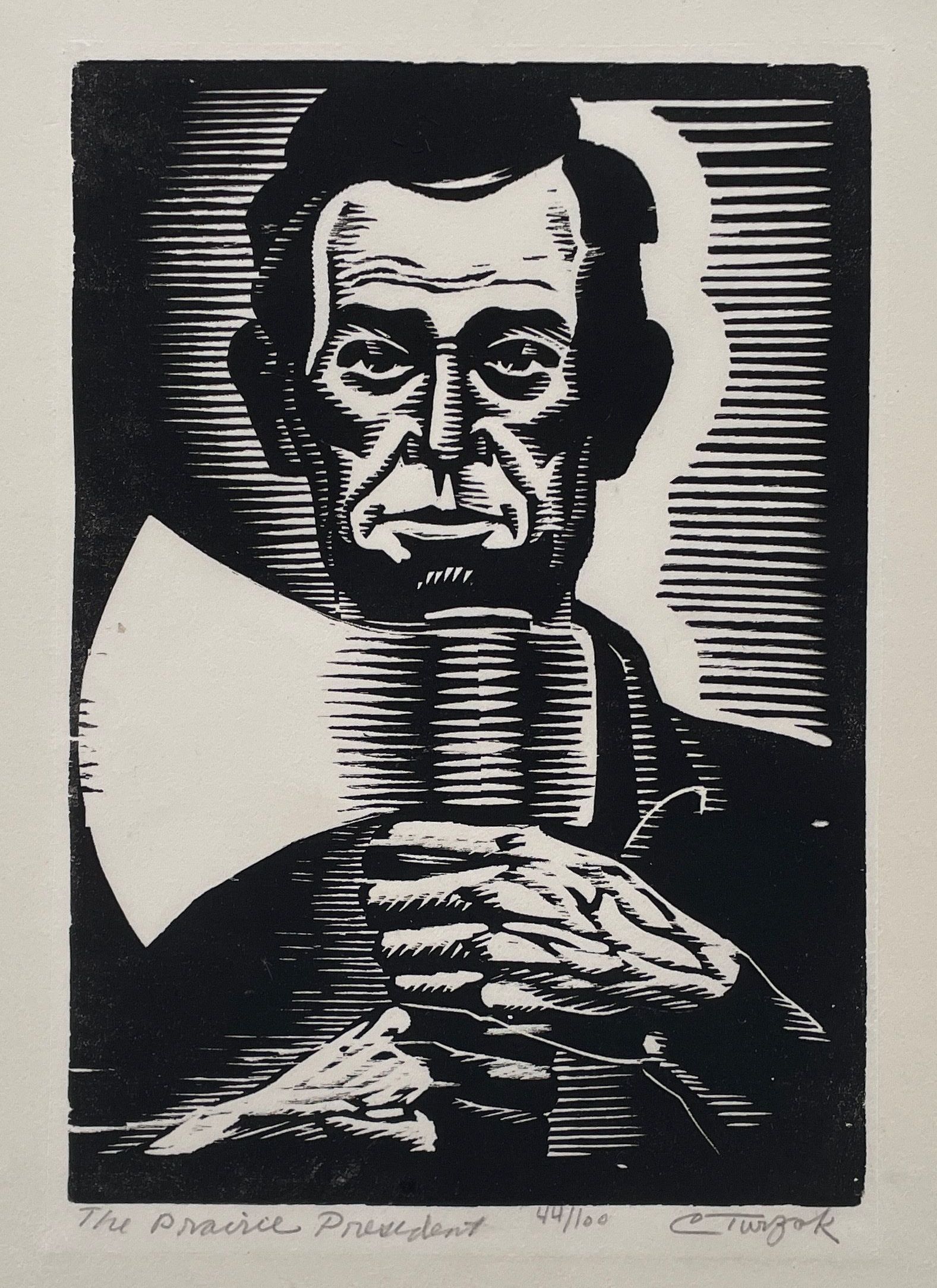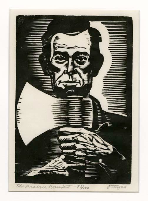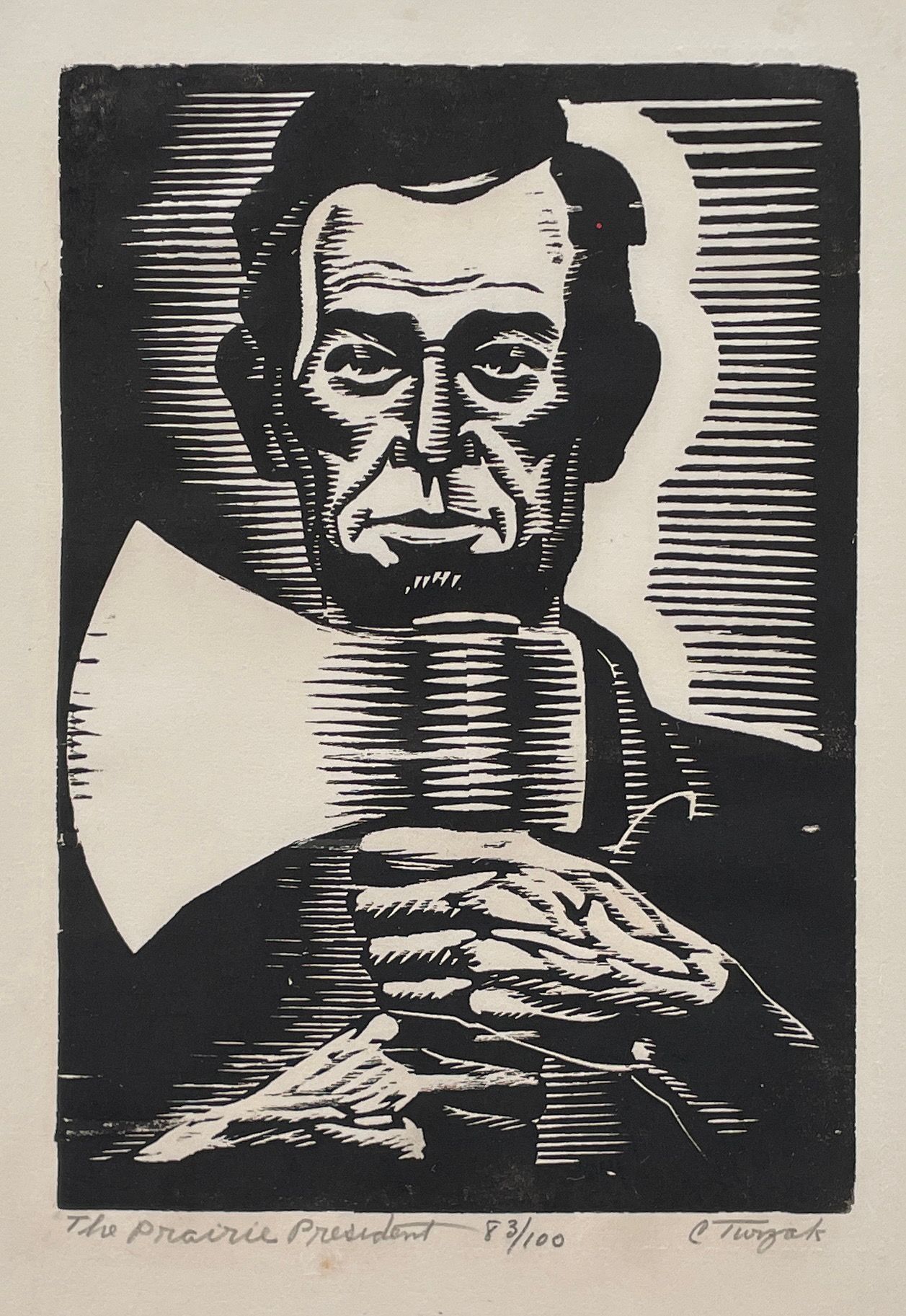 1998.01.1a- Chest high image of Abe Lincoln holding with both hands a single blade axe. Signed and numbered 83/100 of edition; printed on white wove paper; some yellowing from ink onto paper; nice impression with small areas of skimming; mounted onto mat backing with paper-photo-corners and linen tape