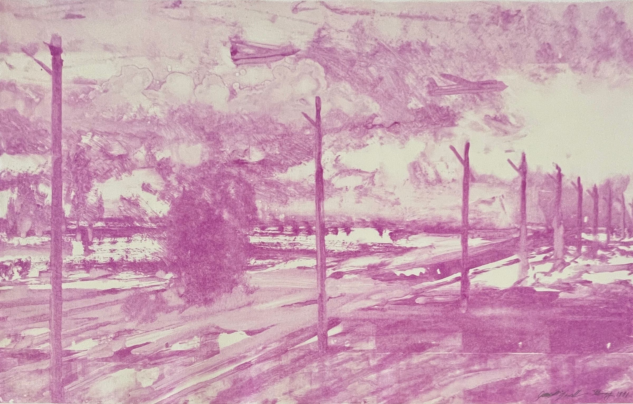 Landscape of one sade of purple indistinct images (telephone poles?) unframed on white paper.Collection