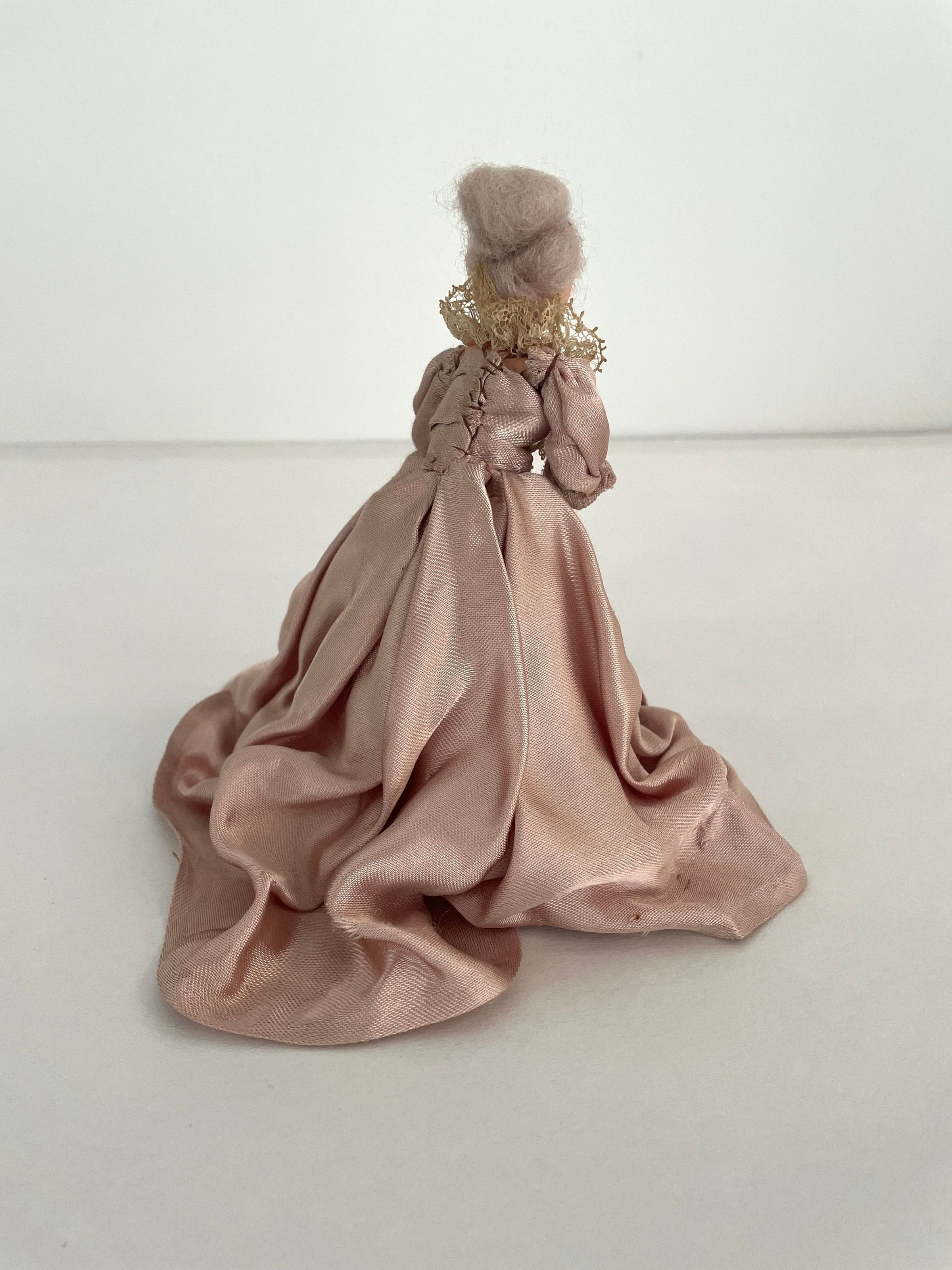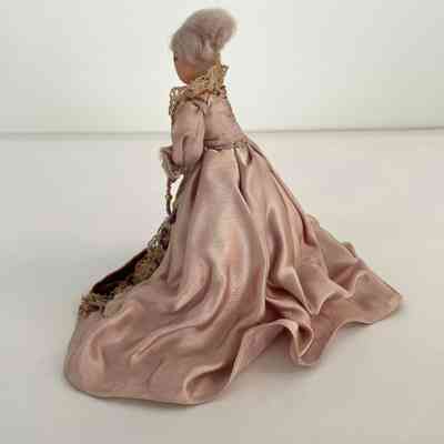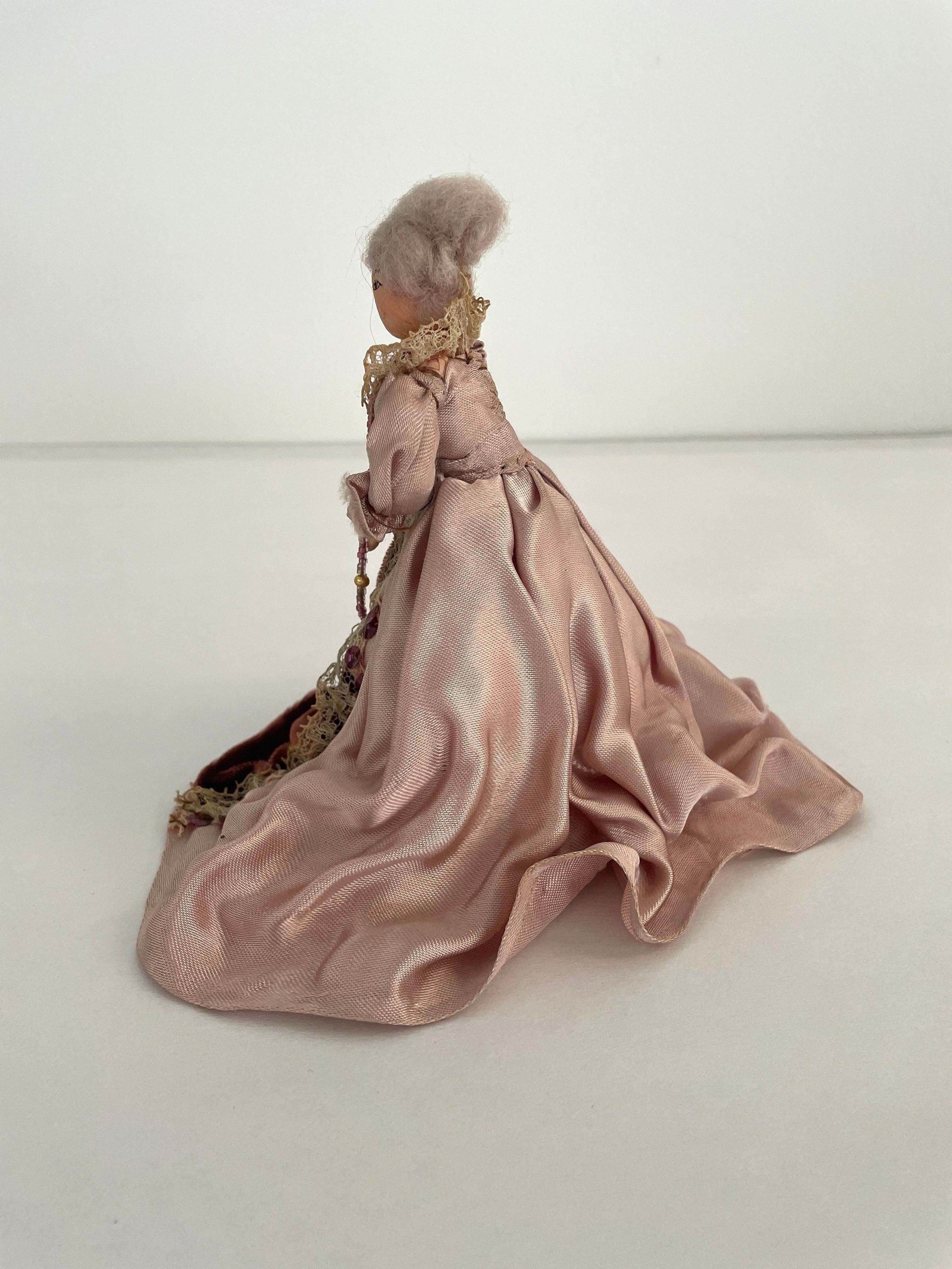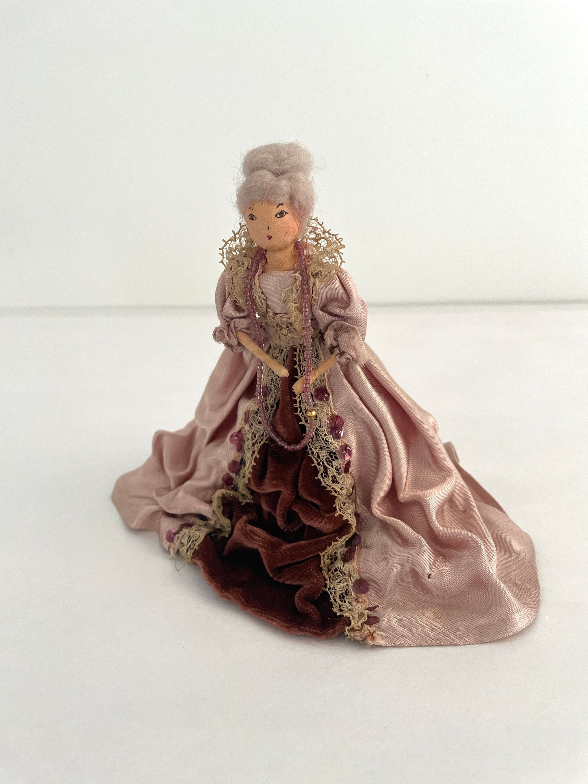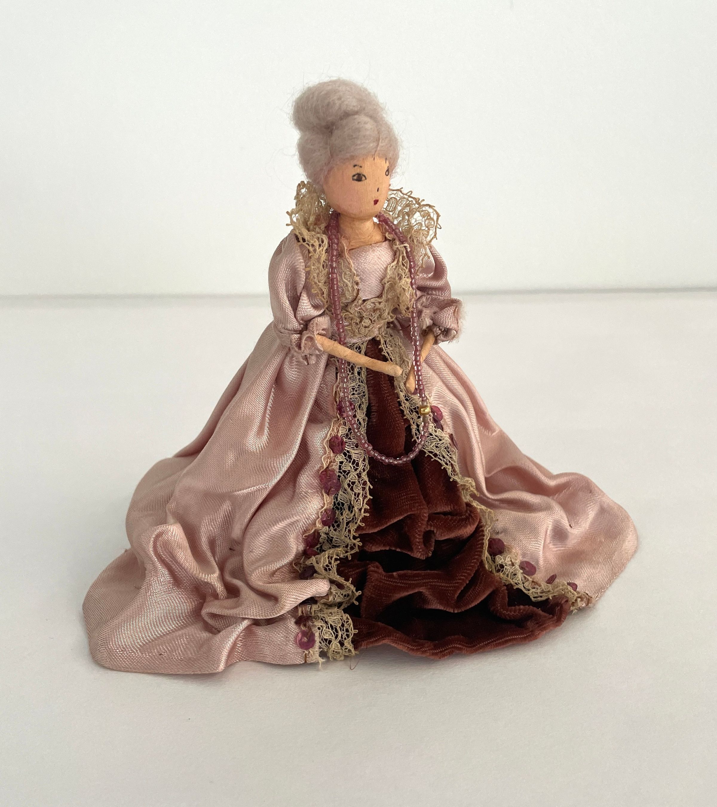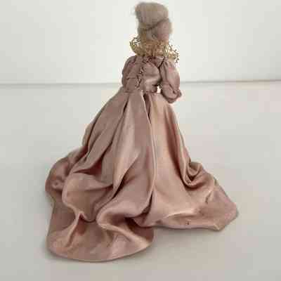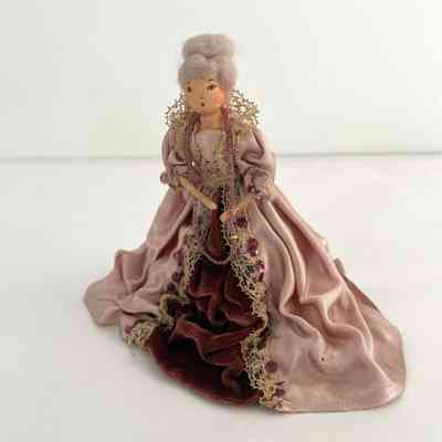 Standing position, holds purple fanned-pot feather in left hand. Gowned in purple velvet and gold net-like panel in front and at cuffs and neckline. Long velvet train. Ruffed sleeves, long black beads descend from waistline. Gold band with purple and black feather worn in grey hair.Collection