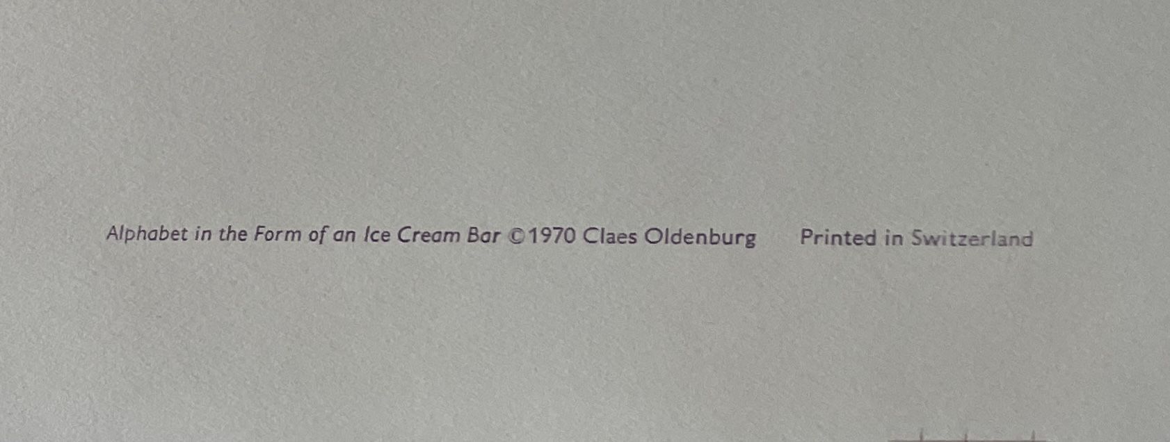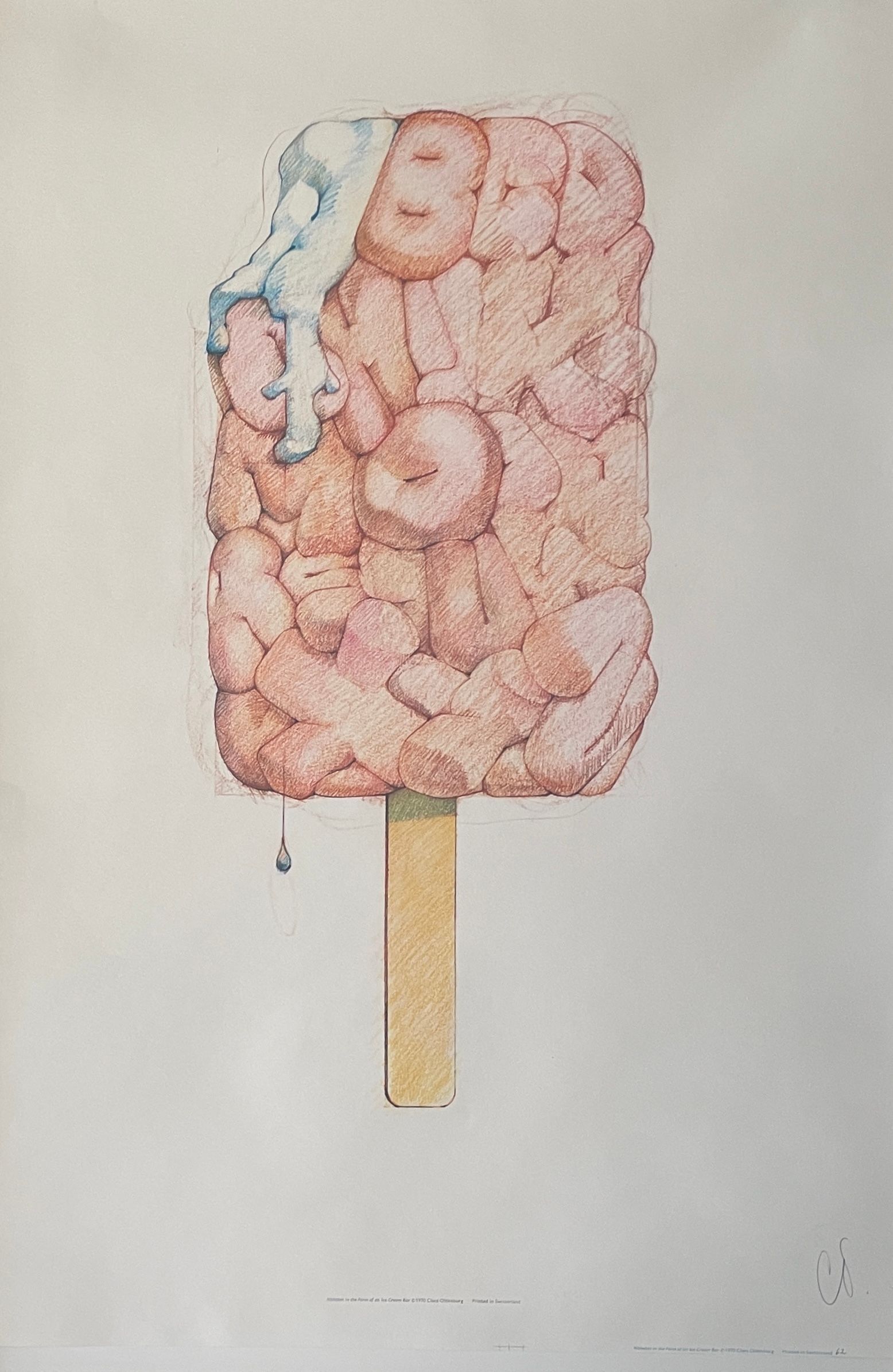 Large work done on white paper. Inflated-looking letters form the top of an ice-cream bar supported by a wooden looking handle. Upper left looks like bite has been taken out and is melting. Done in shades of brown, blues and pinks. Silver metal frame, glass covering, white mat.Type of Print