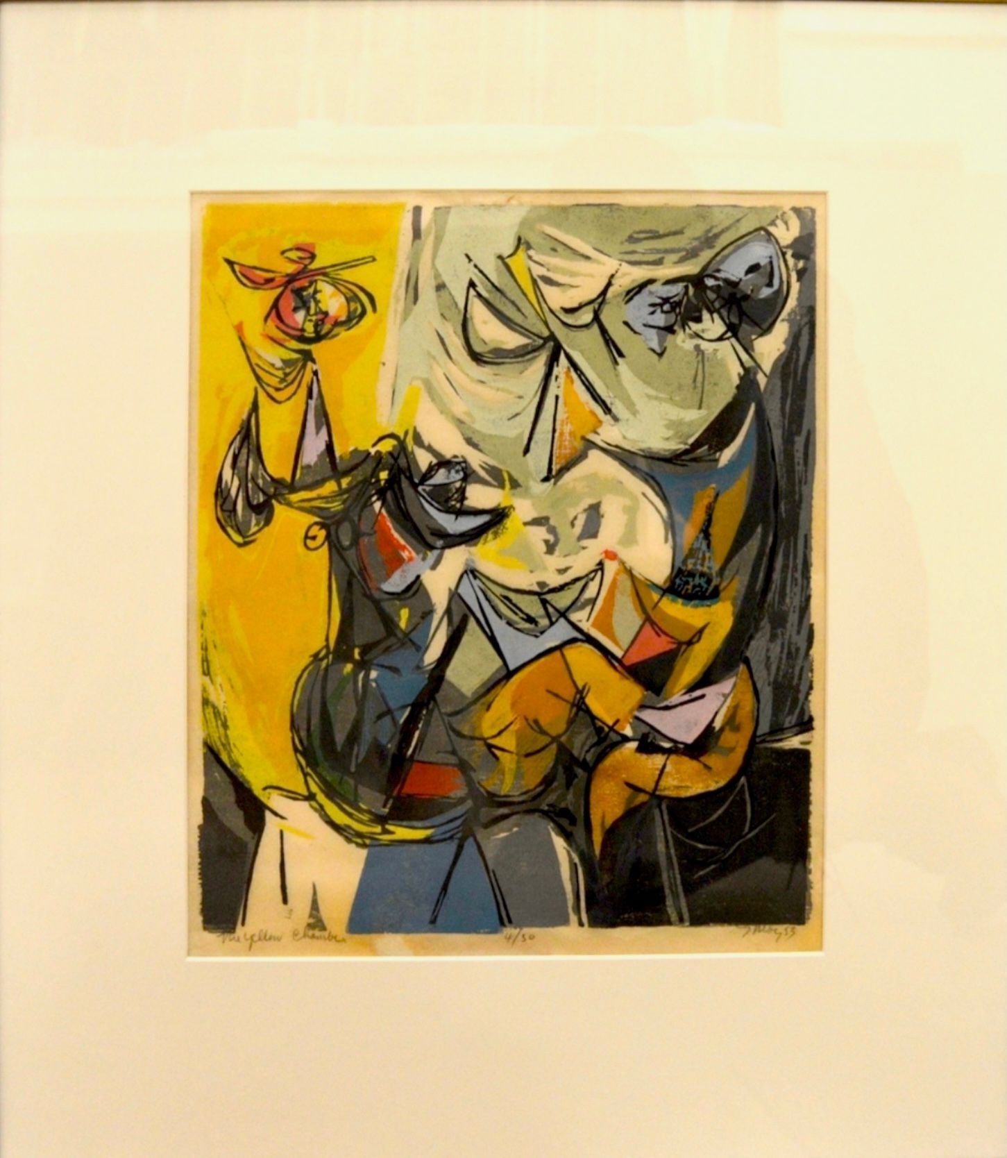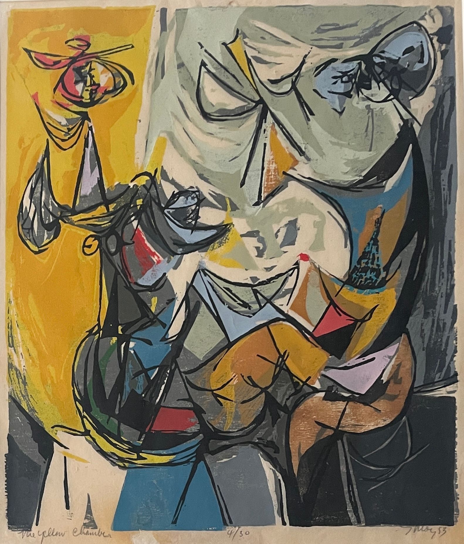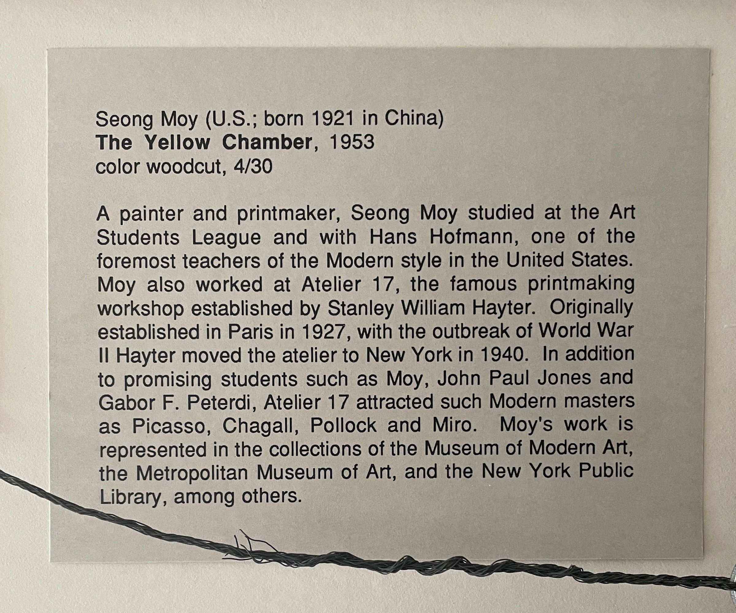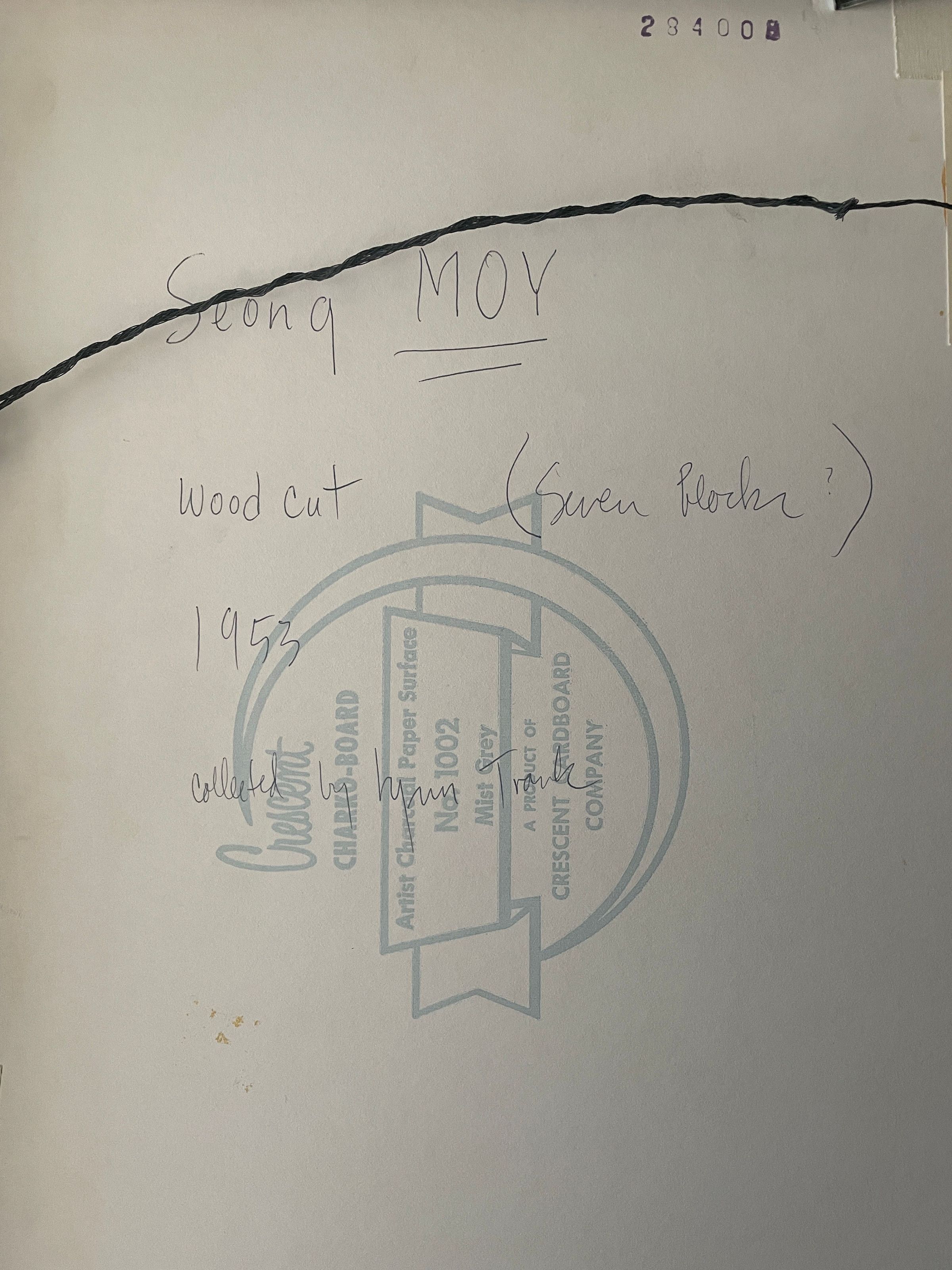 Seven plate wood cut with three tones of grey, black, lavender, blues green, red, 3 golds, 2 green tones. Expressionistic style. Black outlines on natural paper. Bronze toned metal frame, natural mat, glass covering. Provenance unknown.Artwork Details
