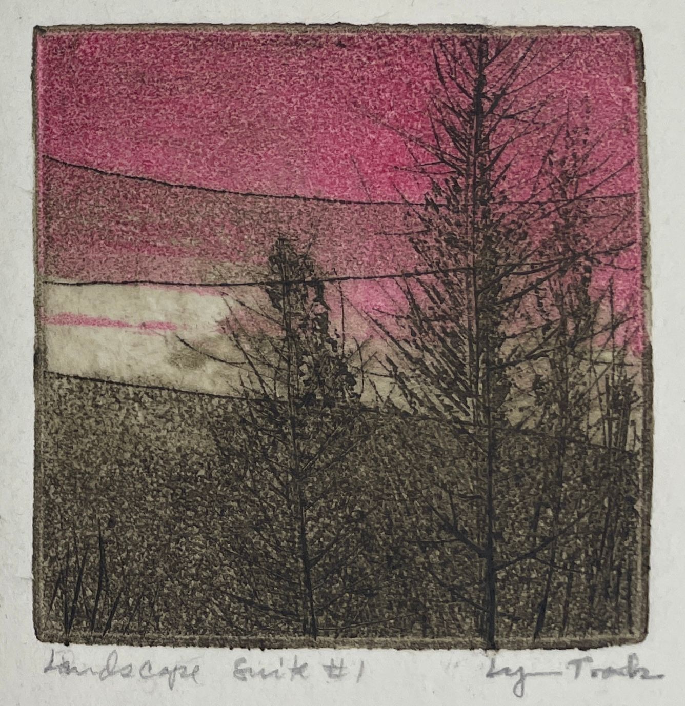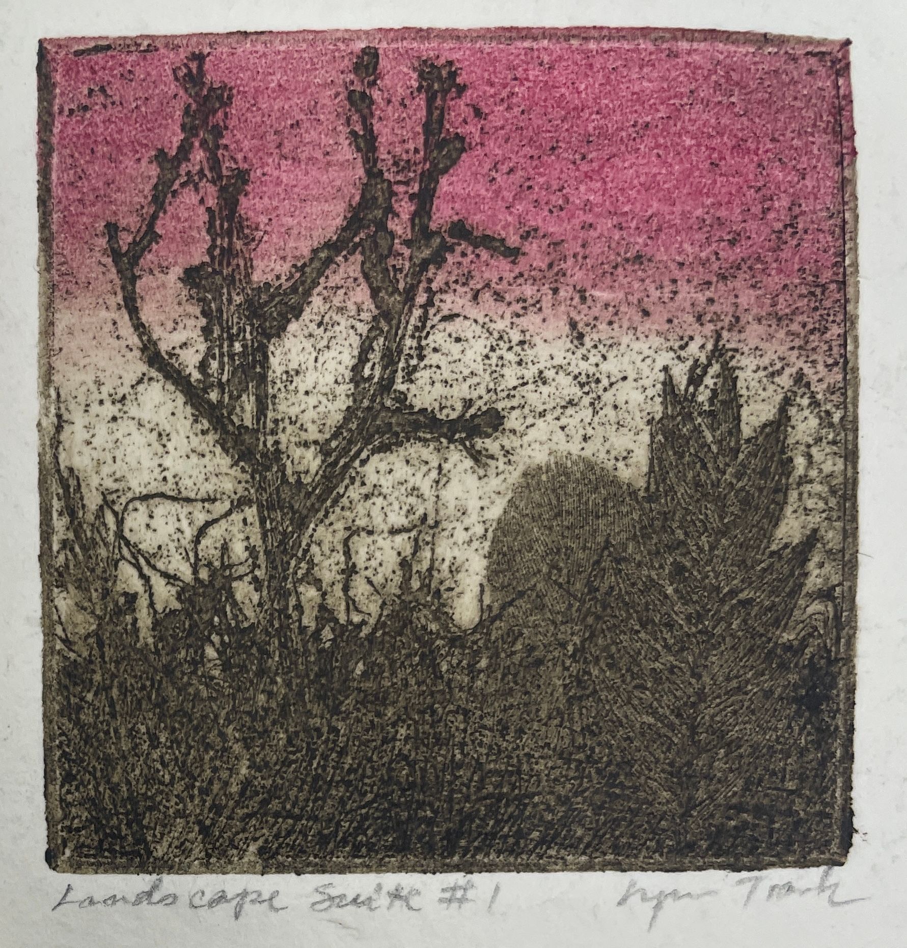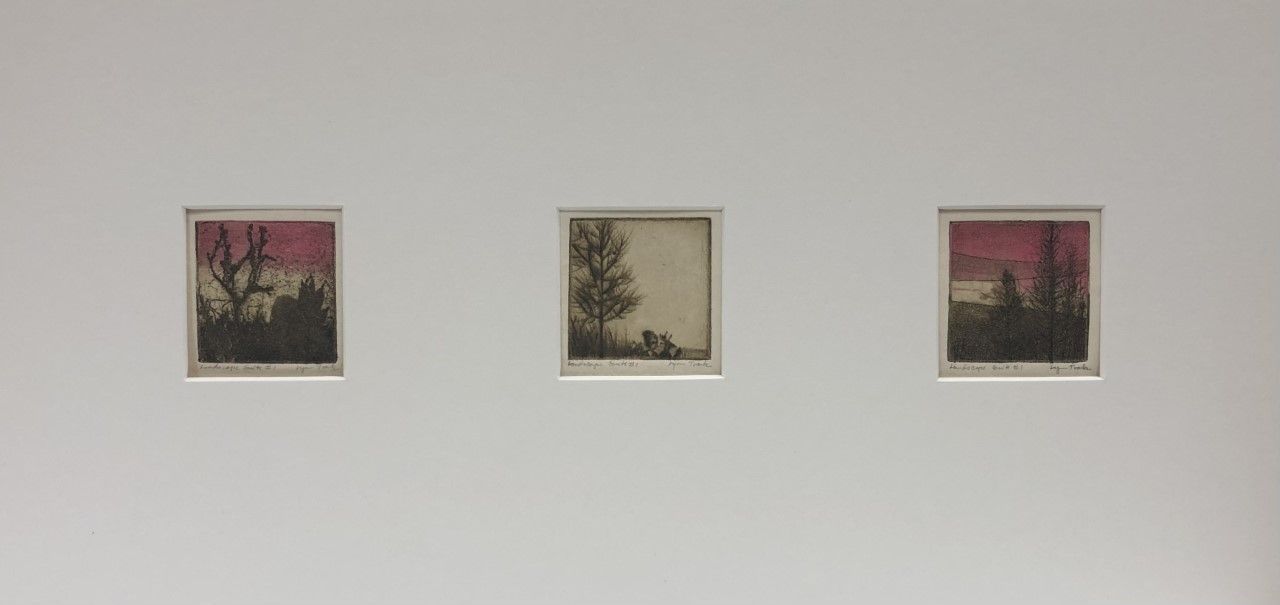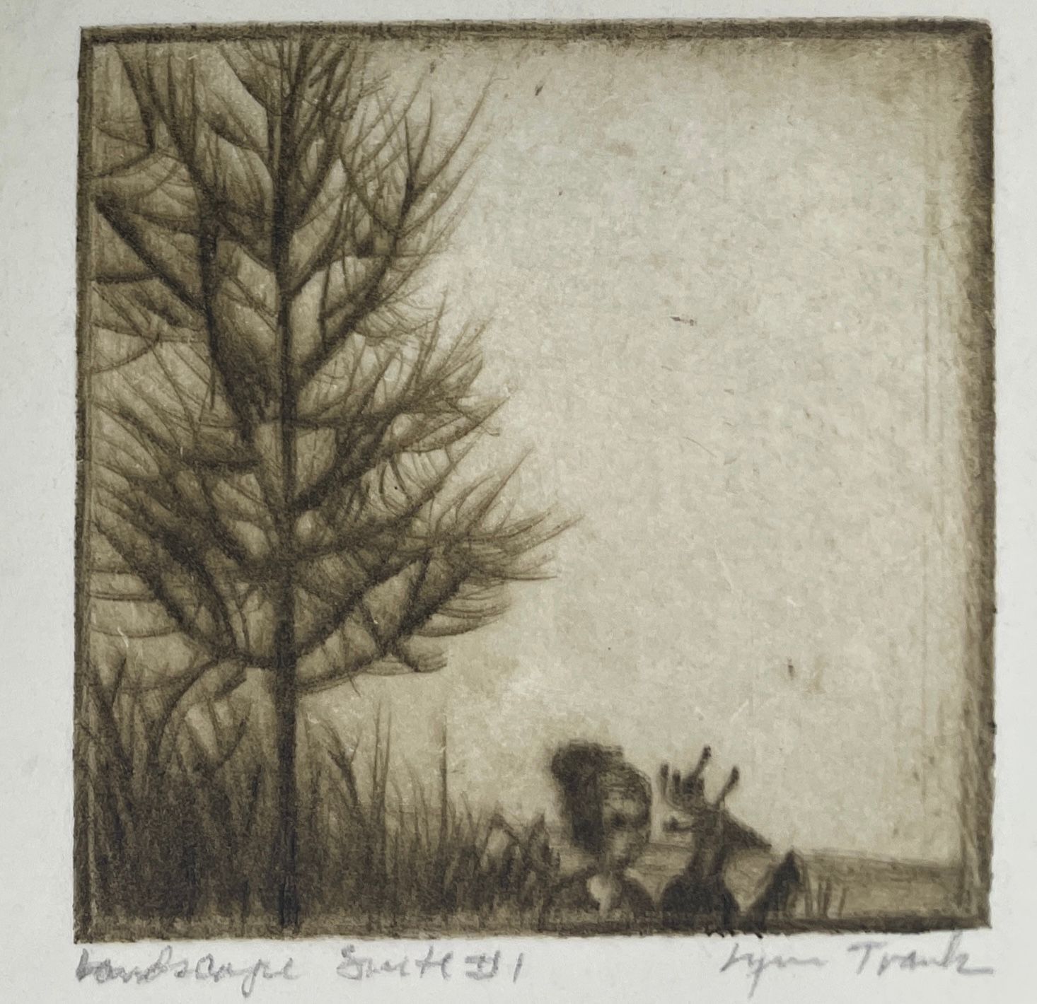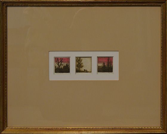 3 inset landscape panels-mostly trees and sky- human figure in center panel. Each panel labeled and signed by artist.Collection