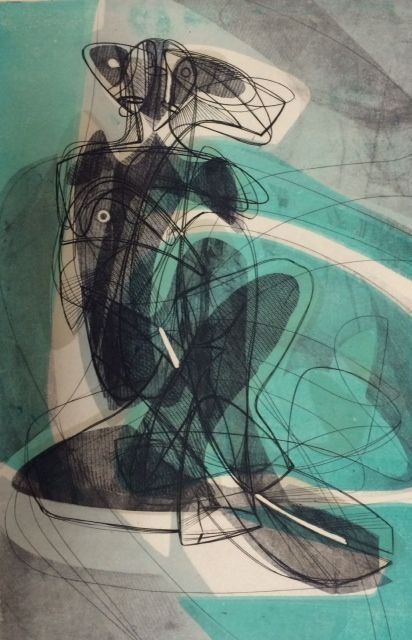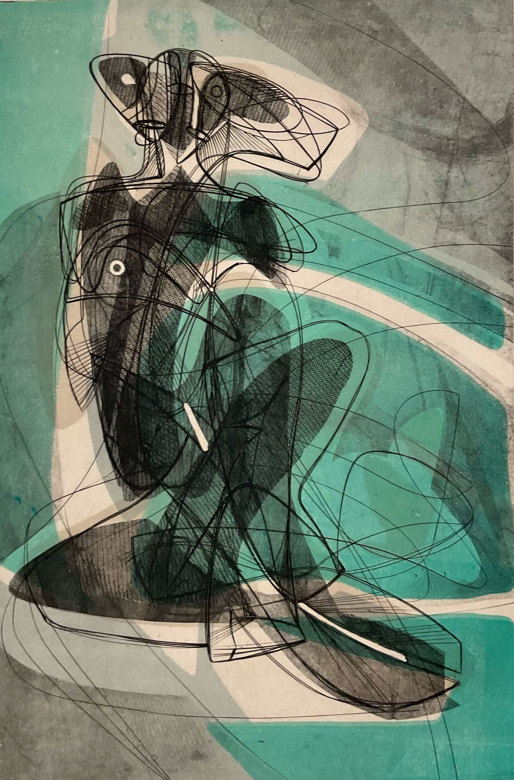 Strong black deeply etched lines mesh together to form two figures- and swirl out in free forms against a background of delicately tinted mauve and aqua. The figures are highlighted against a shadow of orange.Collection