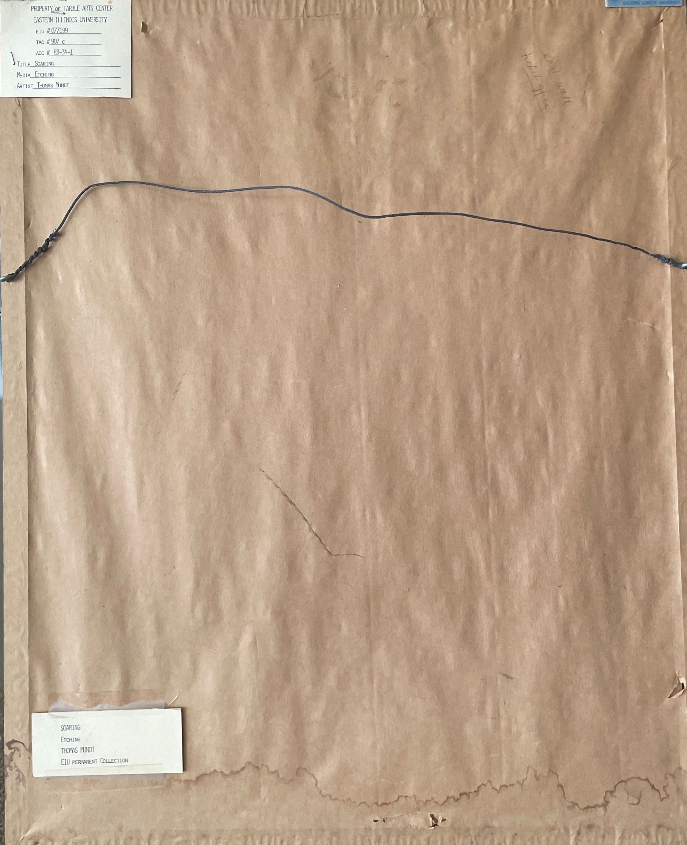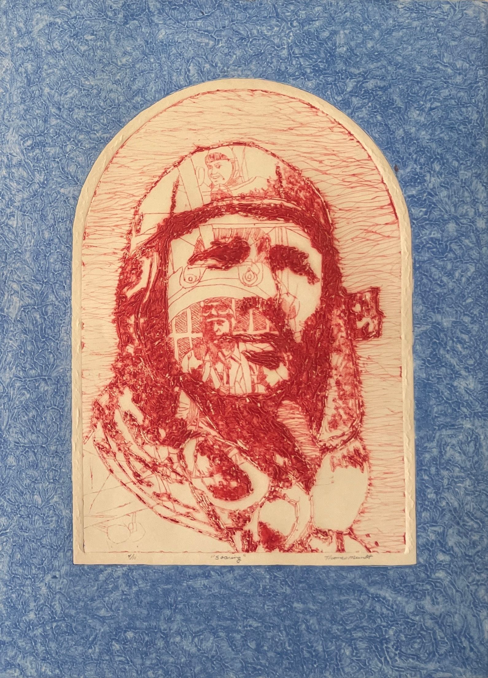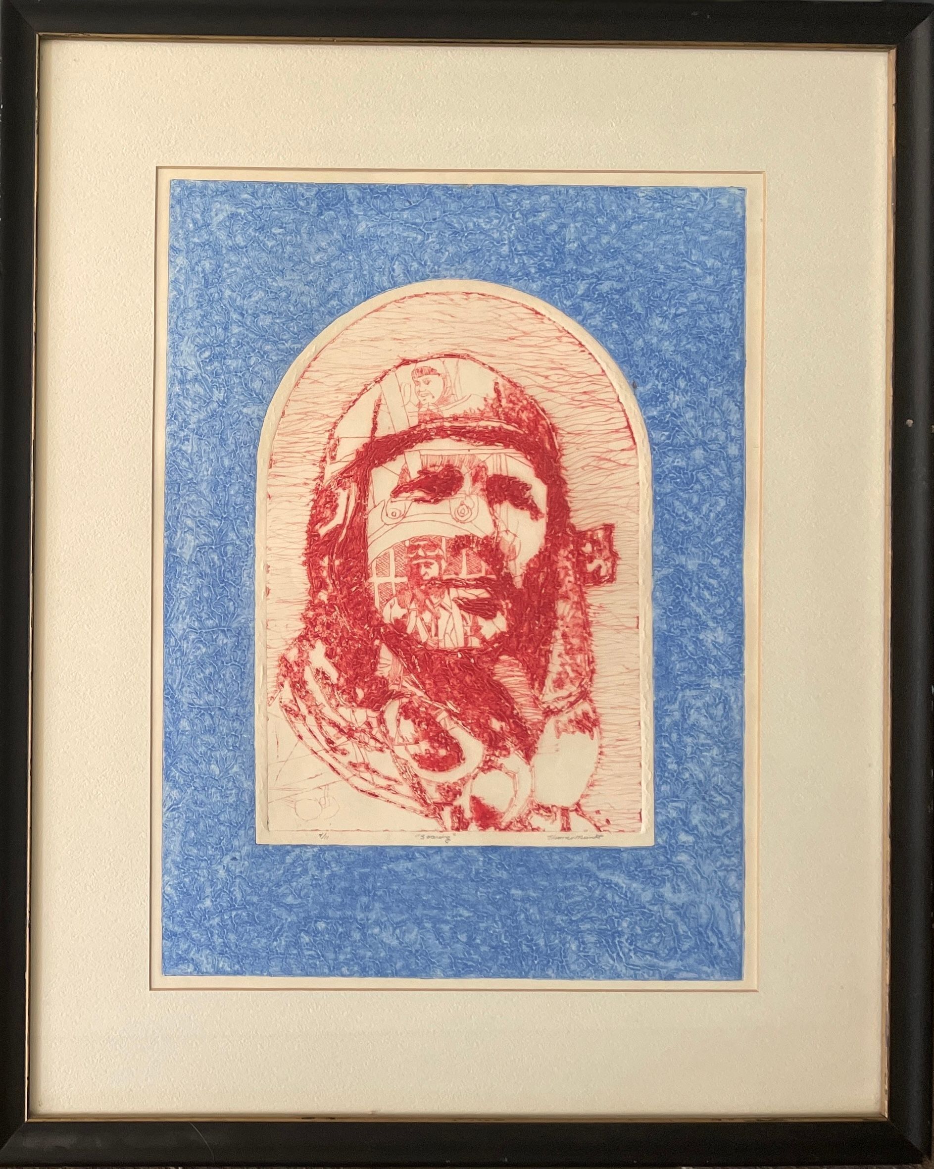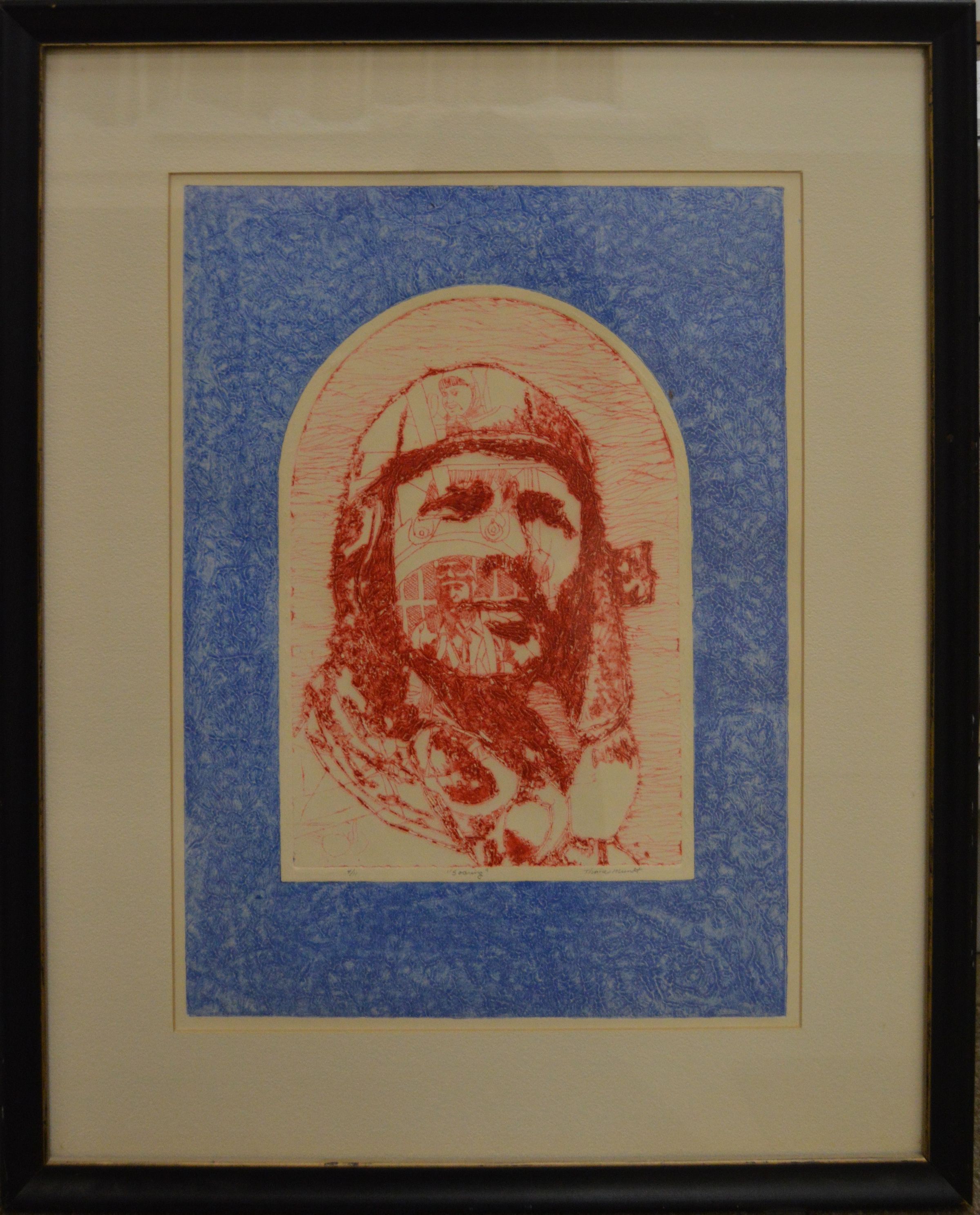 Portrait of aviator with smaller images inset. Portrait in red and white, arch shaped and surrounded by blue ground.Collection