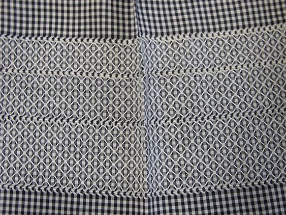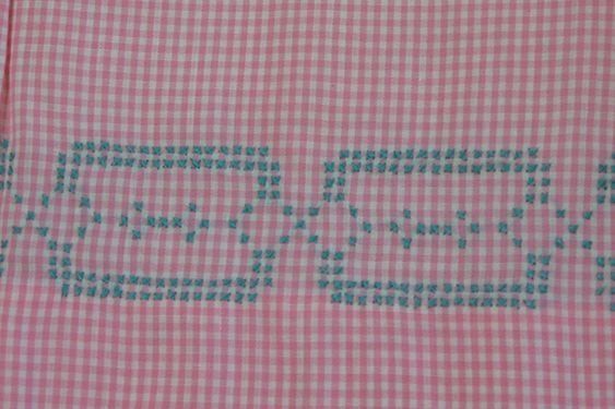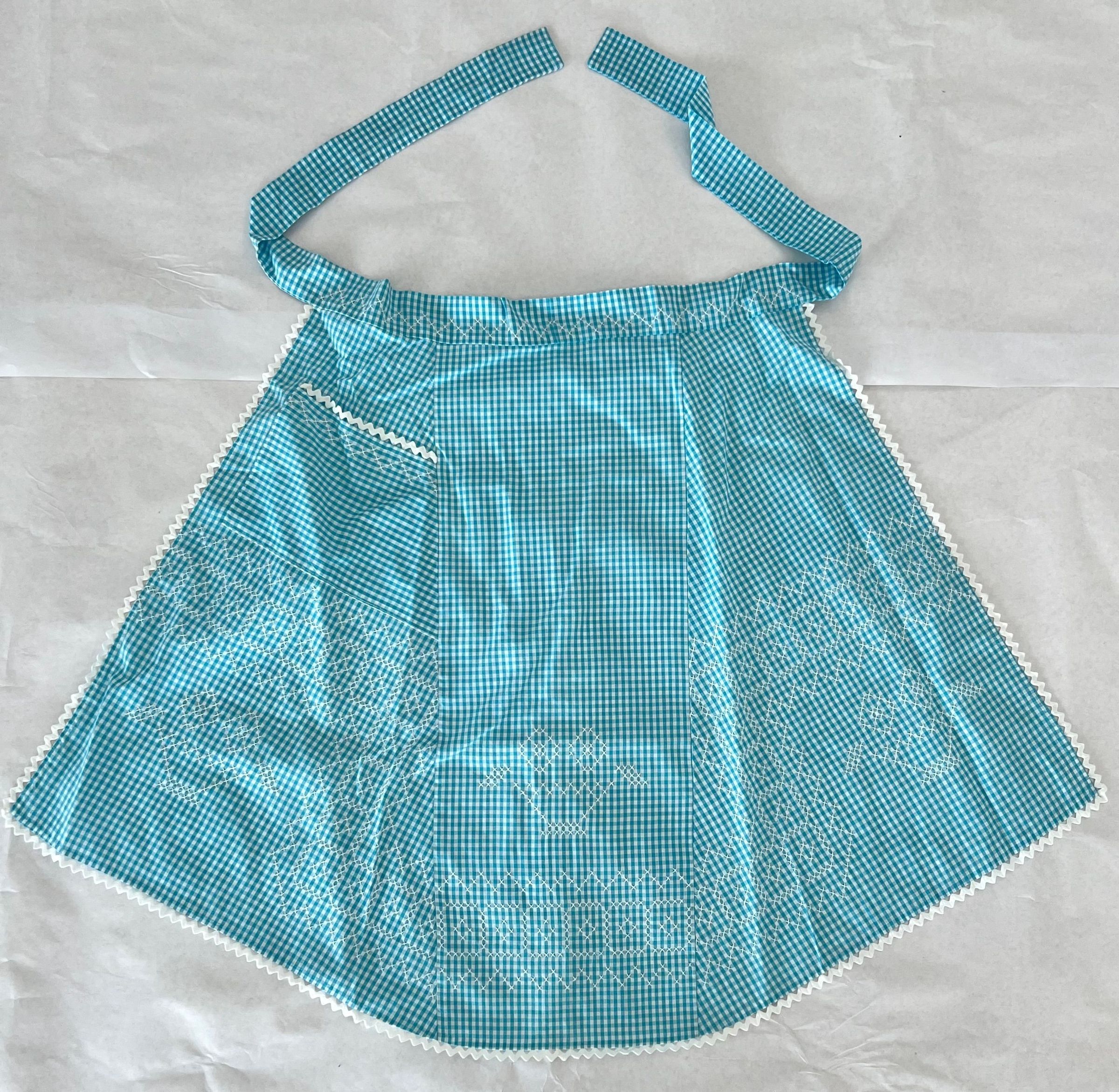 5 half aprons and 1 full apron. Black and white "gingham" checkerboard pattern (1/8" x 1/8")- white stitching "X" pattern on top band- one sewn front pocket- and 6-1/2" band 2" from bottom of apron. The checkerboard pattern of "Gingham" have been a challenge women needing aprons but were a fad in Arizona circa 1959-1970. These are examples of endeavors to beautify the "necessary" by cross-hatching. See original attached note for additional information.Collection