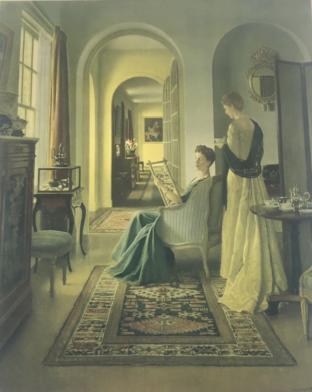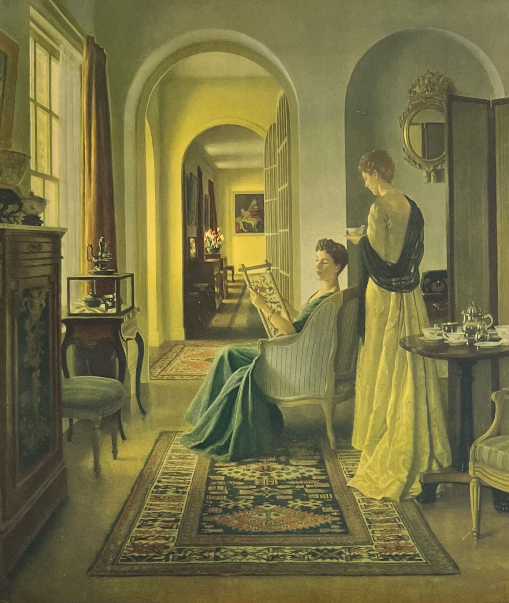 Interior scene, two ladies in drawing room, tea and needlepoint. Gilt and stained wood frame, glass cover, heavy wire hanger (replace).Collection