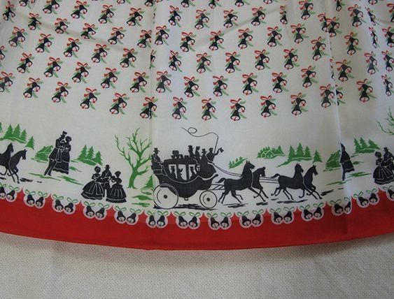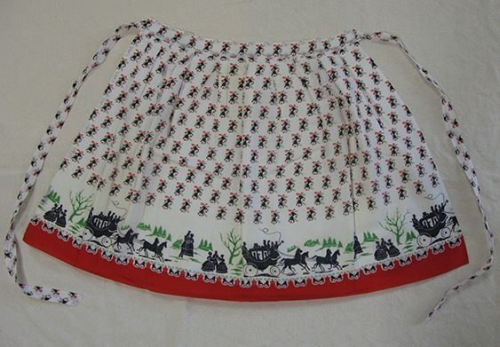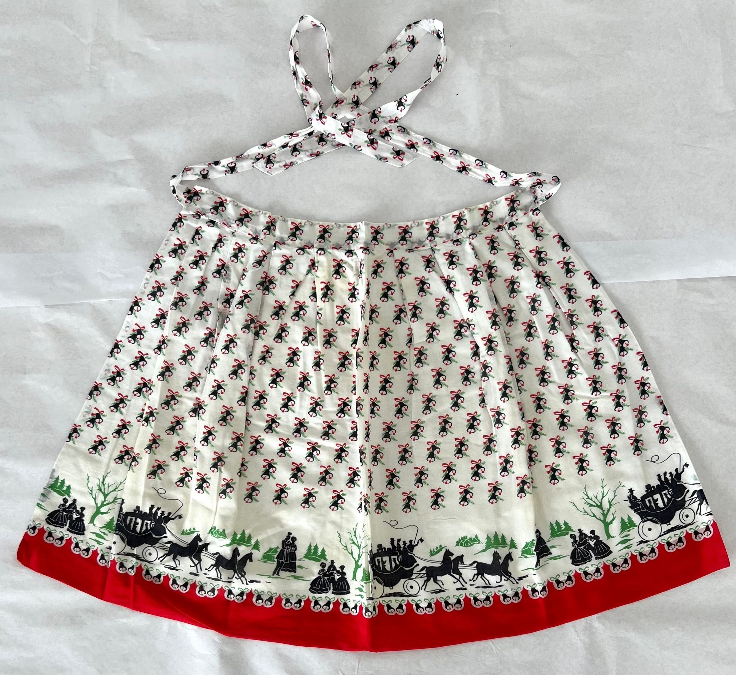 Holiday pattern on a half apron containing black bells with holly a repeated pattern of a sleigh ride on bottom and red strip of lining on bottom of back. Shows the challenge of a "Christmas Holiday" patterned cotton on.Collection