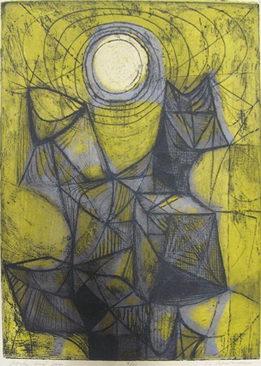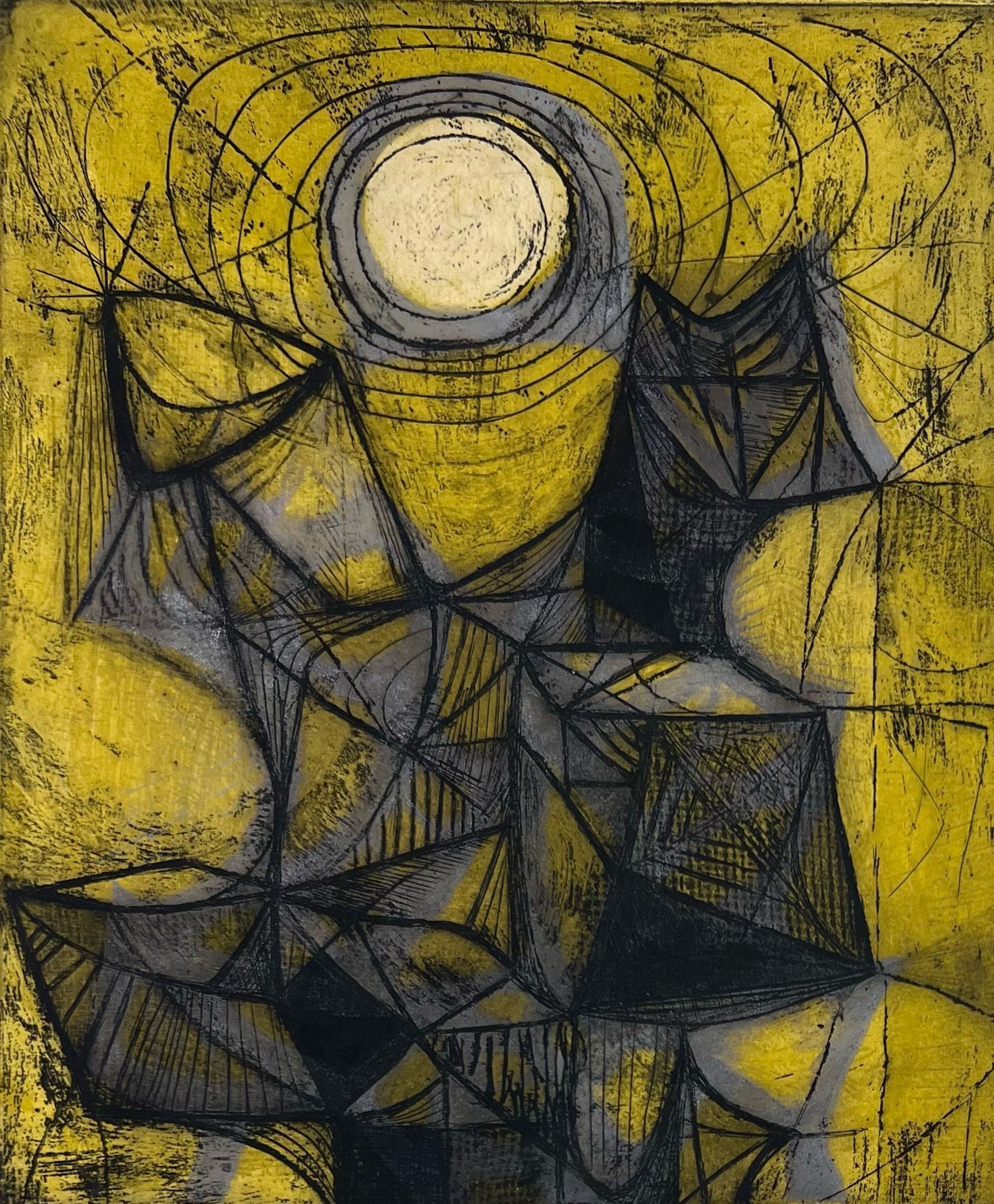 3 plates, sun shape in background with black ringlets around and abstract shaped boxes. Ink colors black and grey and yellow on rice paper. Bronze tone metal frame, white mat, and glass covering.Collection
