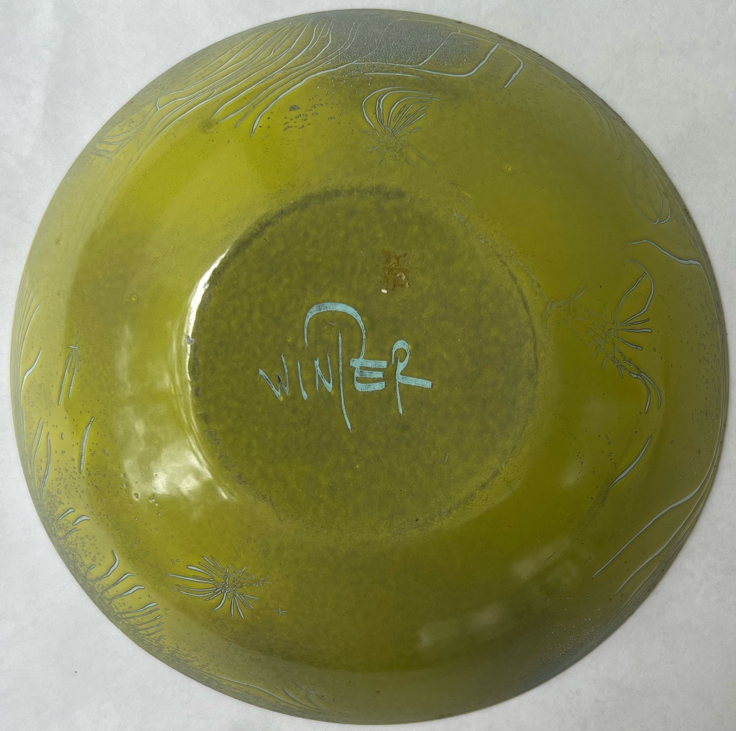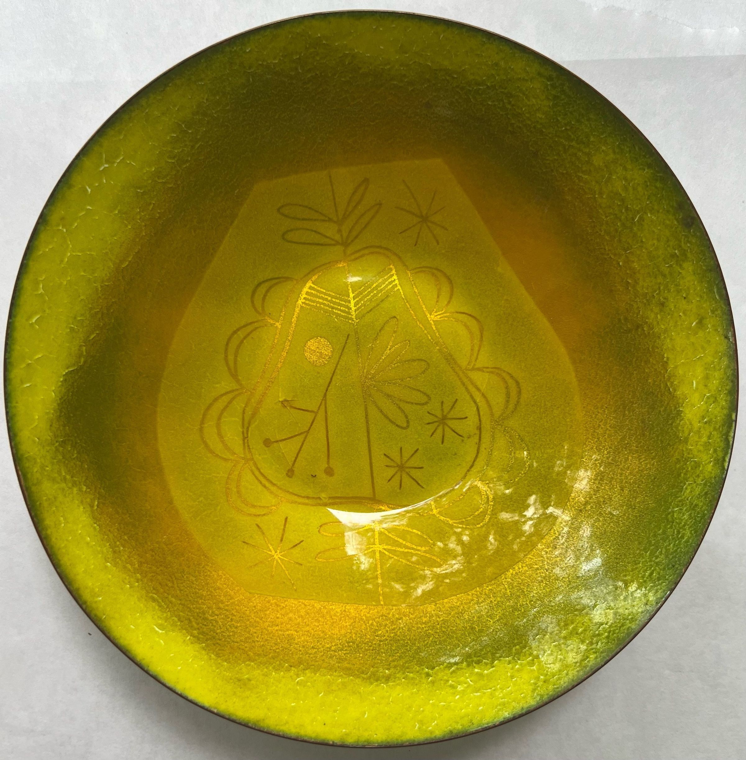 round copper bowl enameled in yellow with an abstract pear design in center; signed on bottom "Winter"Collection