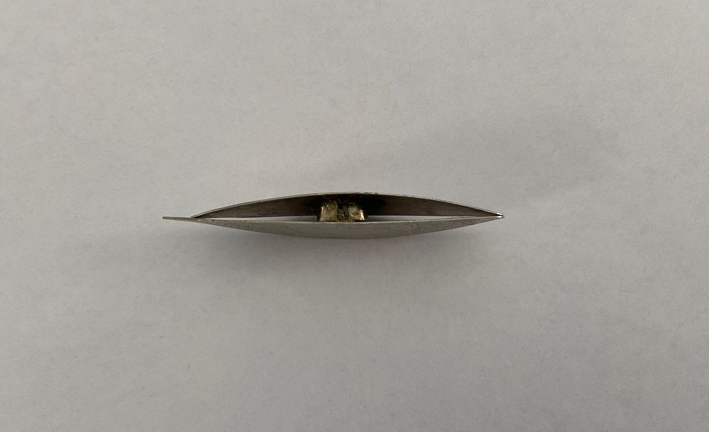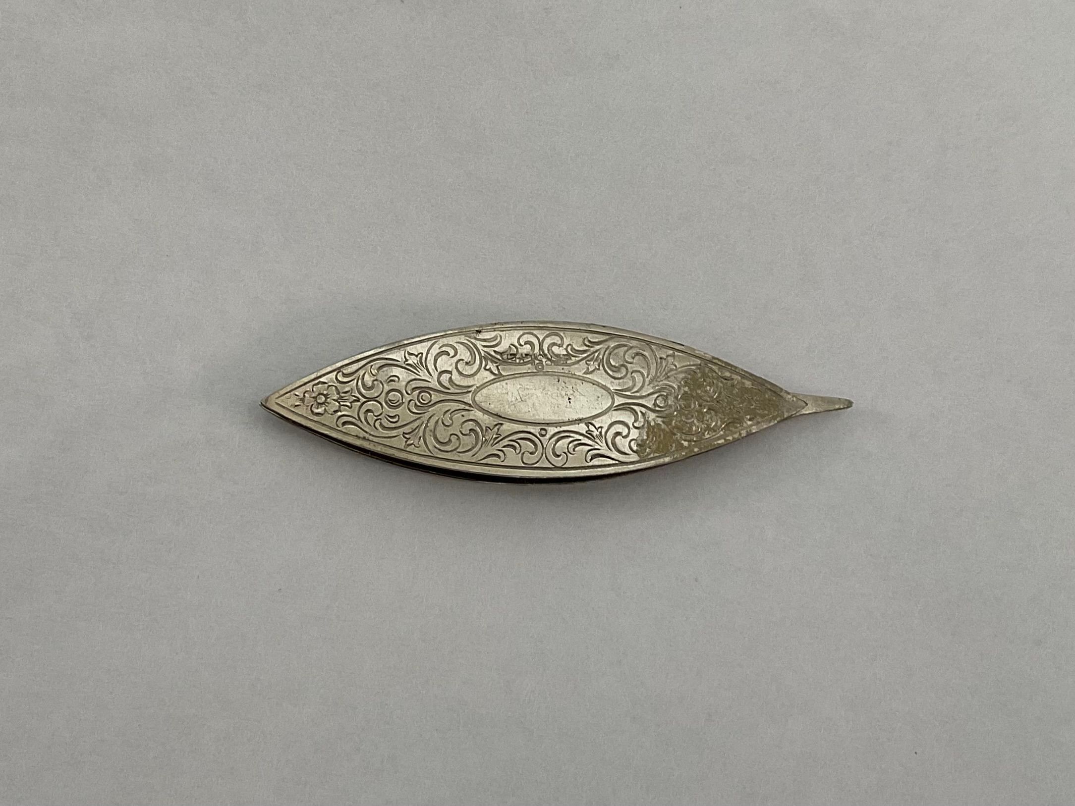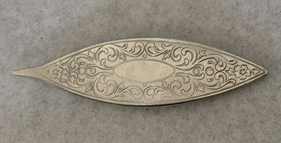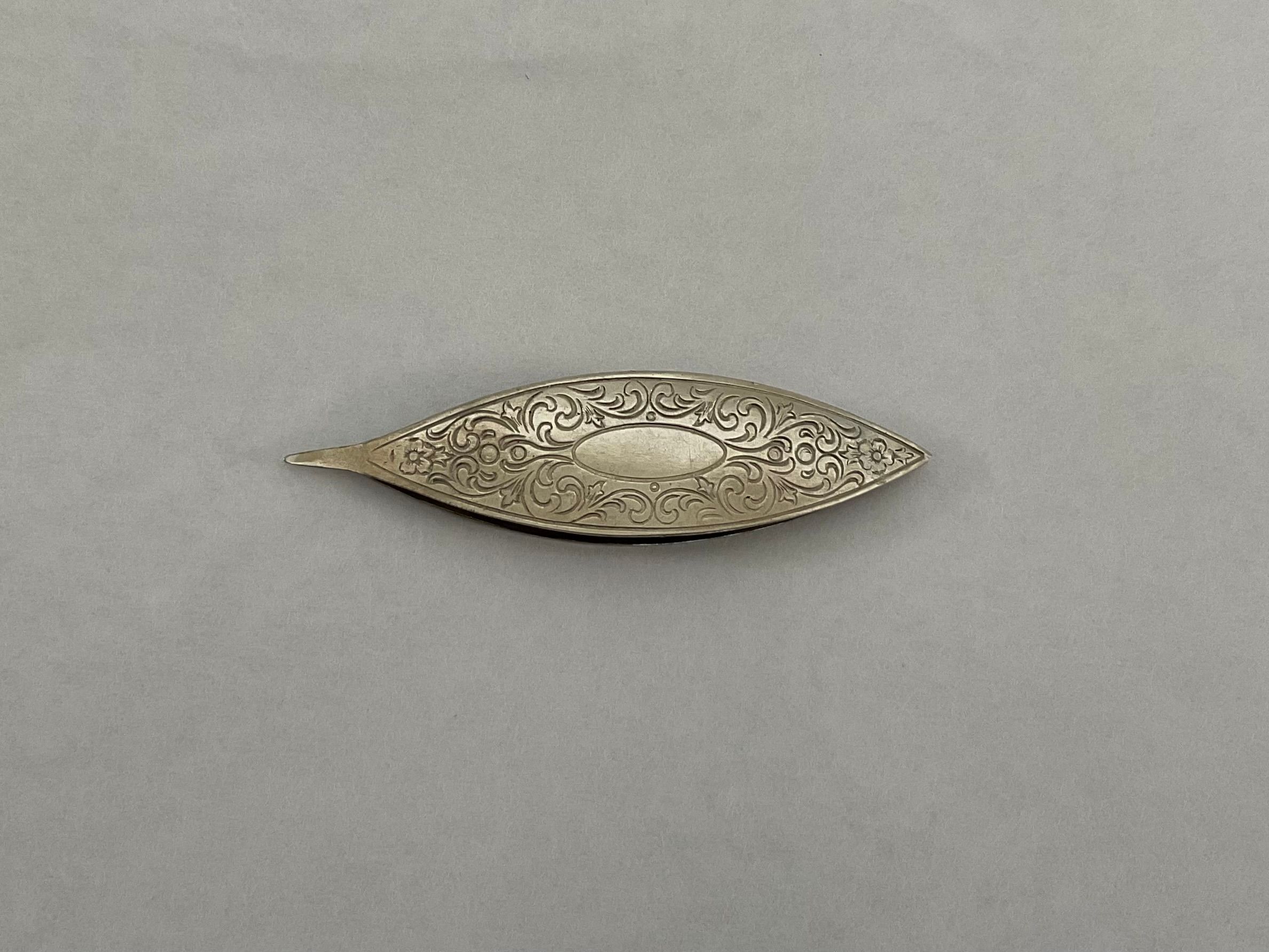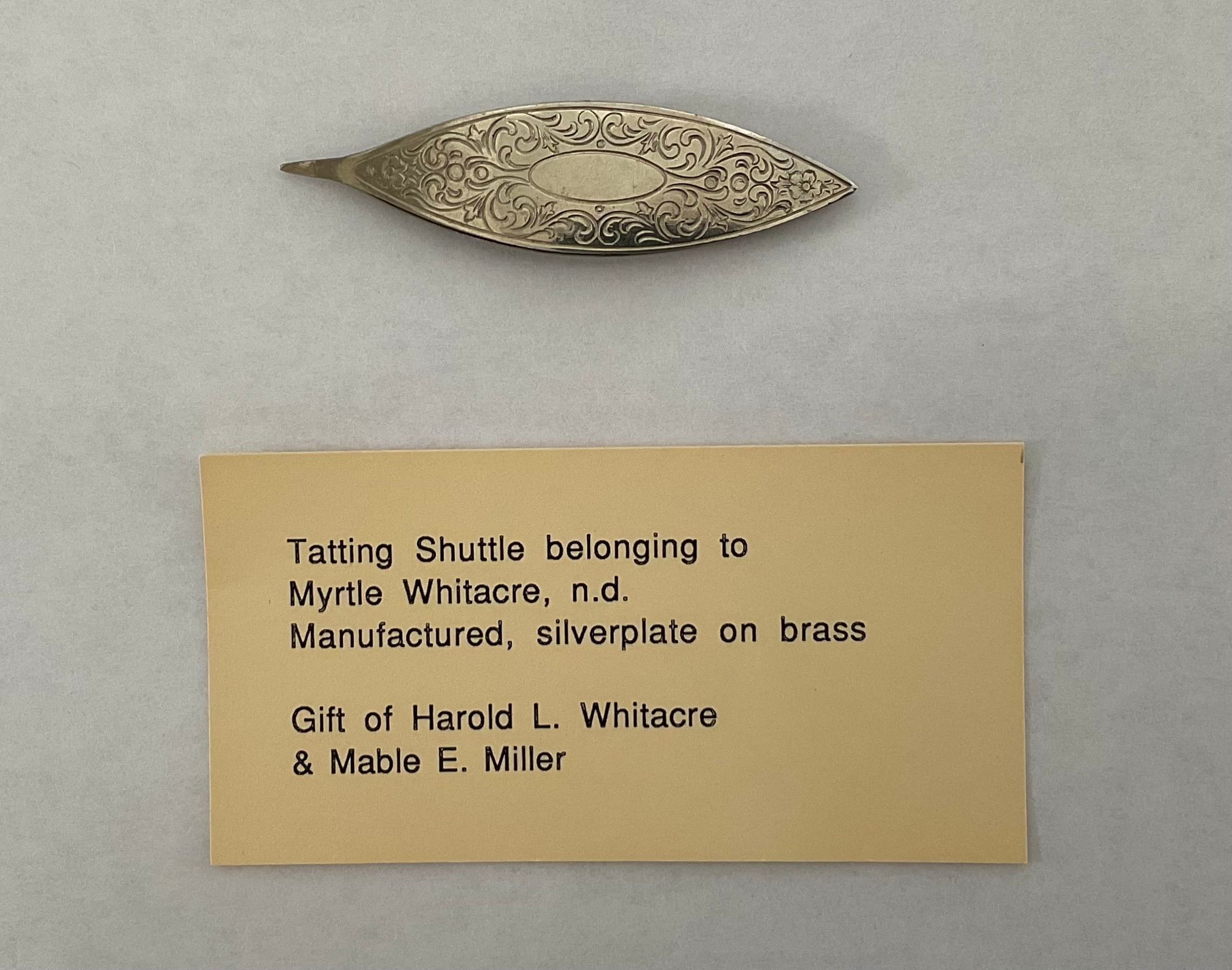 Decorative, manufactured tatting shuttle. Has a pick at one tip. Designs include flowers and leaves at near both tips. Scrolling, center oval, and circles also included. On verso, “GER SILVER” stamped.Collection