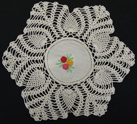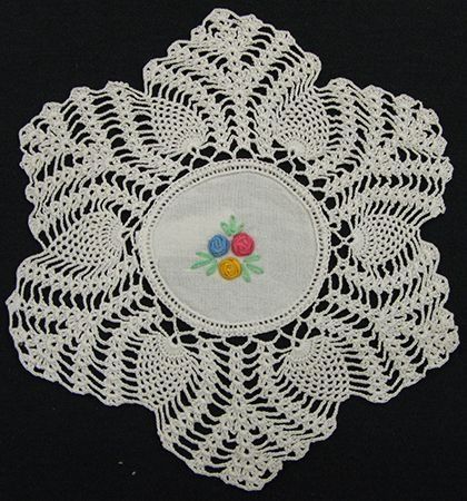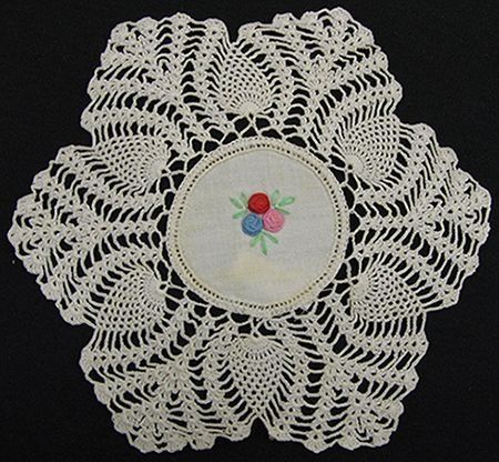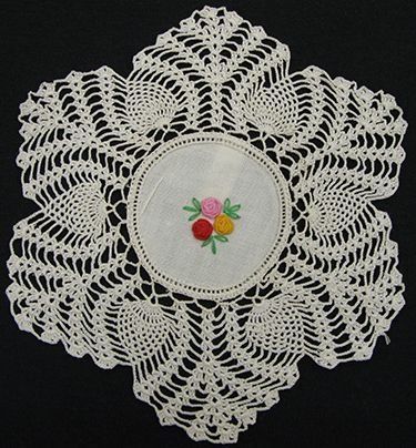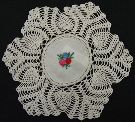 Doily with crocheted edge (flower pattern)- embroidered designs. Pattern: 3 flowers (red, blue, pink, and gold) & leaves (green) in center. "Being personal" in making crocheted doily- by adding colored embroidery in center. Part of set see also #1976.33.1Collection
