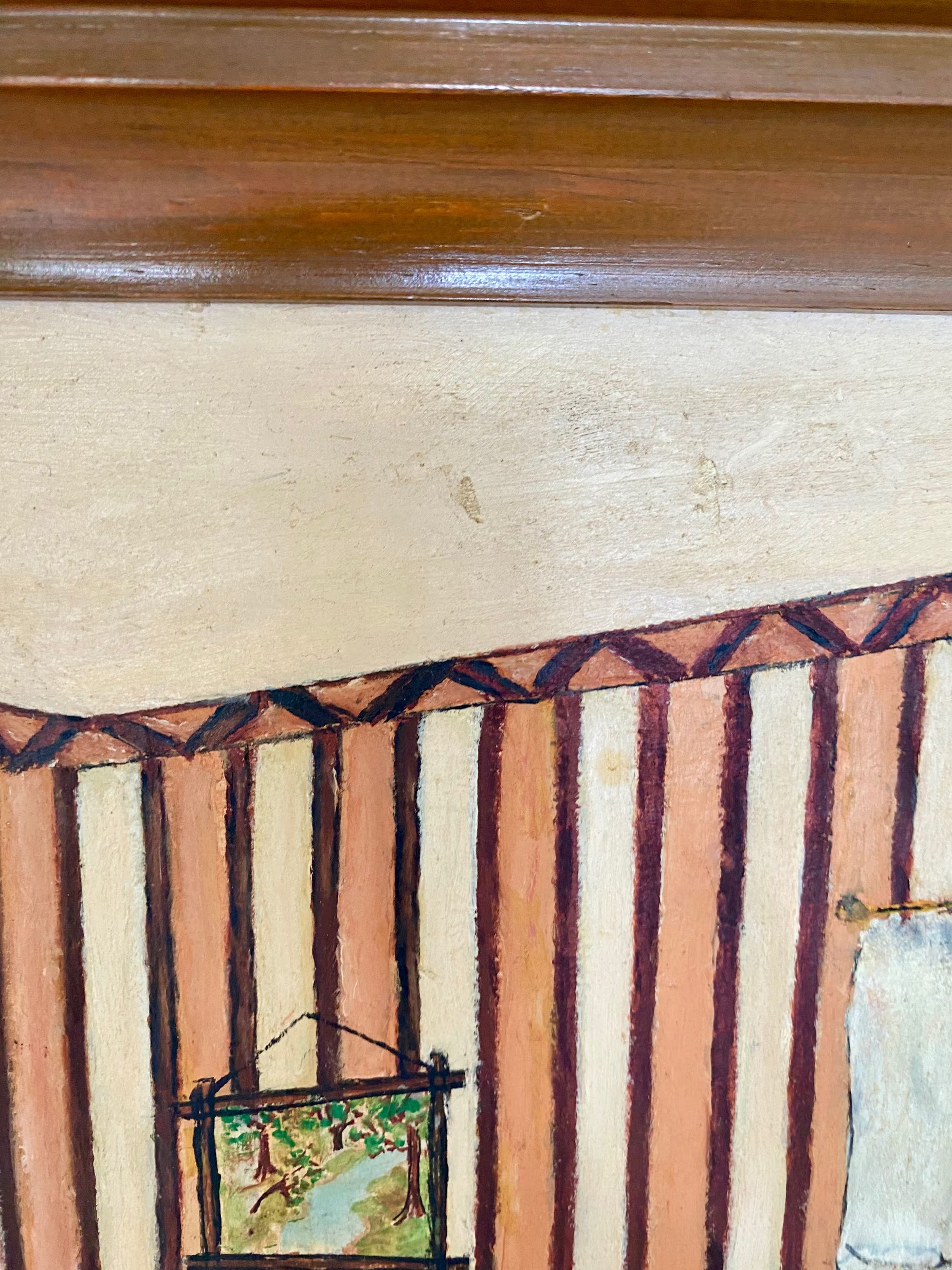 In good/stable condition; painting surface intact, some overall, light surface grime. Frame in good/stable condition; some slight separation at frame mitres; overall, surface grime and slight surface abrasion to rails of frame.