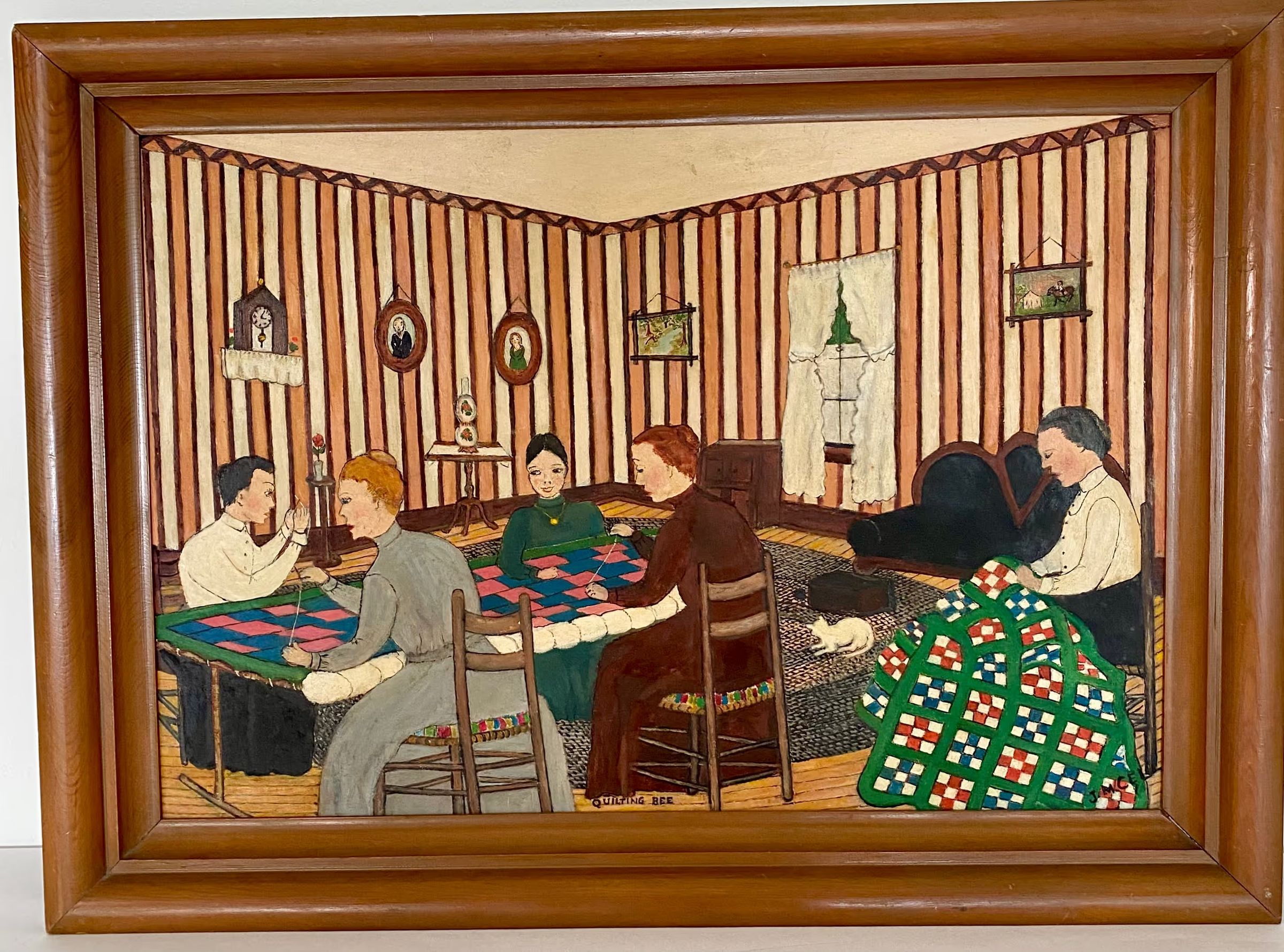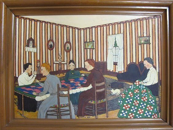 Interior, parlor-like setting of four women and one young man quilting at a table; cat lying on a hooked rug, on the floor.