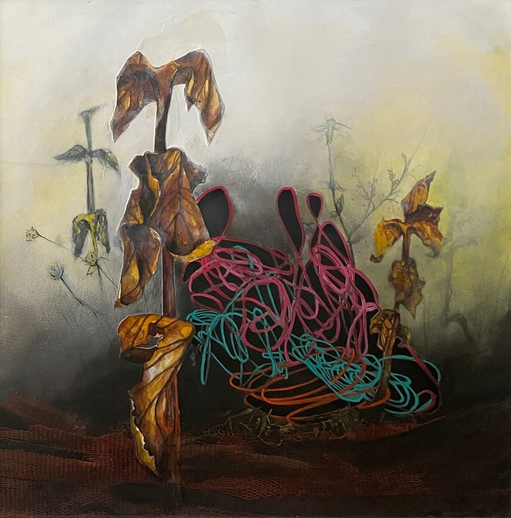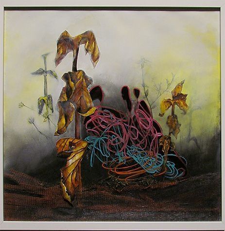 ethereal-like landscape with three sunflower forms; cut-out paper tangled wire; loofa sponge & botanical collage in foreground