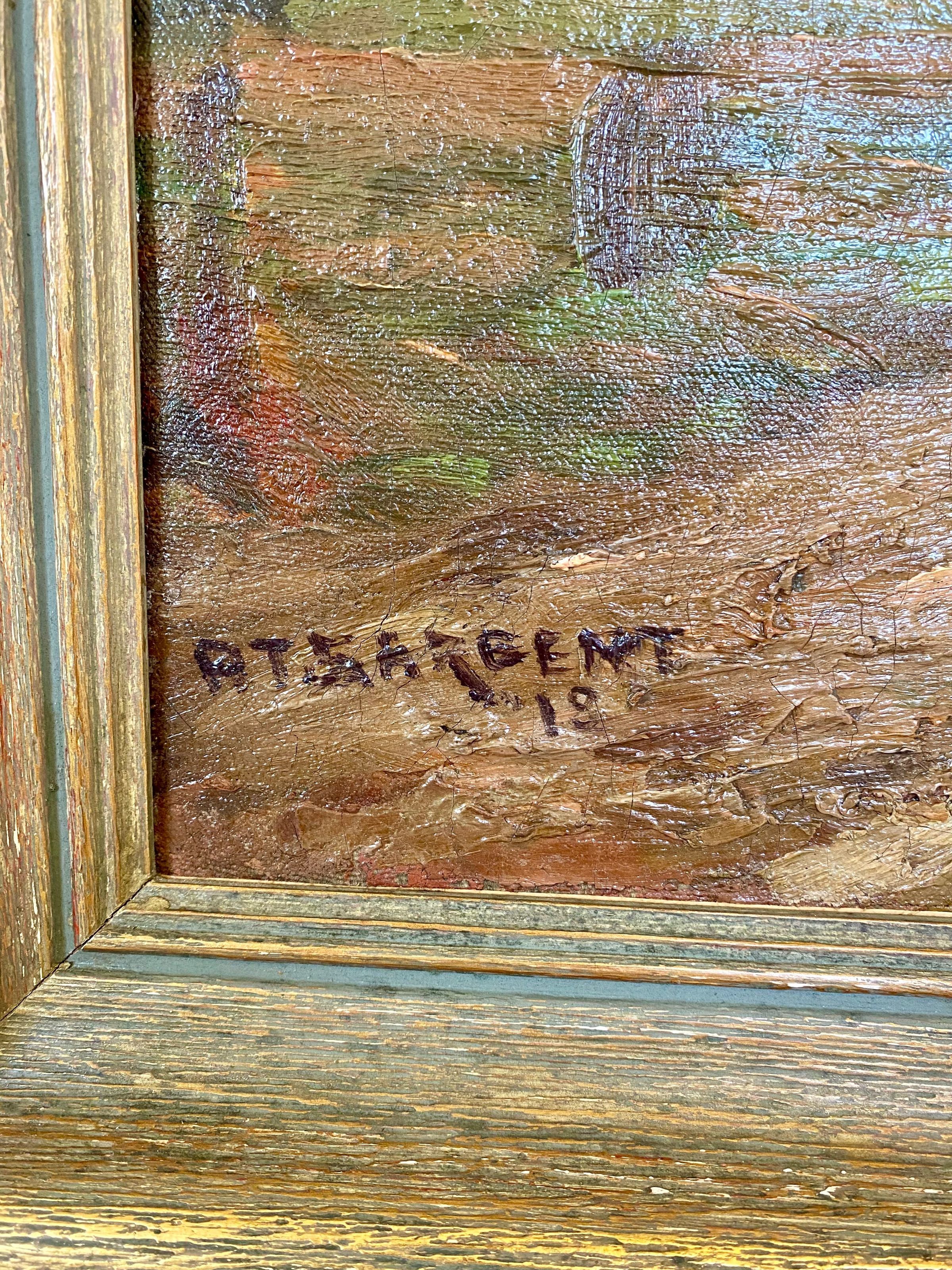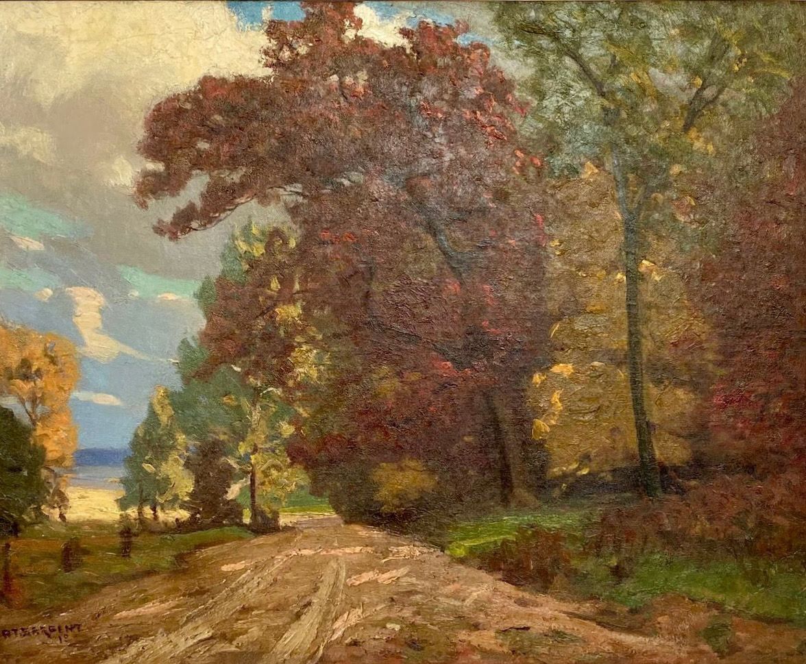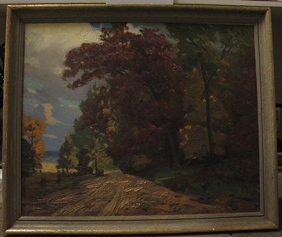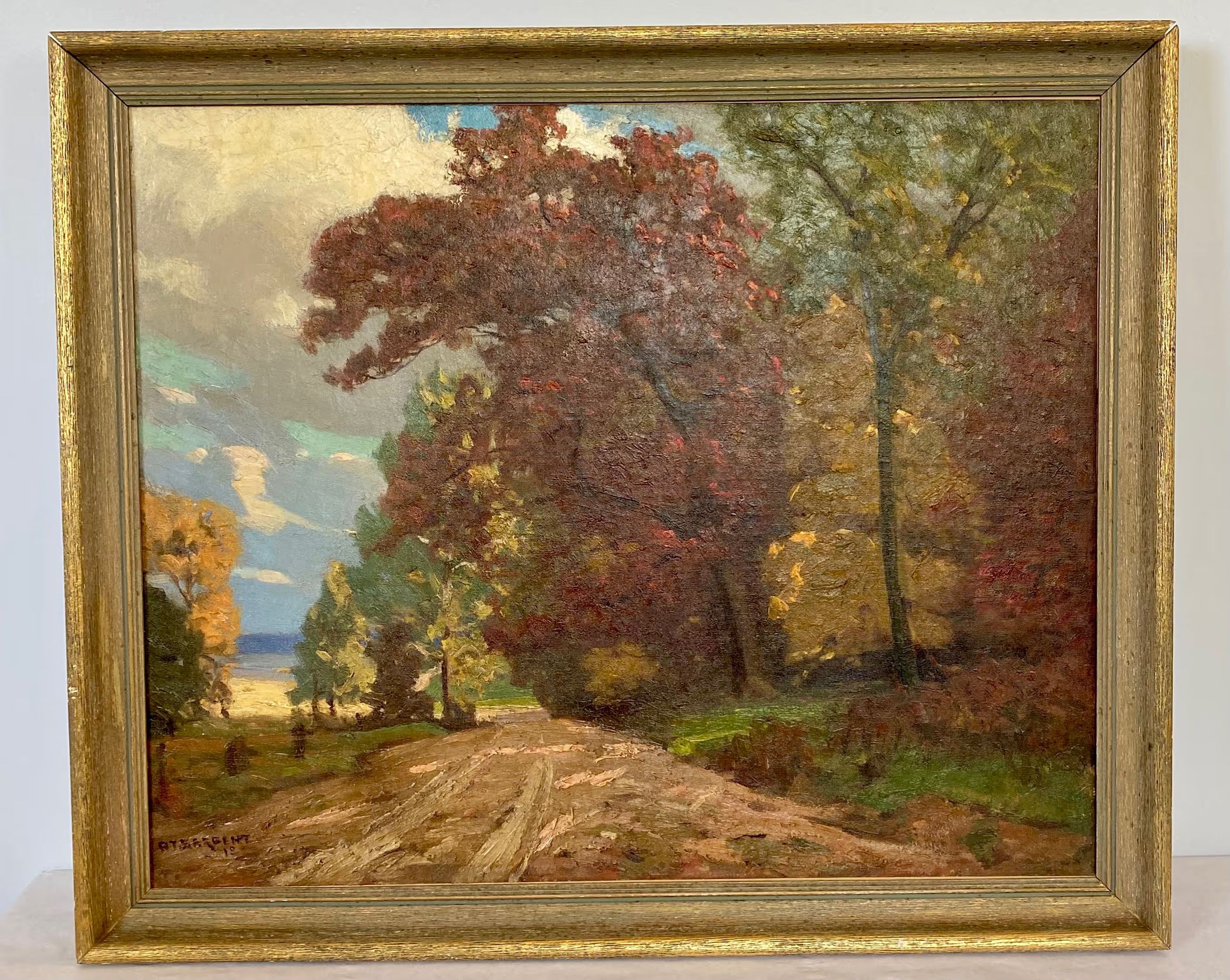 Oil painting of trees with fall foliage, blue cloudy sky, and dirt road. Signed by artist and dated 1918.Collection