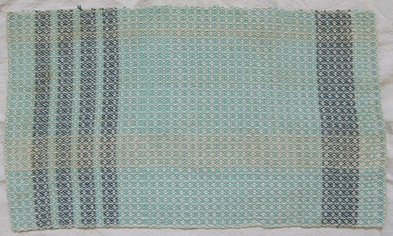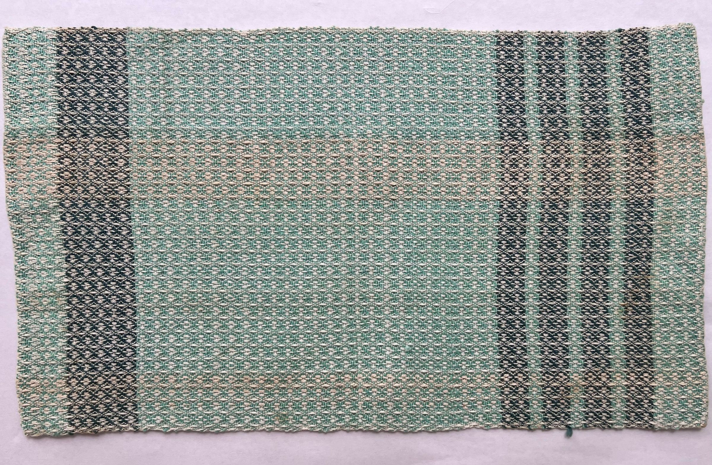Possibly created as a hand towel. May have been made in Tempe, Arizona. Woven off-white, white, green, and dark green threads. Dark green threads used to make vertical stripes, three on the left and one thick stripe on the right. Off white threads used to make horizontal stripes, one thin stripe on the top and thick stripe on the bottom. Hand stitching on verso were seems are located on the left and right.Collection