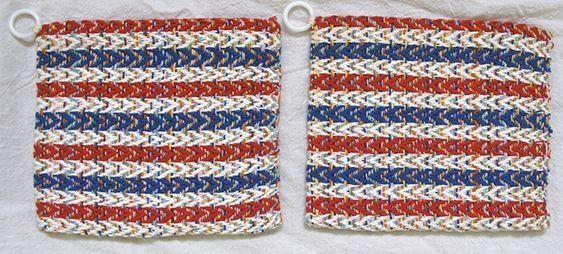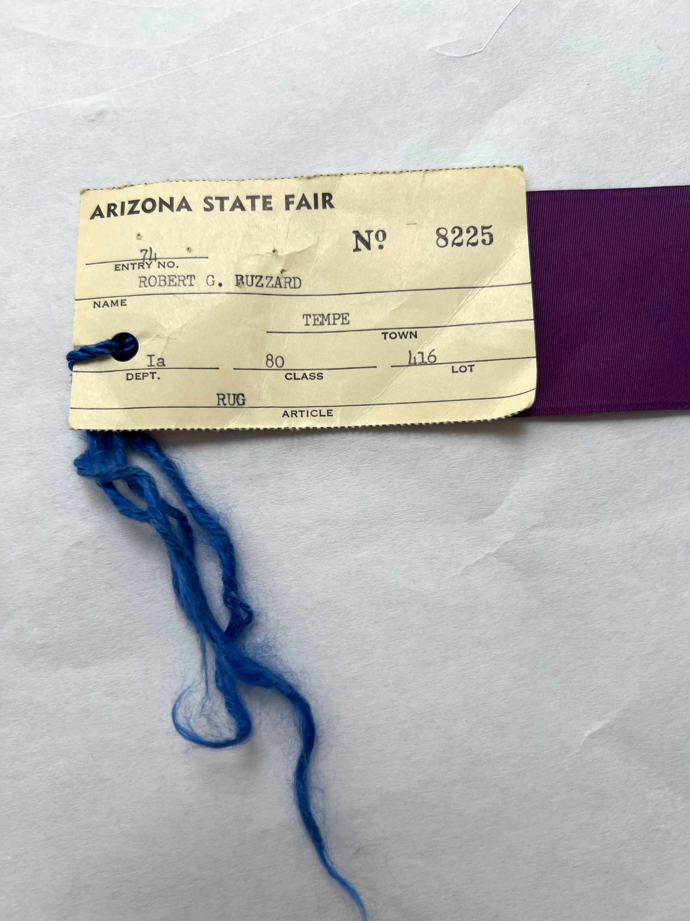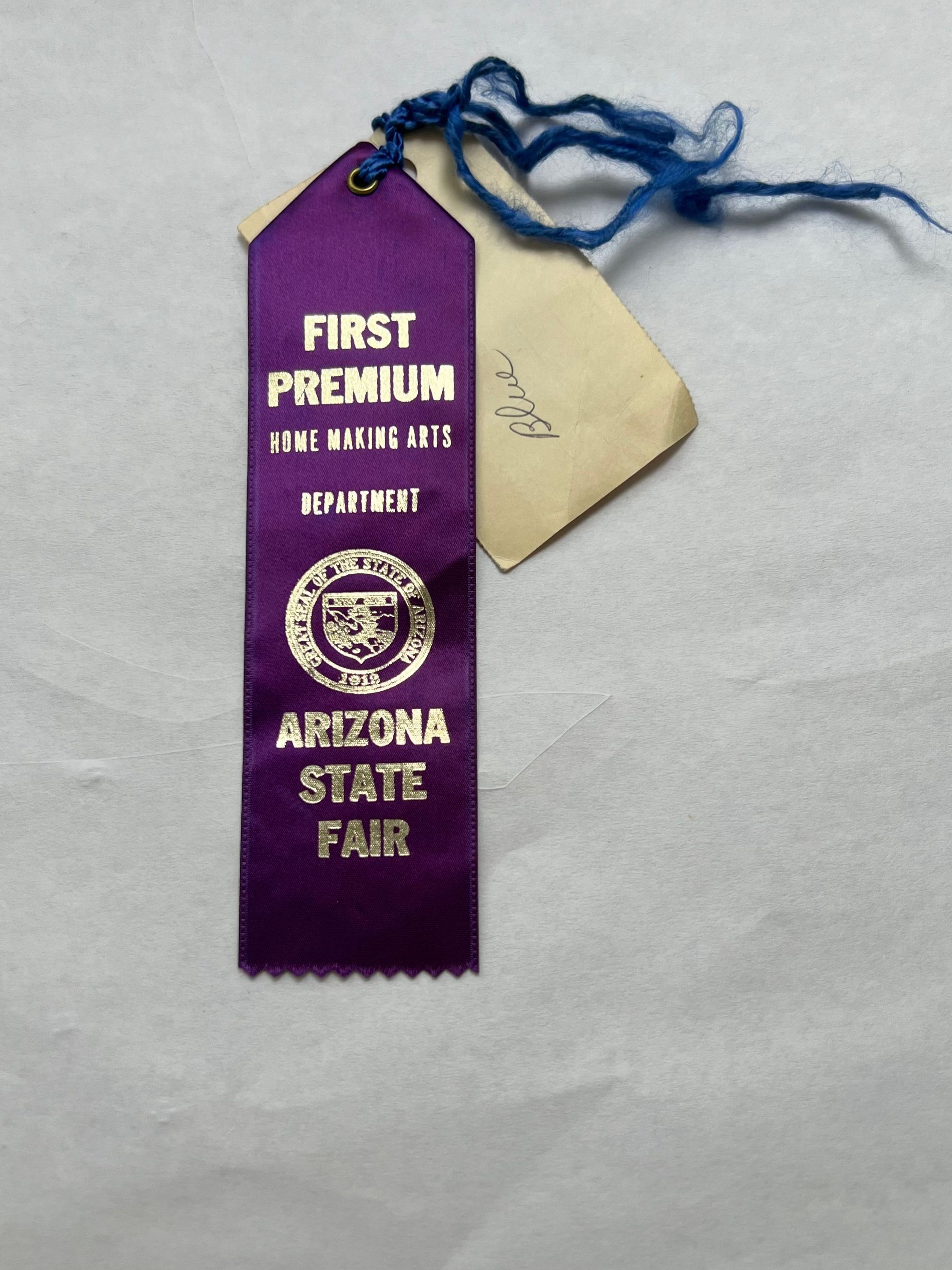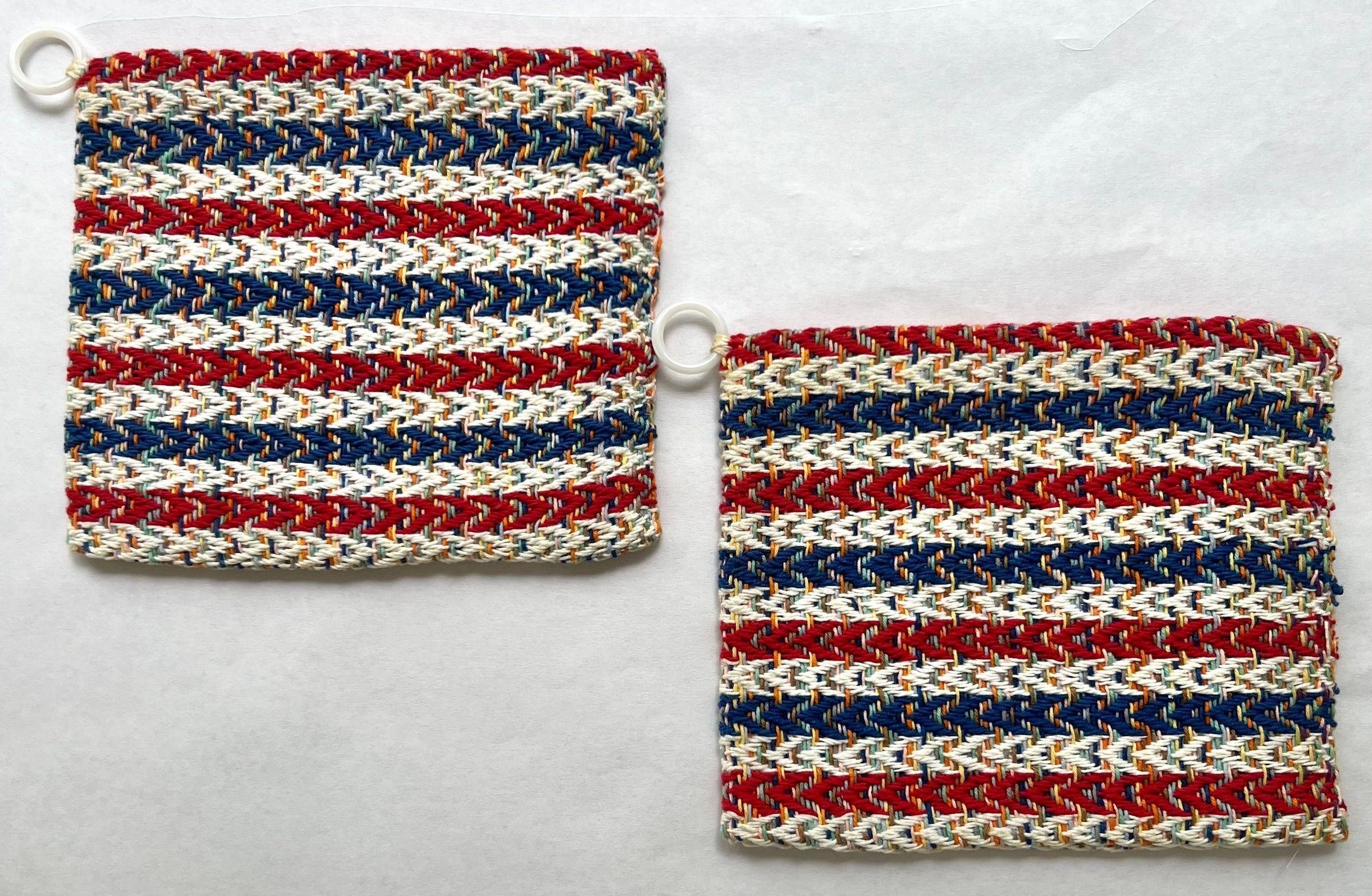 Two woven potholders made in Arizona, possibly Tempe. Colored with red, white, and blue stripes with multicolored (orange, pink, brown, blue, yellow, gray, green, and light blue) strings in between. Small plastic, circle handle on corner and hand stitching on side opposite the plastic circle handle. Attached with undated purple ribbon with print, “First Premium Home Making Arts Department Arizona State Fair.”Collection