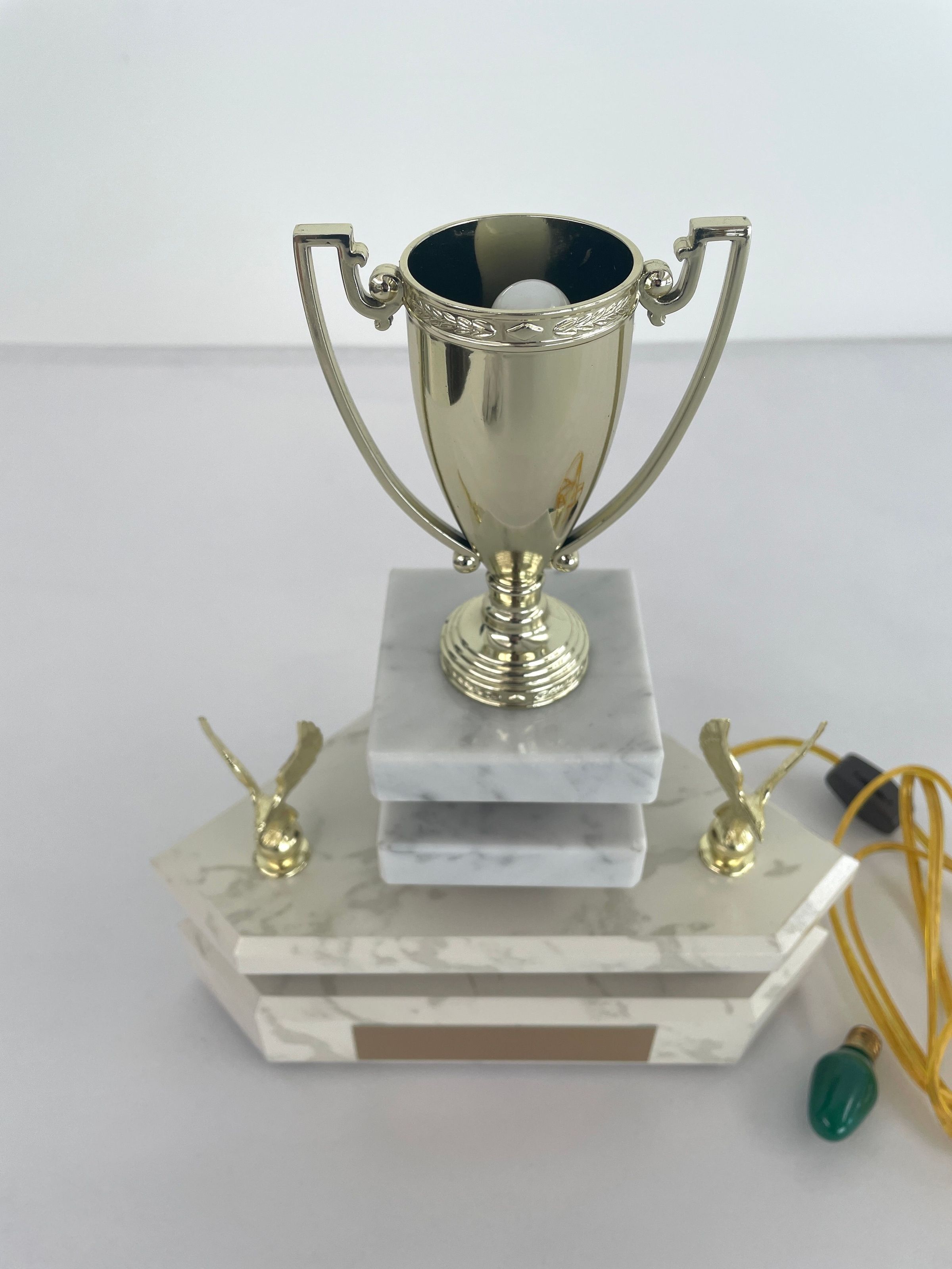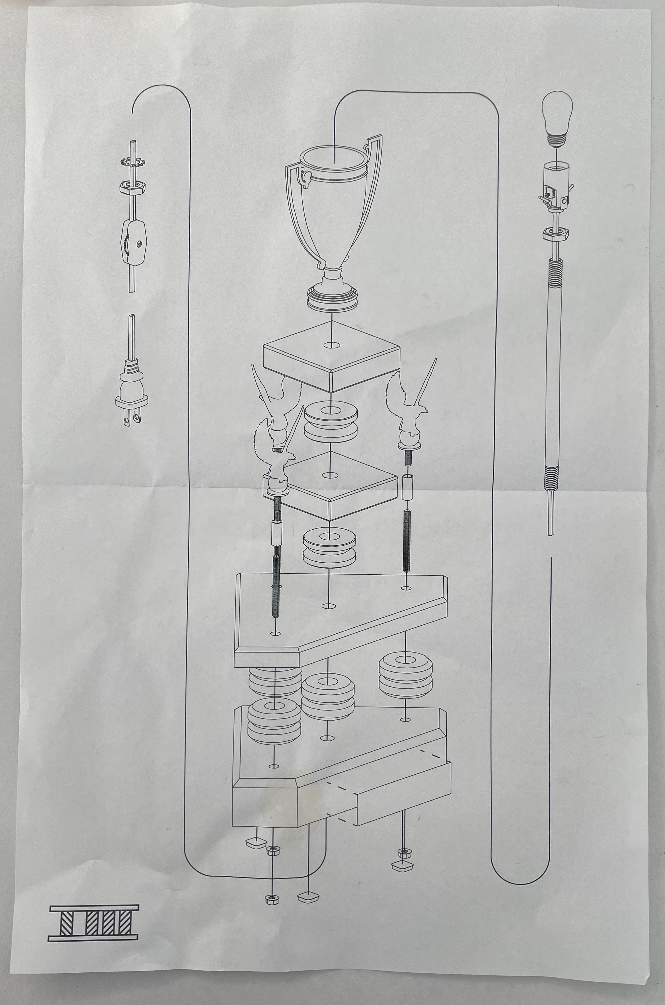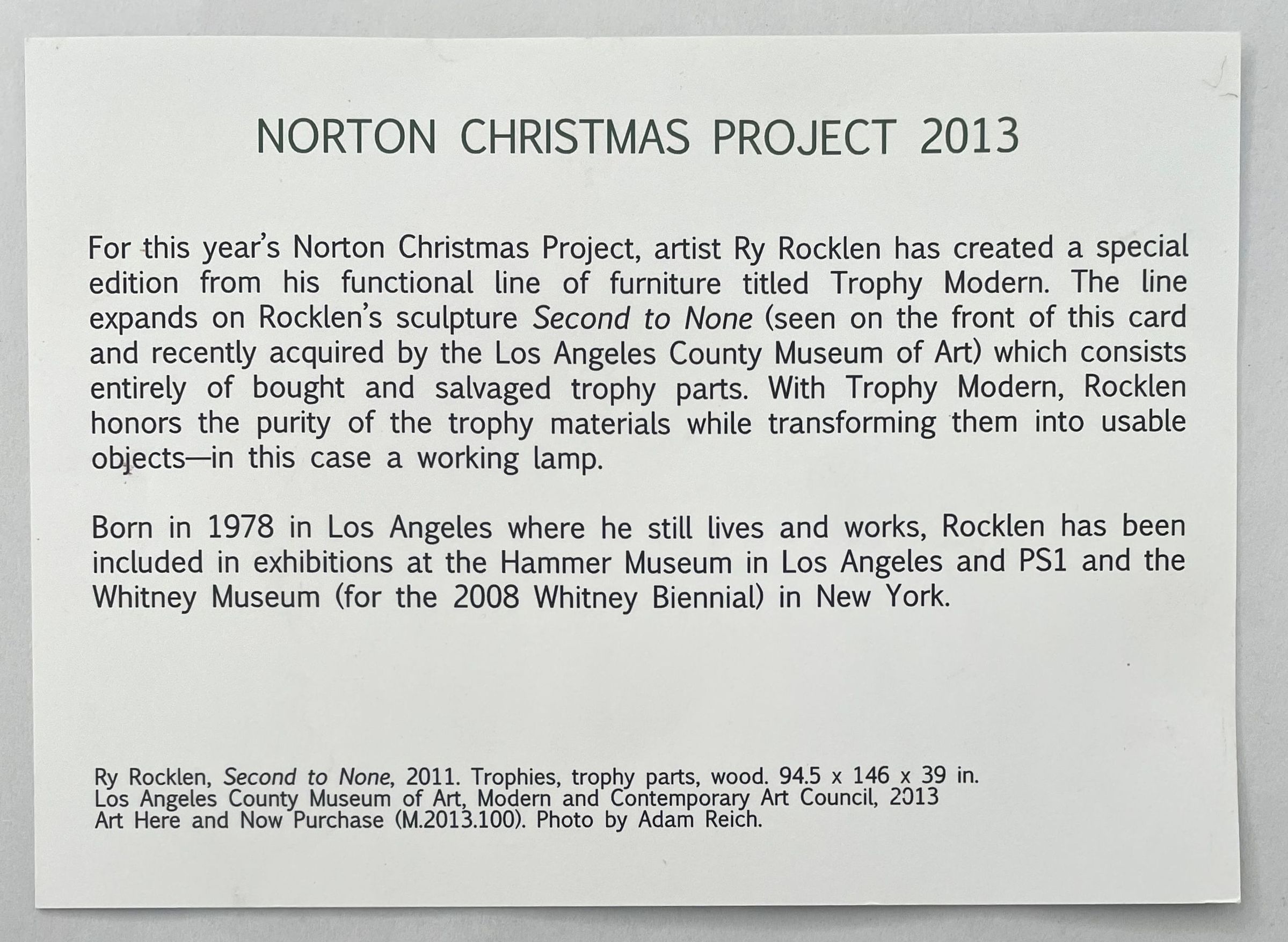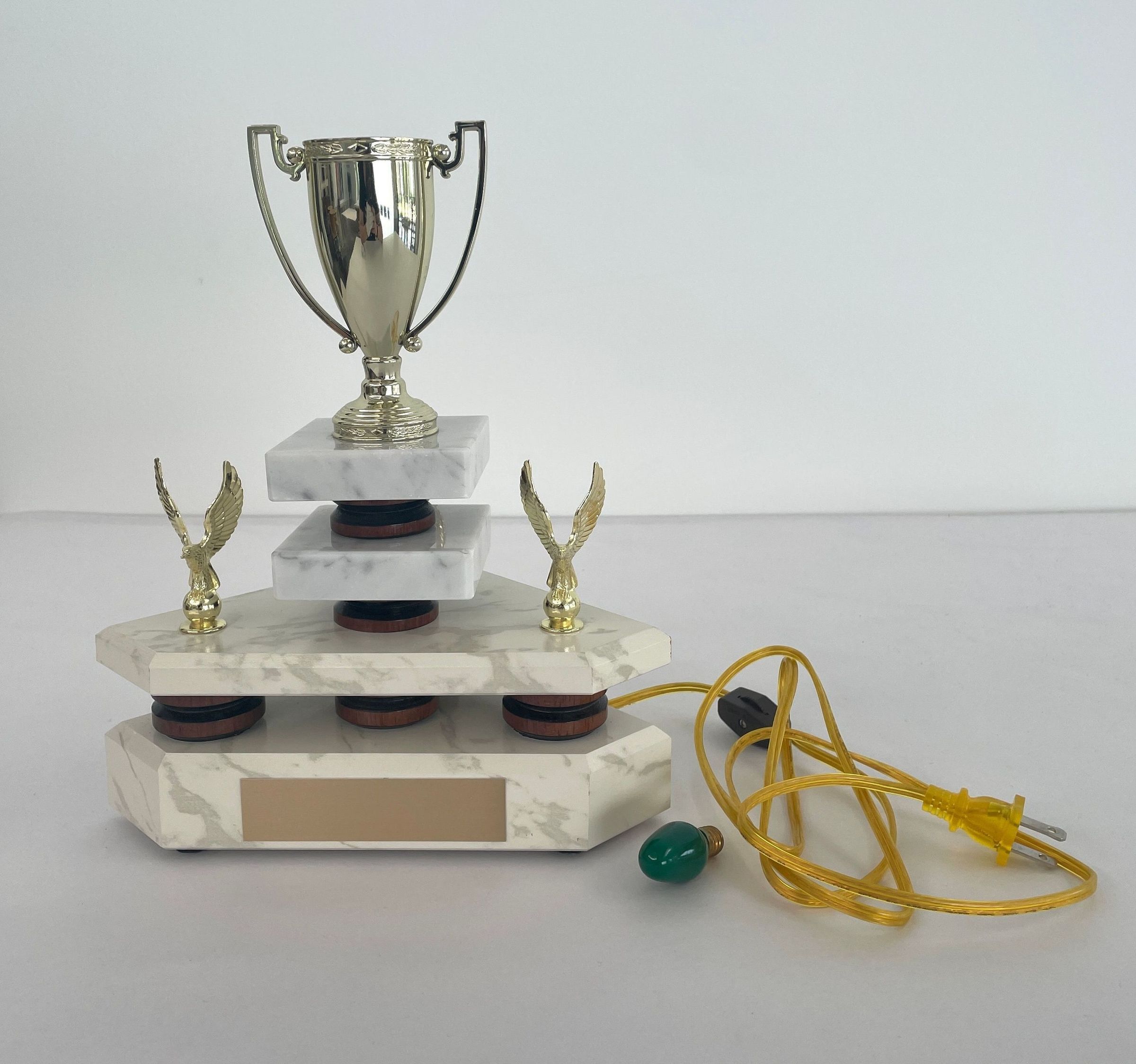 A lamp made of gold-colored trophy parts on a triangle base. Four marble-like levels with wood blocks in between. Gold trophy at the top with green light bulb and three gold-colored eagles. Two eagles facing the recto and one on and facing the verso. Metal plate on front. On bottom, there is an electrical cord and sticker says, “Norton Christmas Project 2013 Ry Rocklen”Artwork Details