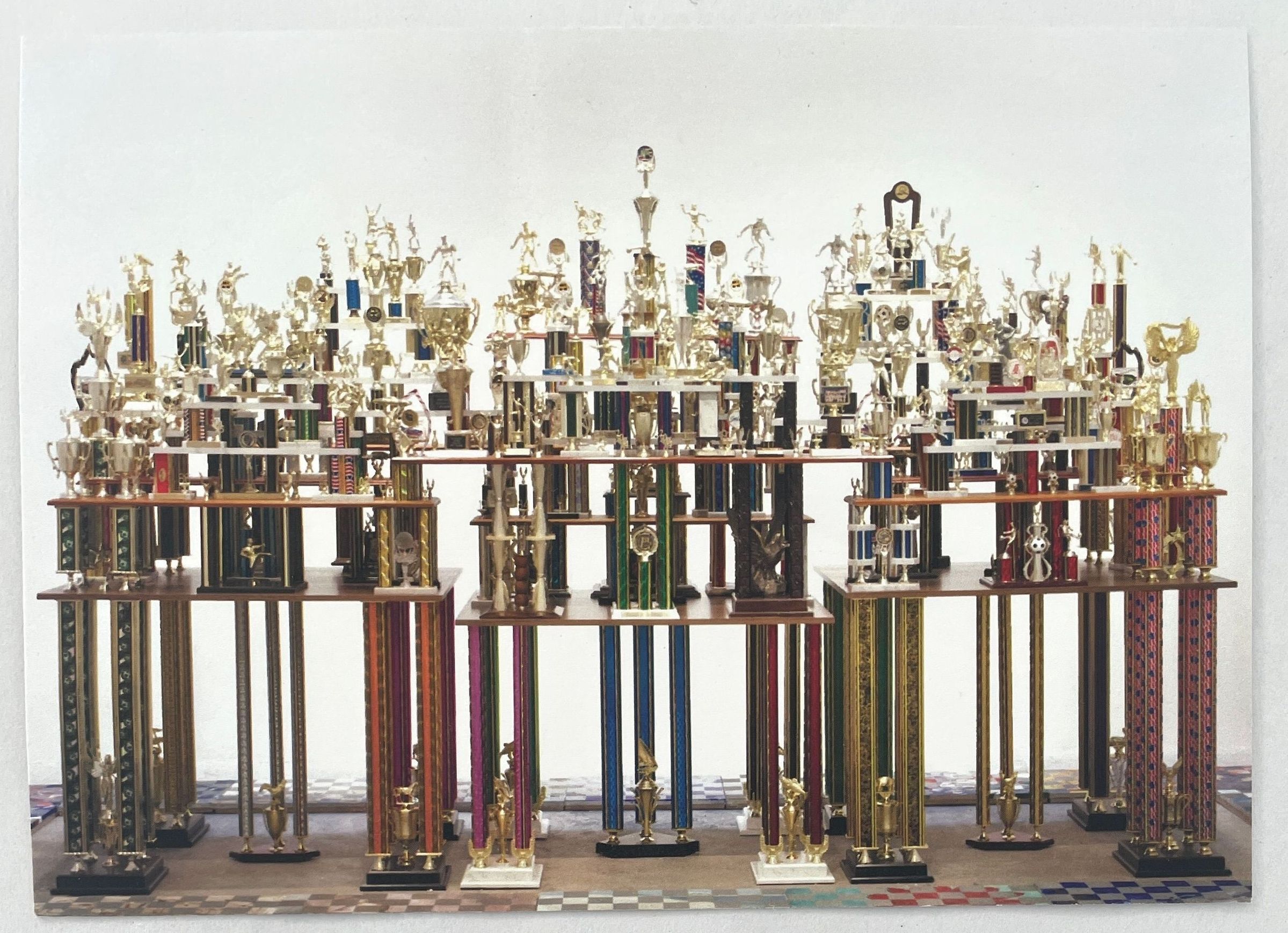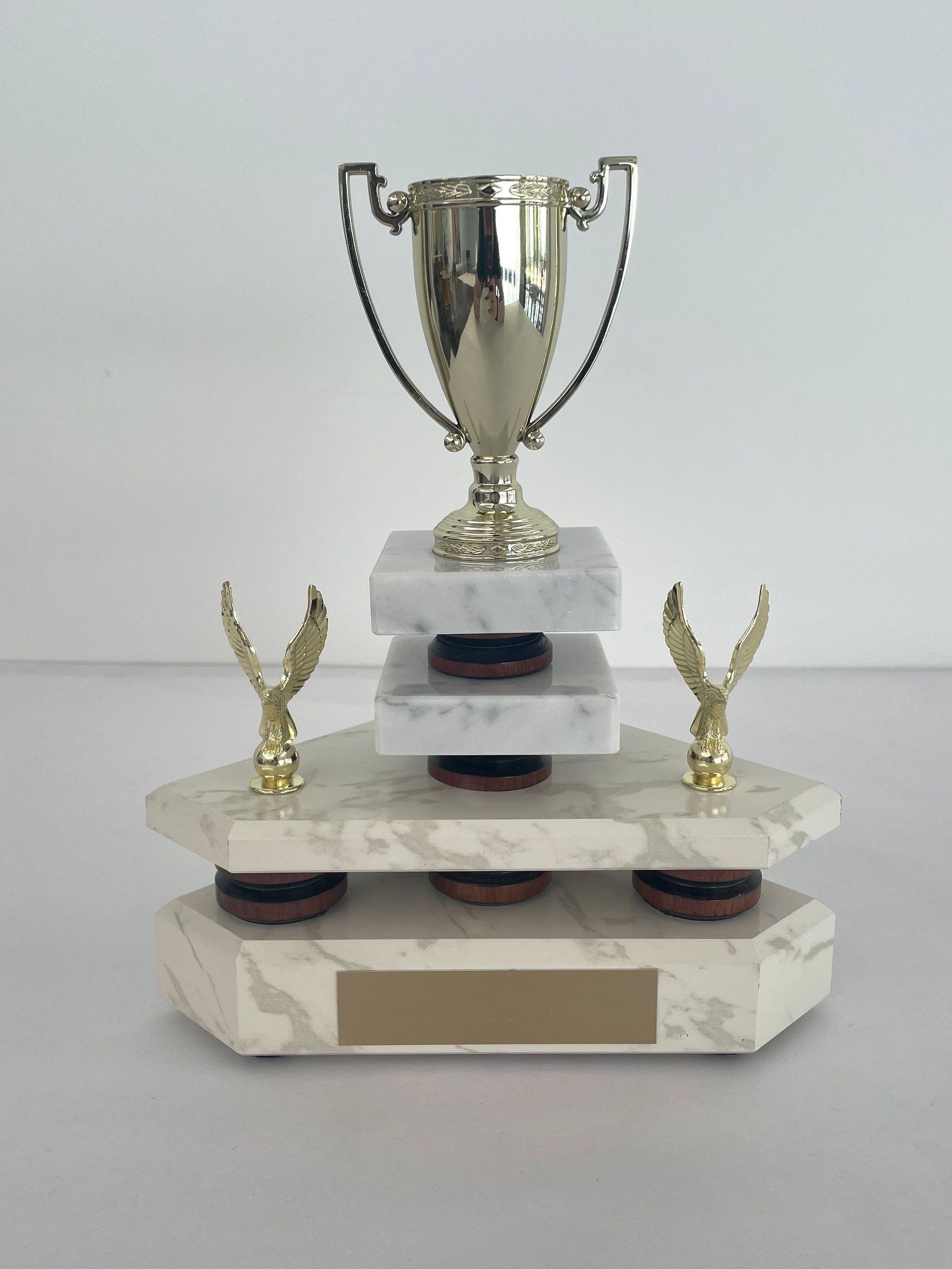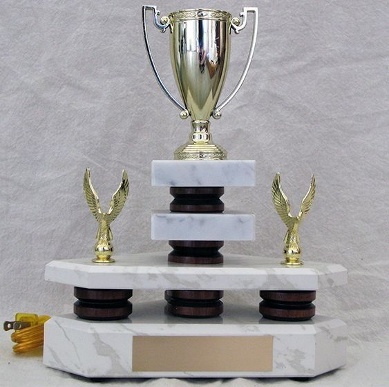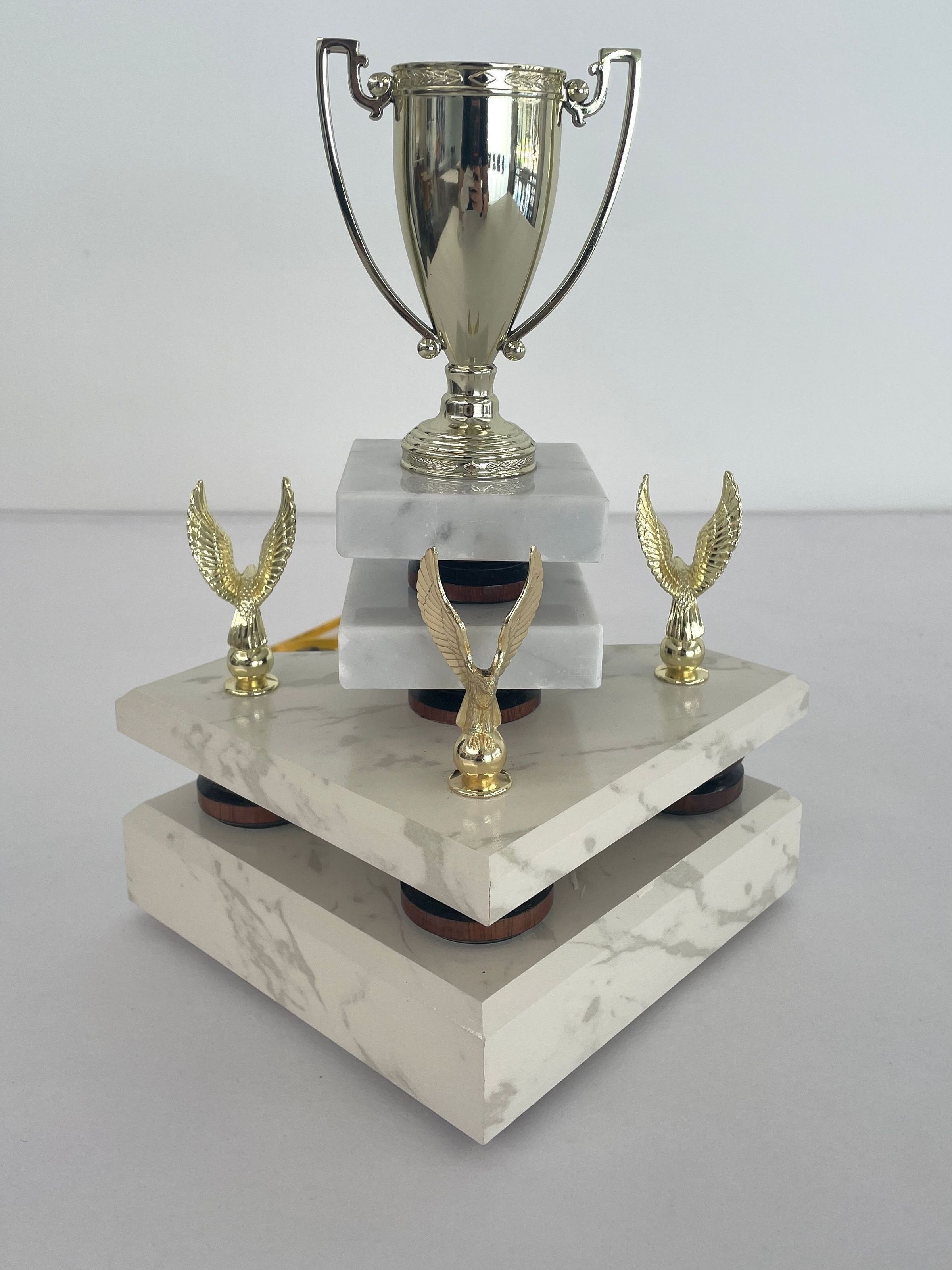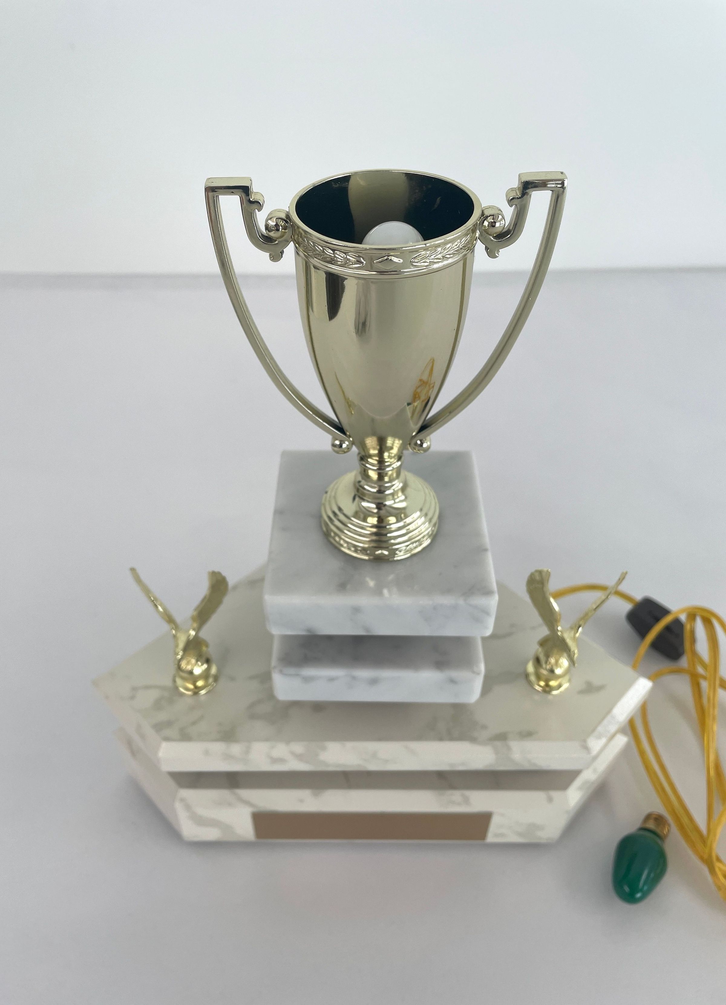A lamp made of gold-colored trophy parts on a triangle base. Four marble-like levels with wood blocks in between. Gold trophy at the top with green light bulb and three gold-colored eagles. Two eagles facing the recto and one on and facing the verso. Metal plate on front. On bottom, there is an electrical cord and sticker says, “Norton Christmas Project 2013 Ry Rocklen”Artwork Details