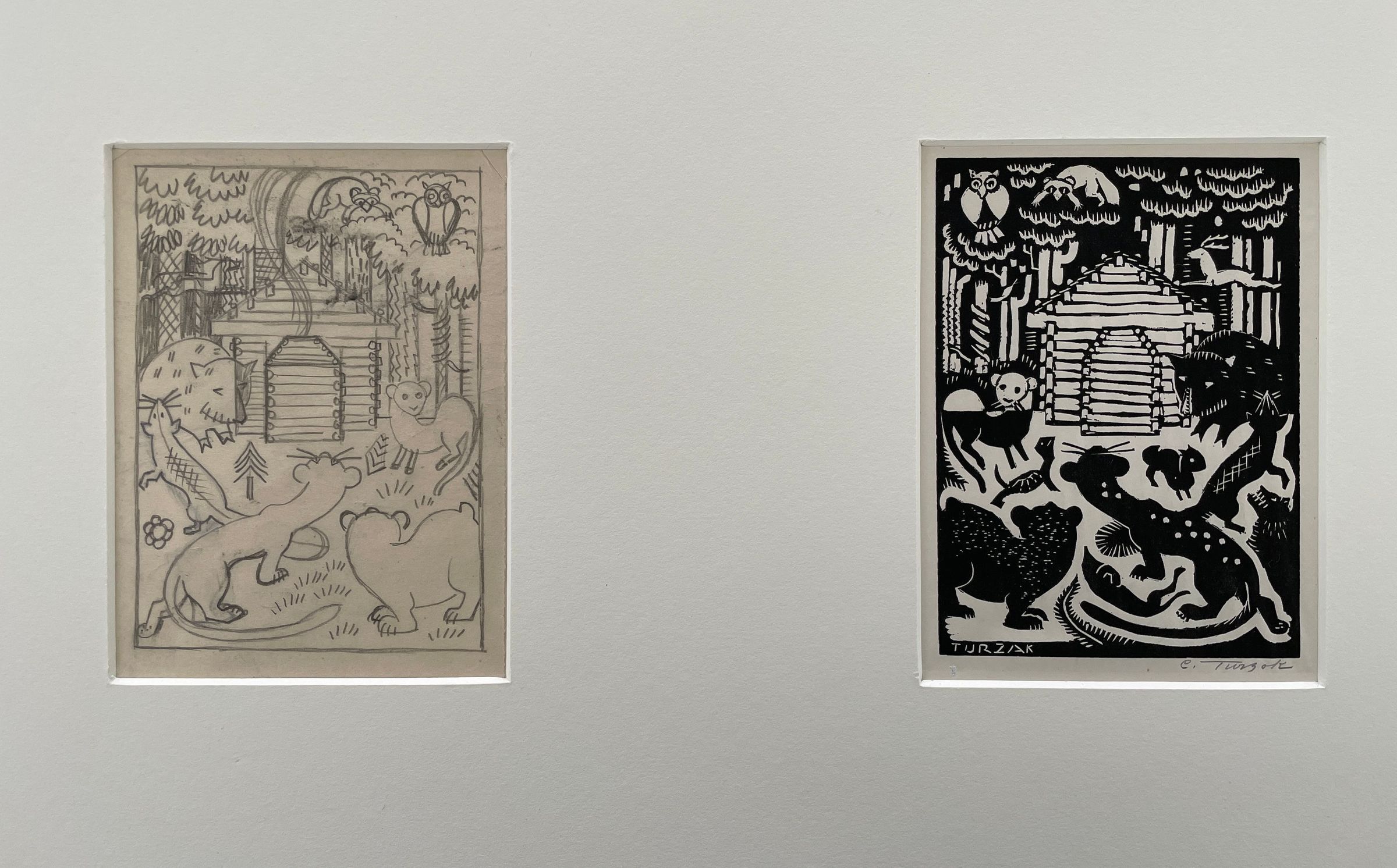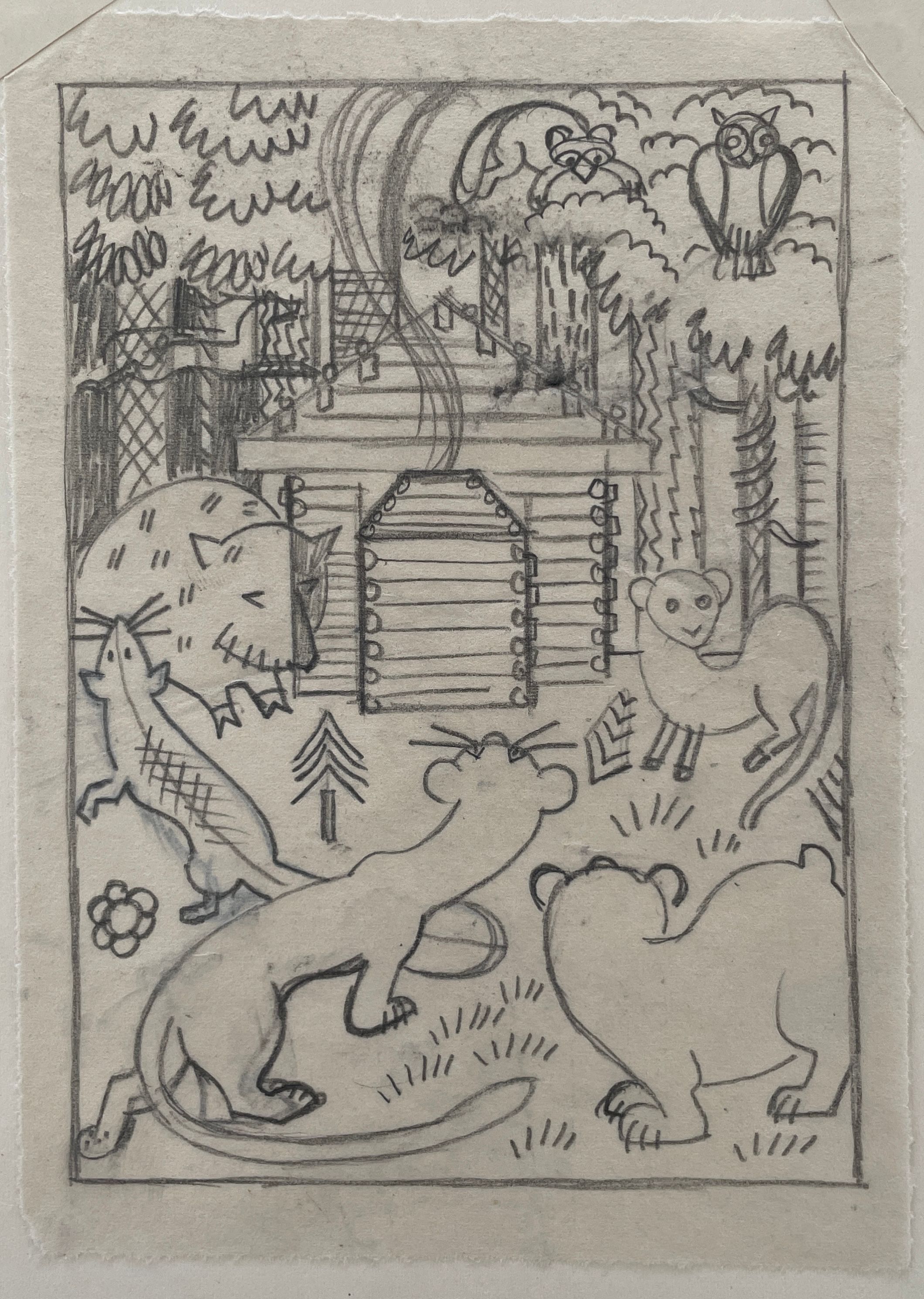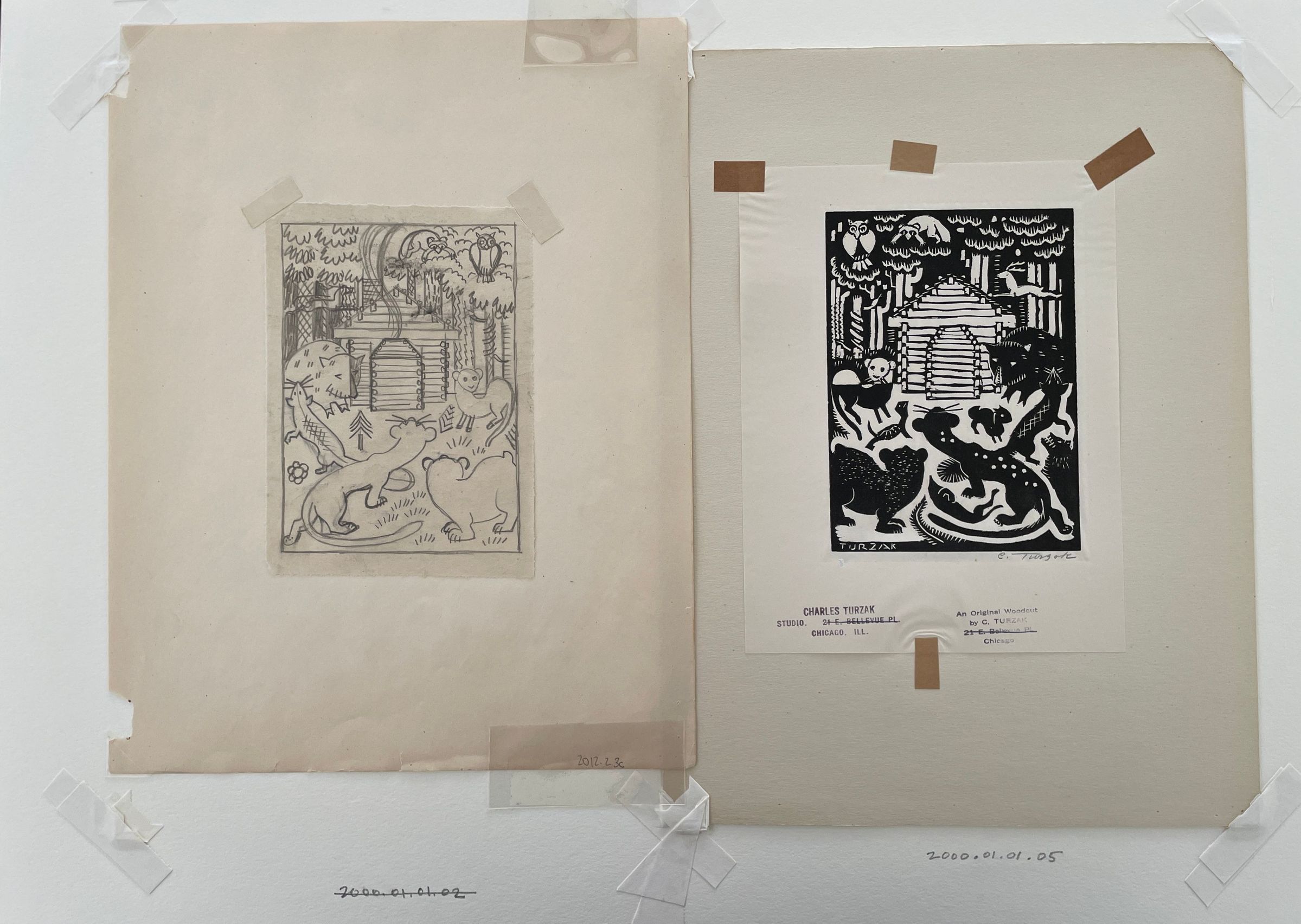 Image depicts a cabin set against a background of trees many animals surround the cabin in the foreground and in the trees. An owl raccooon and antelope/deer in the background turtle squirrel bear cub among others in foreground printed in black ink signed Turzak in lower left corner1933 by Charles Turzak" Printed in the United States at Chicago 1933 during 'A Century of Progress Exposition'"Collection