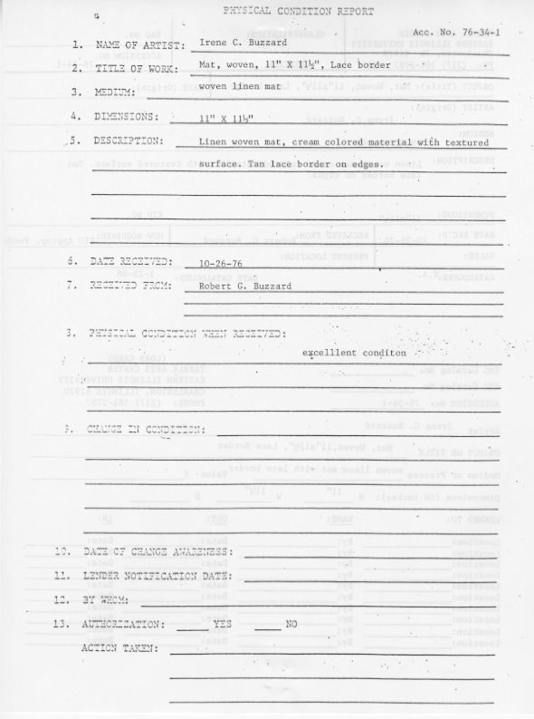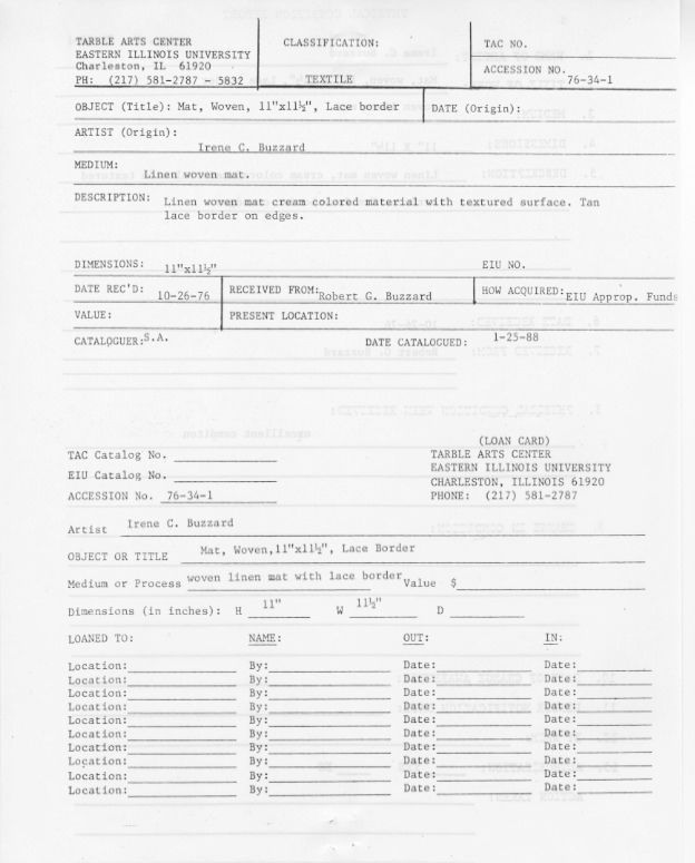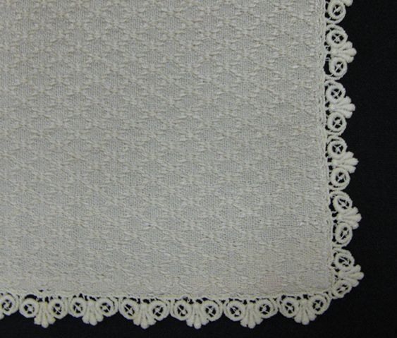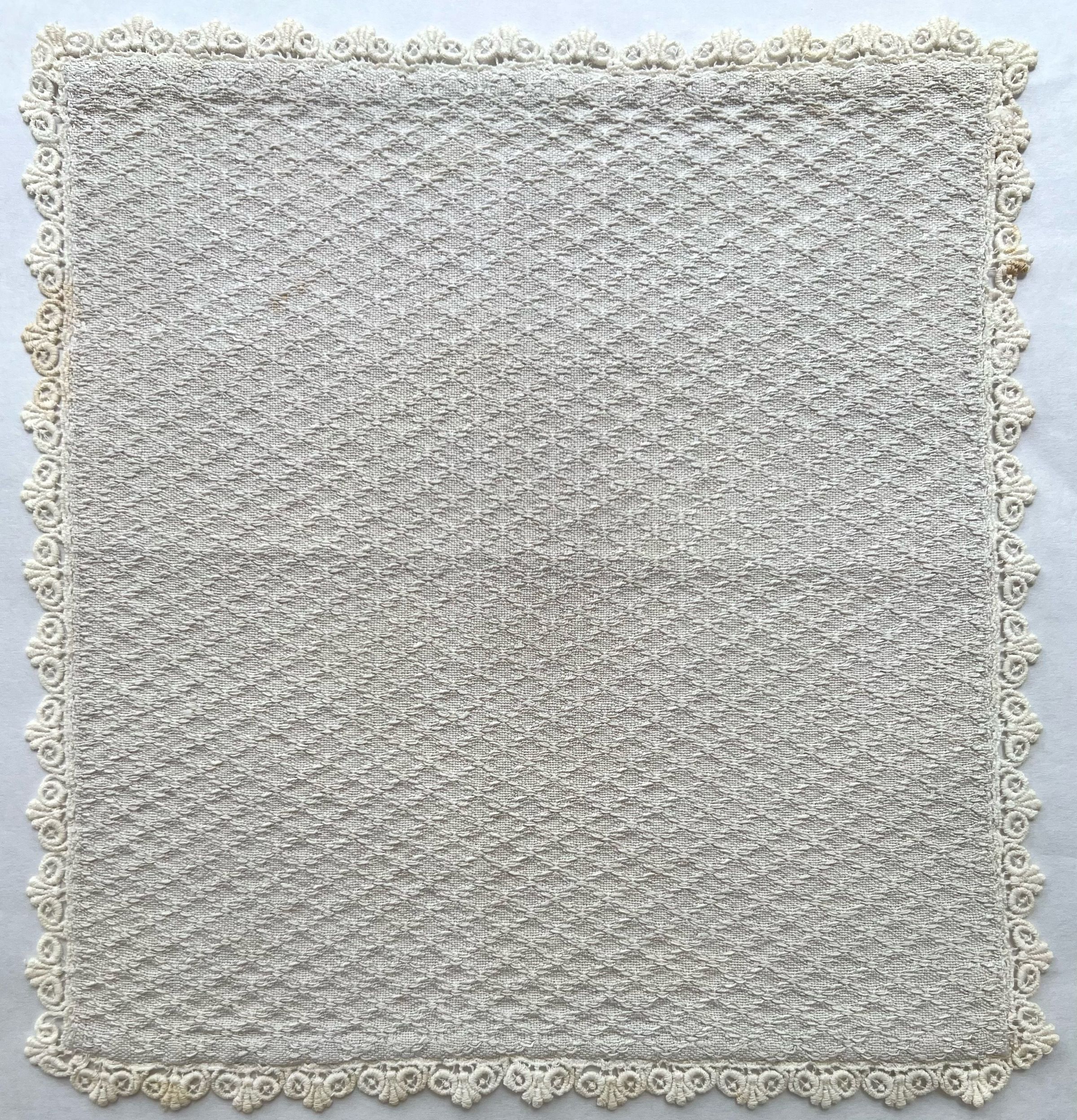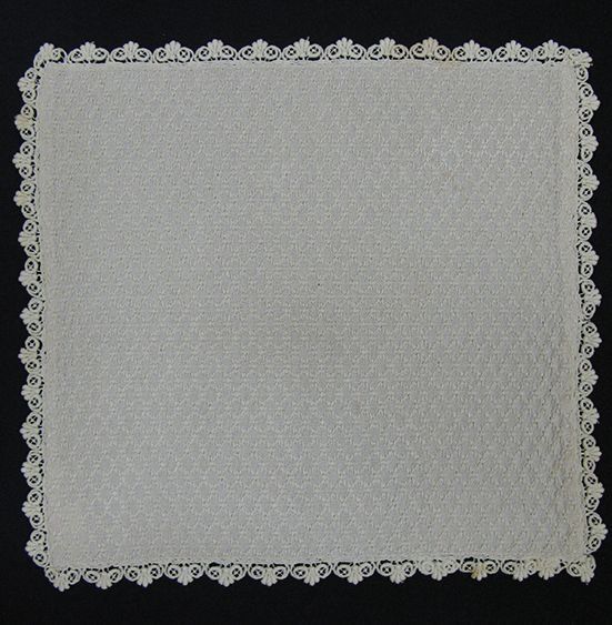 Linen woven mat, cream colored material with diamond textured surface. Raw edges turned under. Tan lace border on edges. 3 leaves with scroll work stitched to edges.Collection