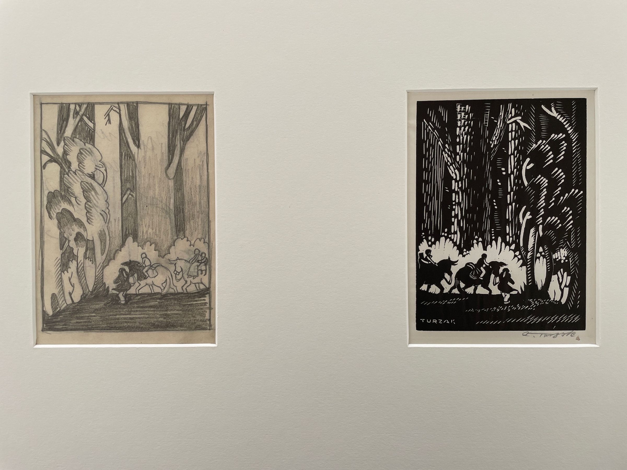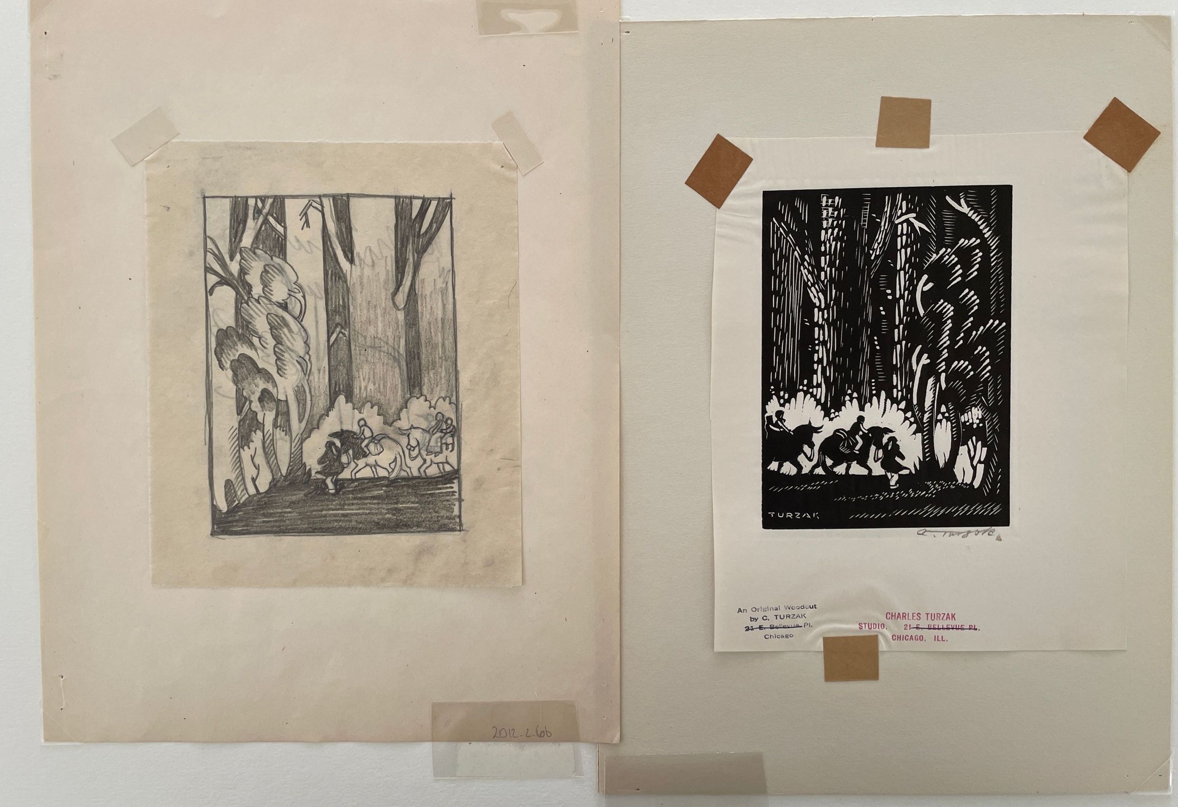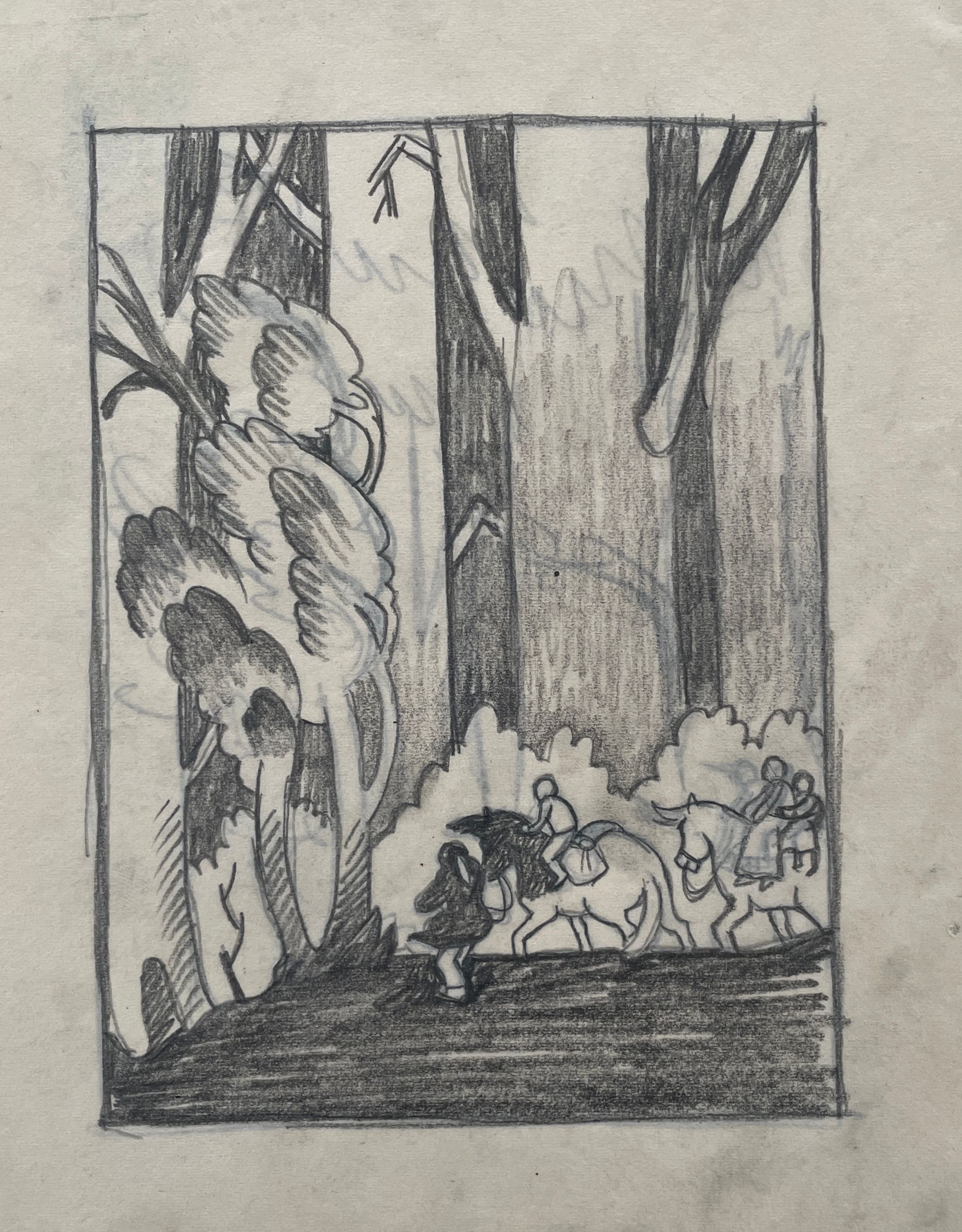 A preliminary rough and composite sketch for "Biography of Abraham Lincoln in Woodcuts". In the lower left corner of the composition figures on horseback walk through a forest large trees tower above them their tops not visible. Printed in the United States at Chicago 1933 during 'A Century of Progress Exposition'"Collection