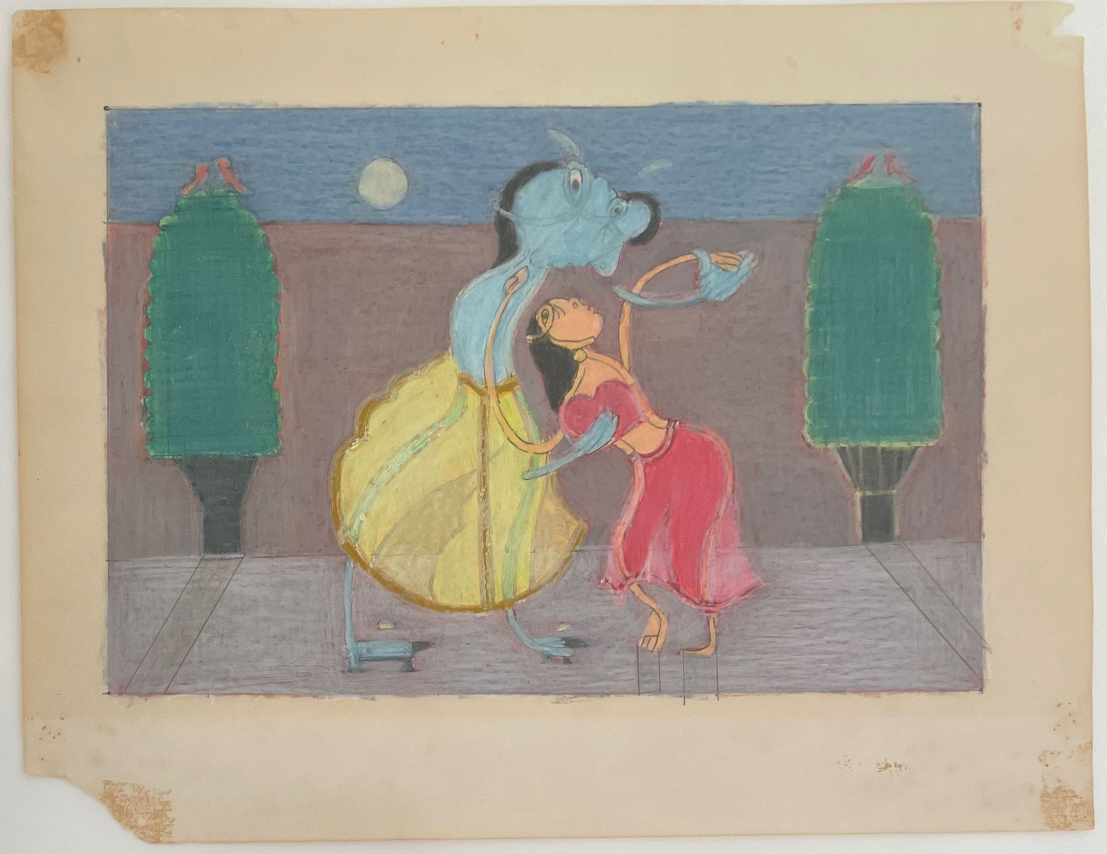 color study for Moon Meet May. Moon is a light blue with a yellow skirt. May is wearing a pink dress. The sky is a dark blue and the wall is a gray. trees in the back are green with no pattern. two red birds sit atop each tree