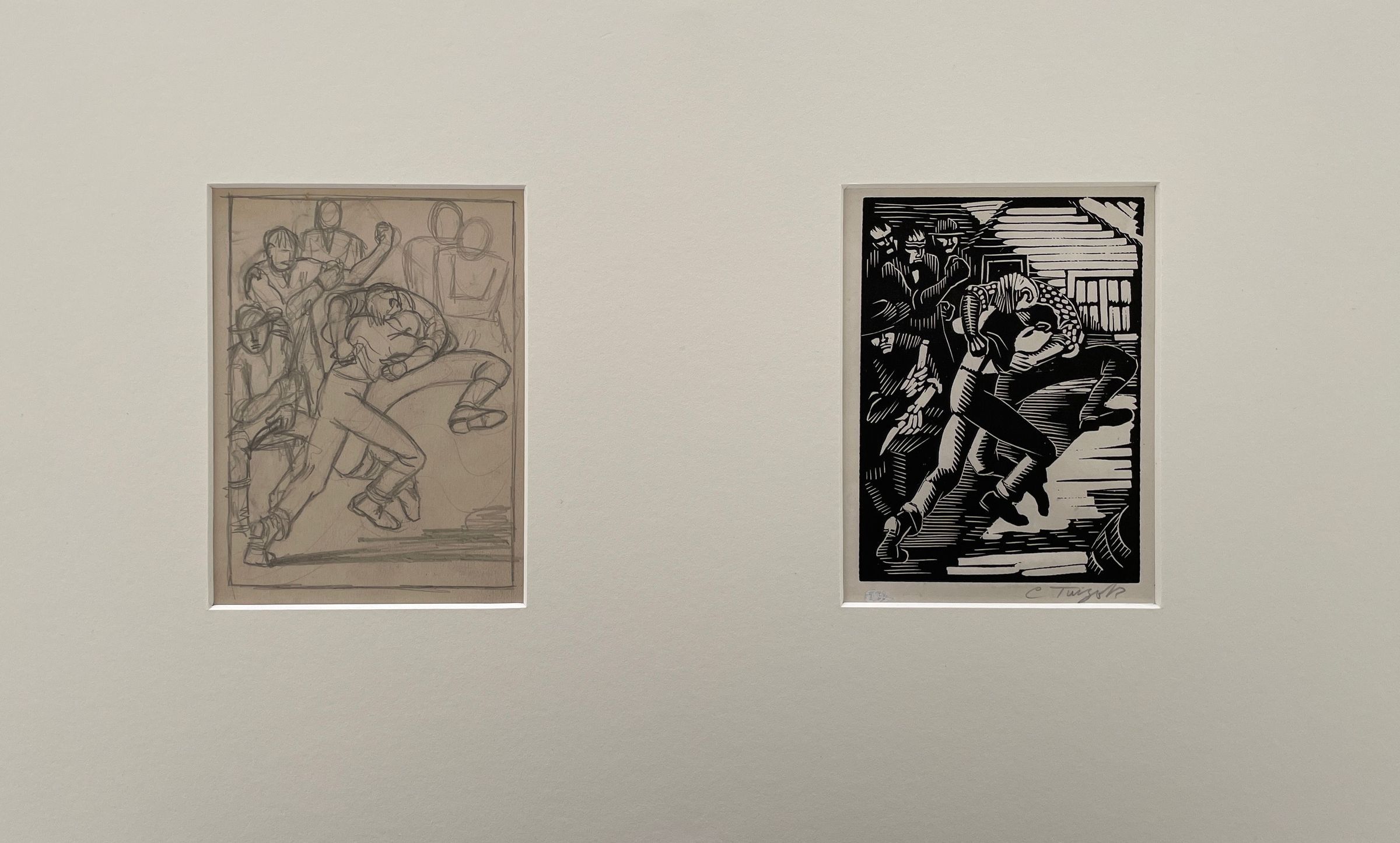 Preliminary rough and composite sketch for "Biography of Abraham Lincoln in Woodcuts". Two figures wrestle while four figures stand to the left of them cheering them on. A building in the background. Printed in the United States at Chicago 1933 during 'A Century of Progress Exposition'"Collection