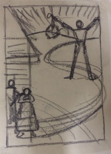 Preliminary rough and composite sketch for "Biography of Abraham Lincoln in Woodcuts". A figure stands on a path arms outstretched silhouetted by the sun in his left arm he holds a spotted bag. The viewer sees the back of two figures standing in the bottom of the page one a woman in tears the other an older man. Printed in the United States at Chicago 1933 during 'A Century of Progress Exposition'"Collection