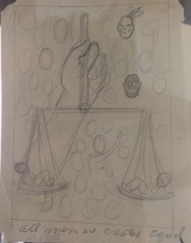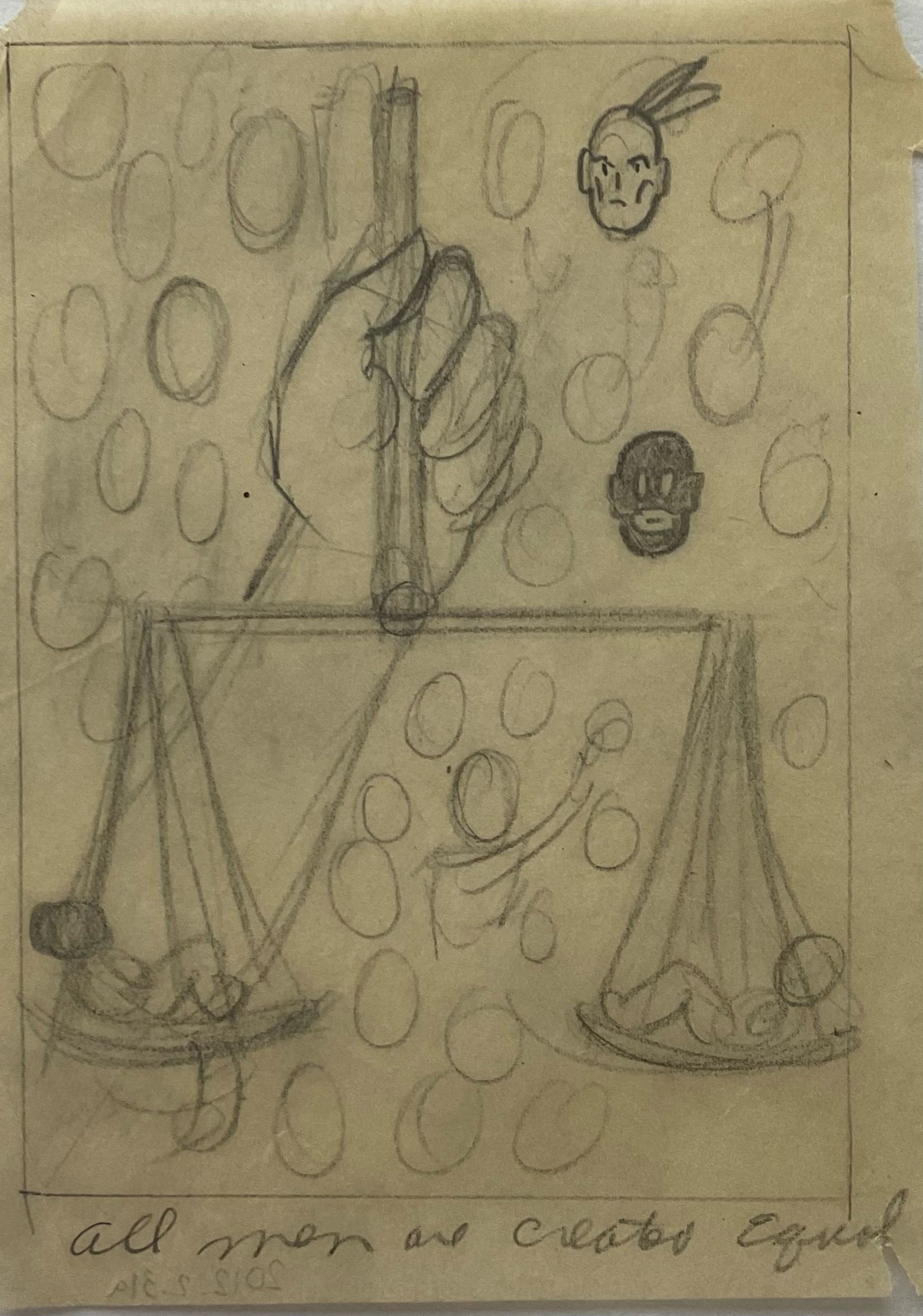 Preliminary rough and composite sketch for "Biography of Abraham Lincoln in Woodcuts". In the foreground a hand hold a pair of scales with human figures on each side, a quote below reads "all men are created equal". Printed in the United States at Chicago 1933 during 'A Century of Progress Exposition'"Collection