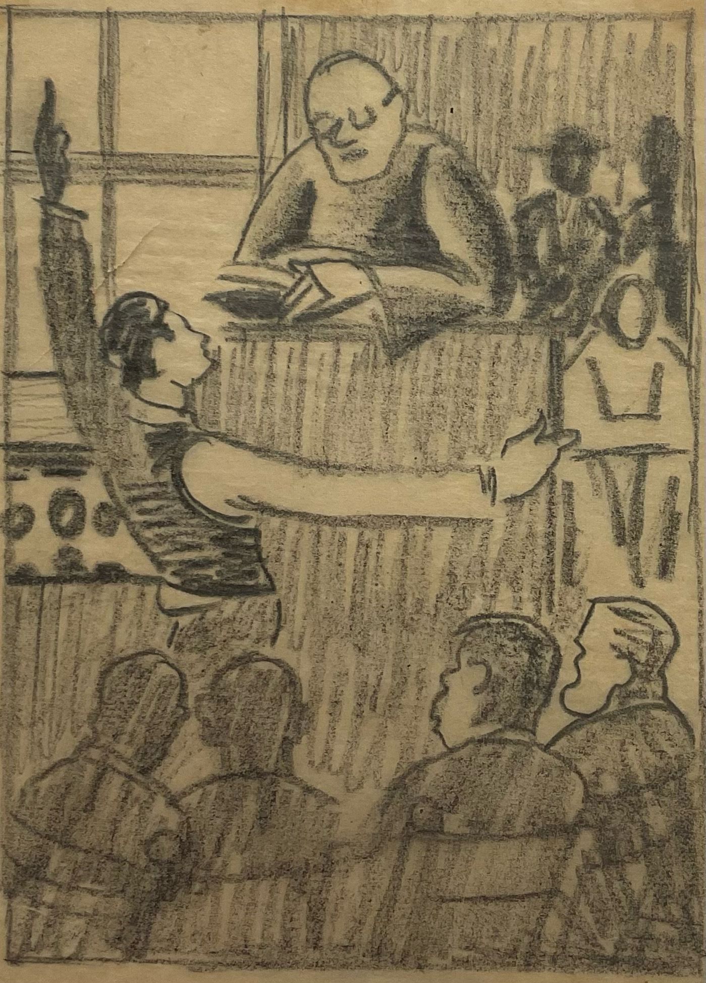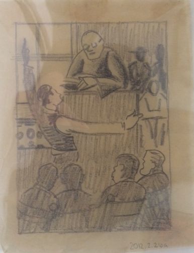 Preliminary rough and composite sketch for "Biography of Abraham Lincoln in Woodcuts". A figure stands in front of a jury with arms outstretched while a judge sits behind a bench looking down at the figure. Printed in the United States at Chicago 1933 during 'A Century of Progress Exposition'"Collection