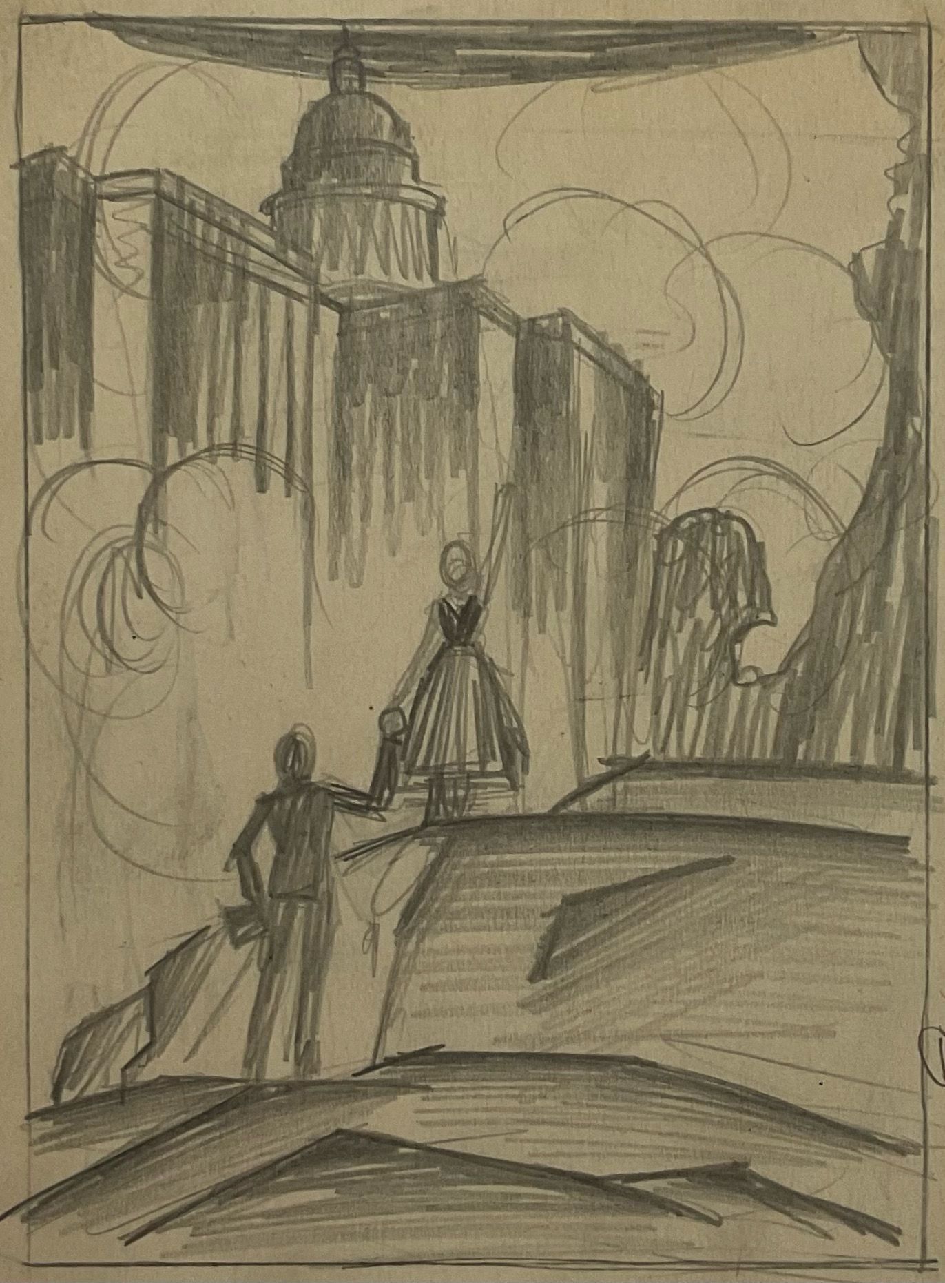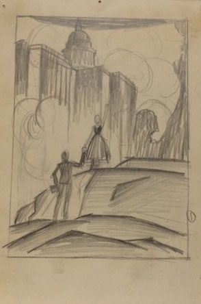 Preliminary and composite sketch for "Biography of Abraham Lincoln in Woodcuts". Image of man and woman climbing up mountain in the background there is the capitol building. Printed in the United States at Chicago 1933 during 'A Century of Progress Exposition'"Collection